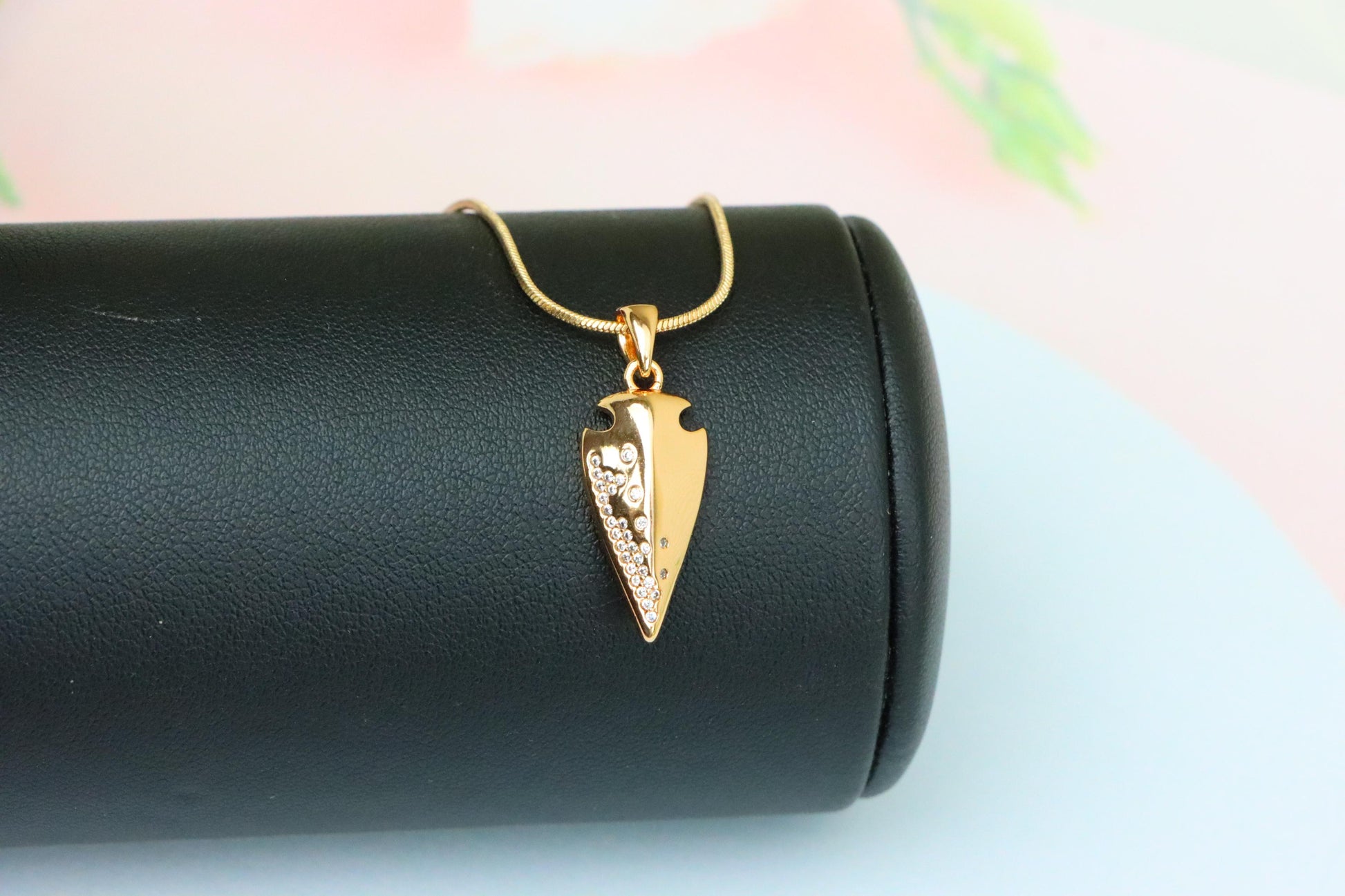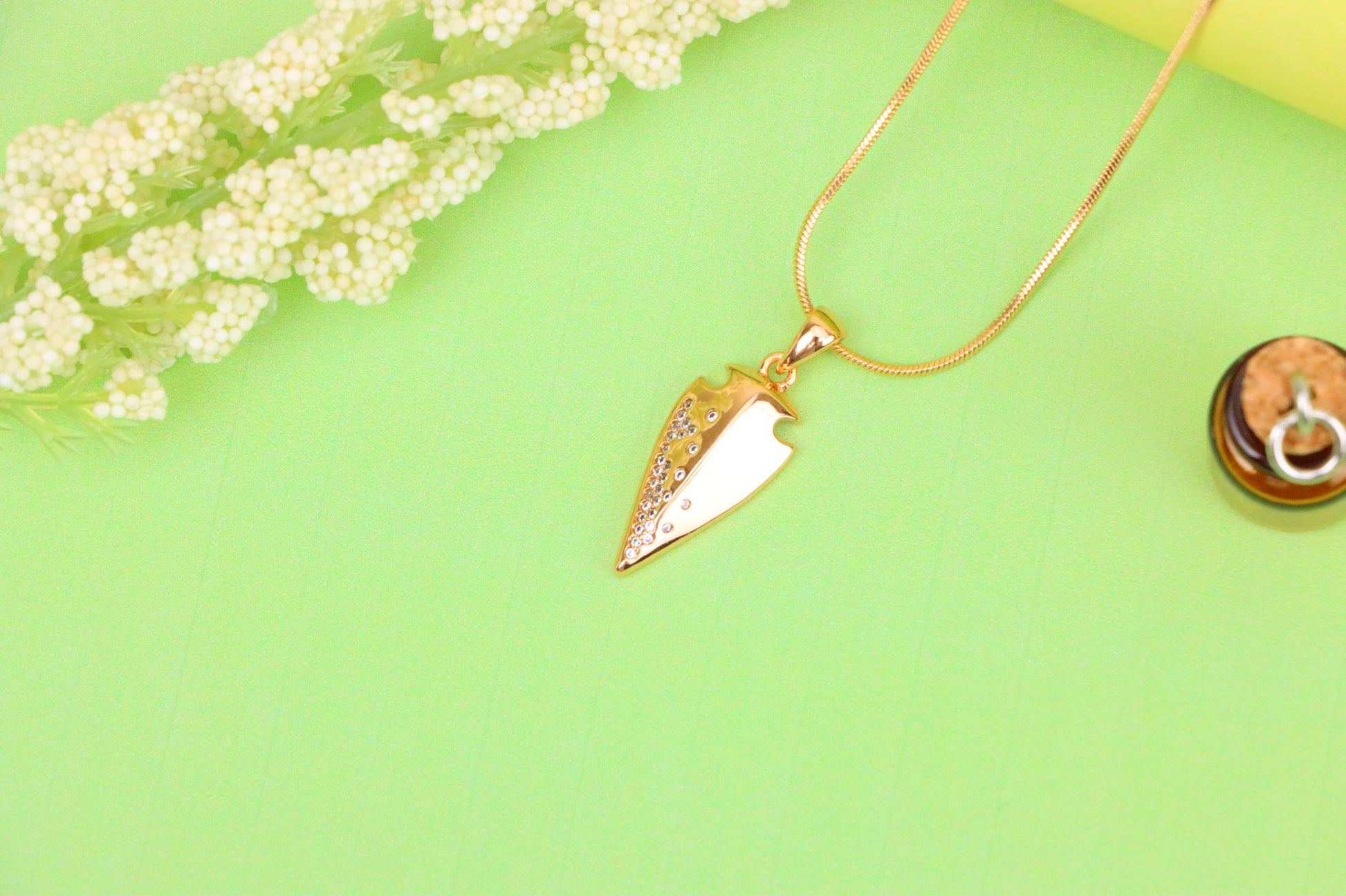 This sleek arrowhead pendant features a modern design accented with clear crystals for subtle shine. Its sharp silhouette and rose gold finish make it a bold, stylish piece.