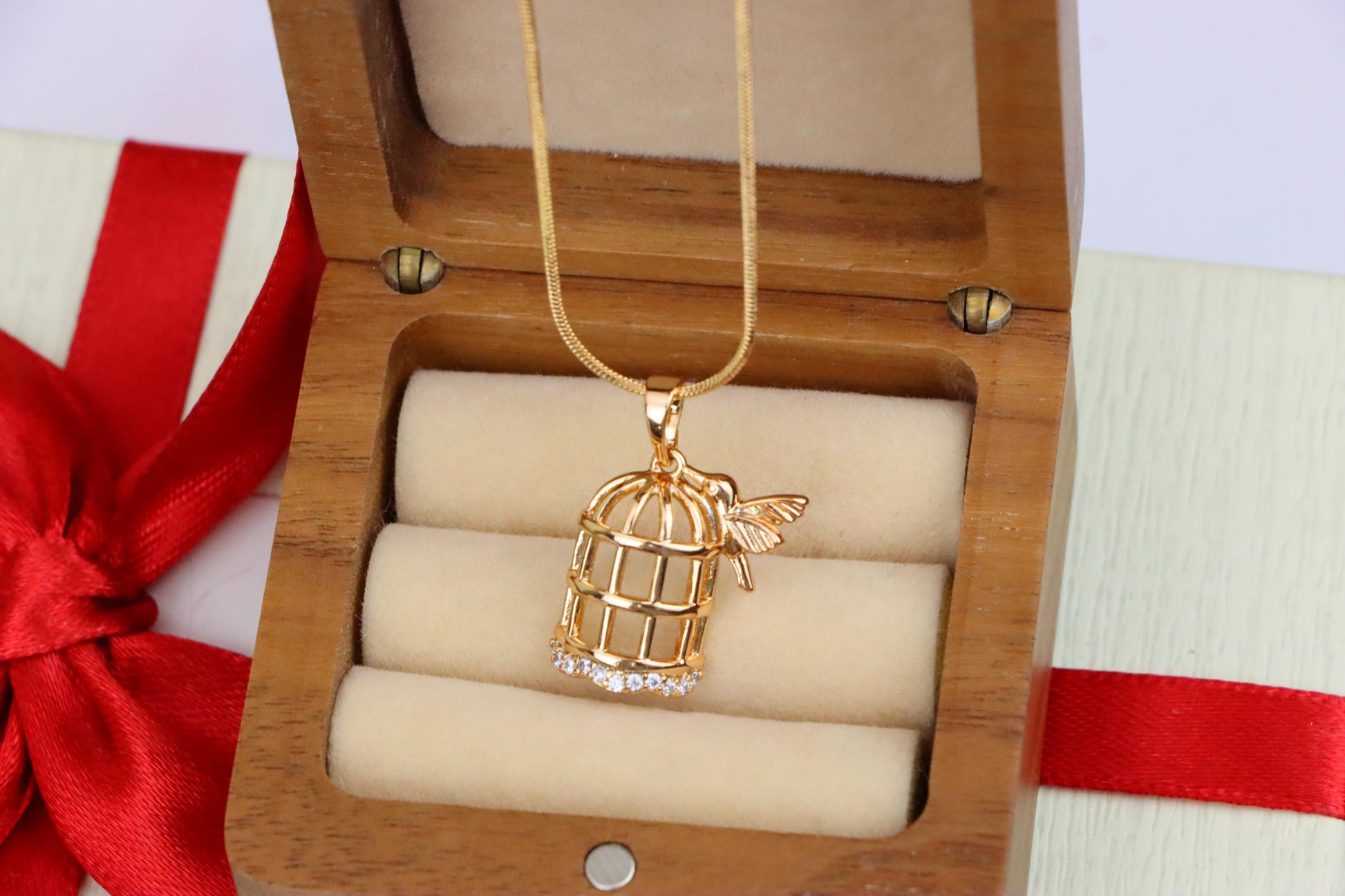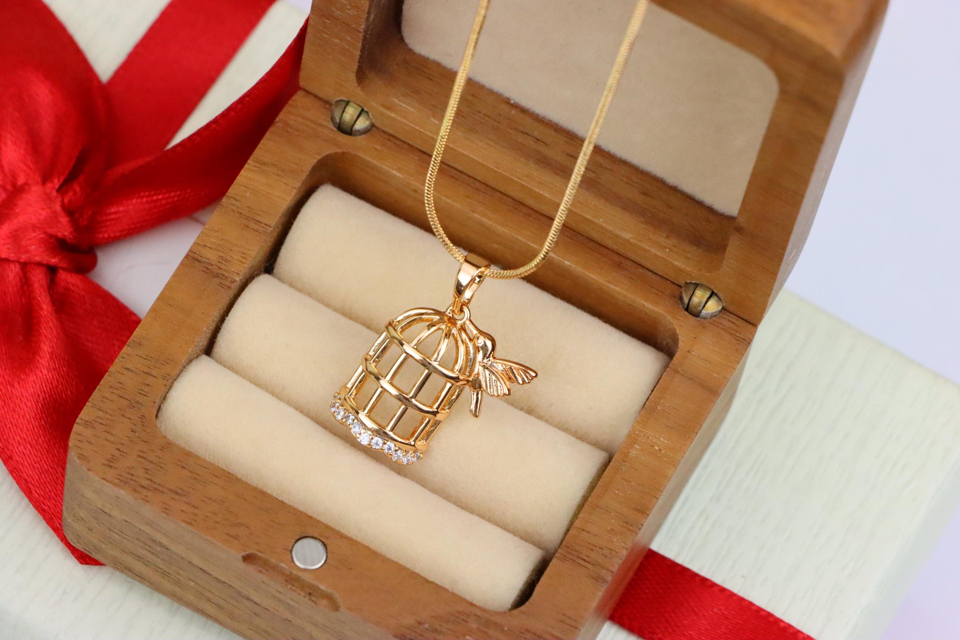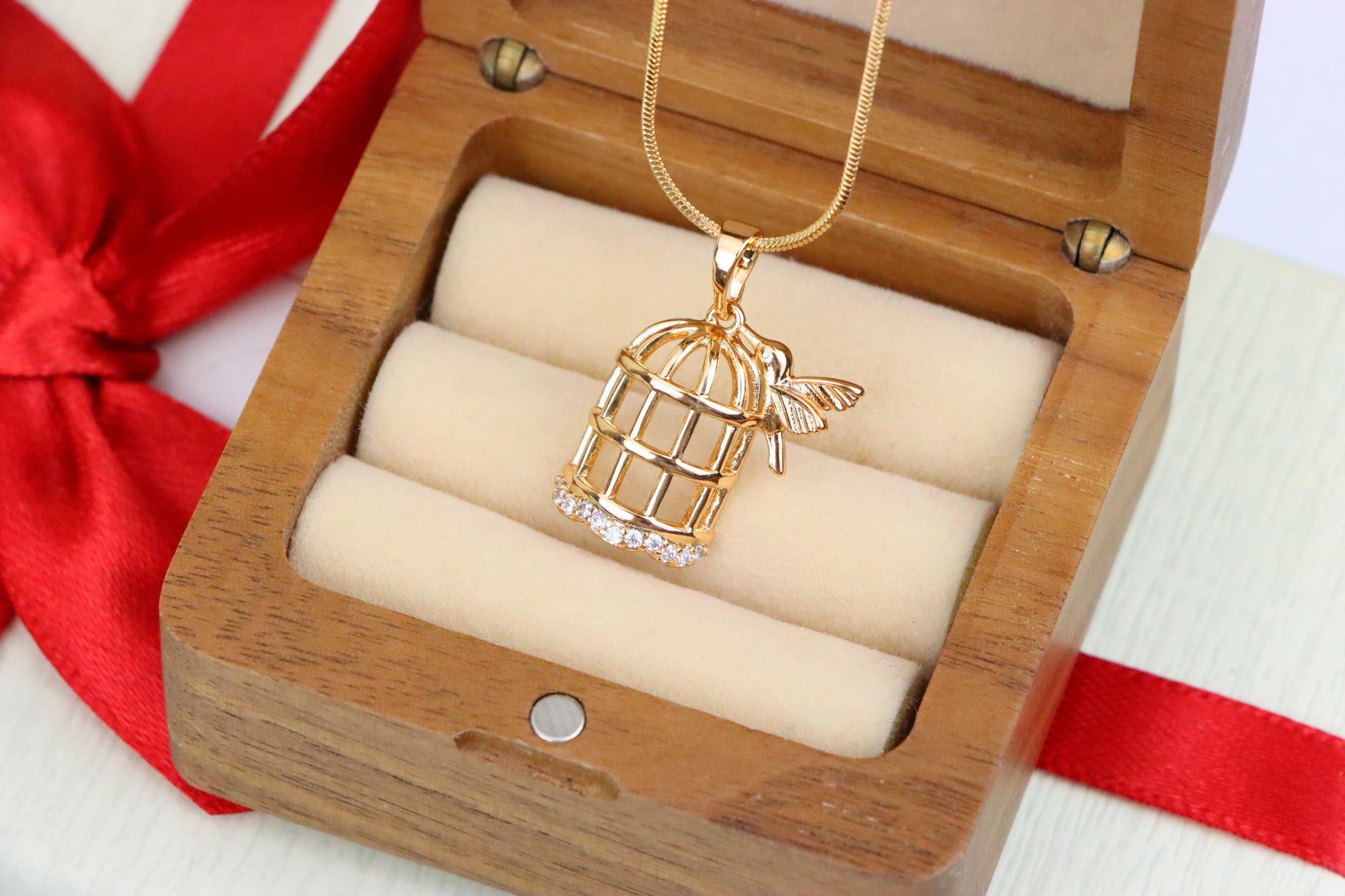 This enchanting pendant showcases a delicate birdcage design with a tiny bird perched beside it, accented by sparkling crystals. A whimsical and elegant accessory.