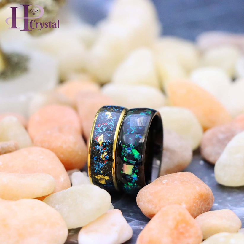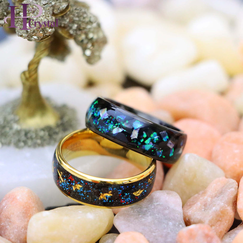 The black IP-plated tungsten provides a sleek, modern finish, while the blue-green synthetic opal and abalone shell inlay add a mesmerizing, iridescent glow. Accented with gold foil inlay, each ring is uniquely designed, ensuring no two are exactly alike. Whether worn as a men’s statement ring, anniversary band, or unique wedding band, this piece offers both elegance and durability.
