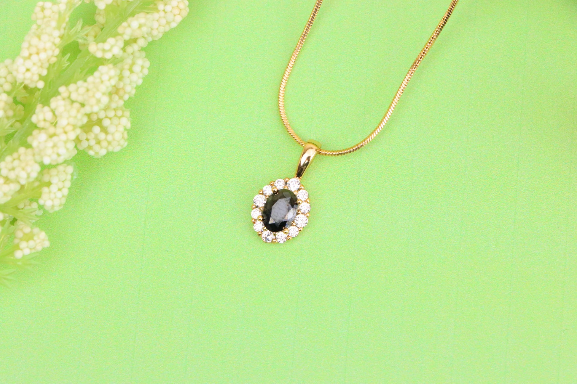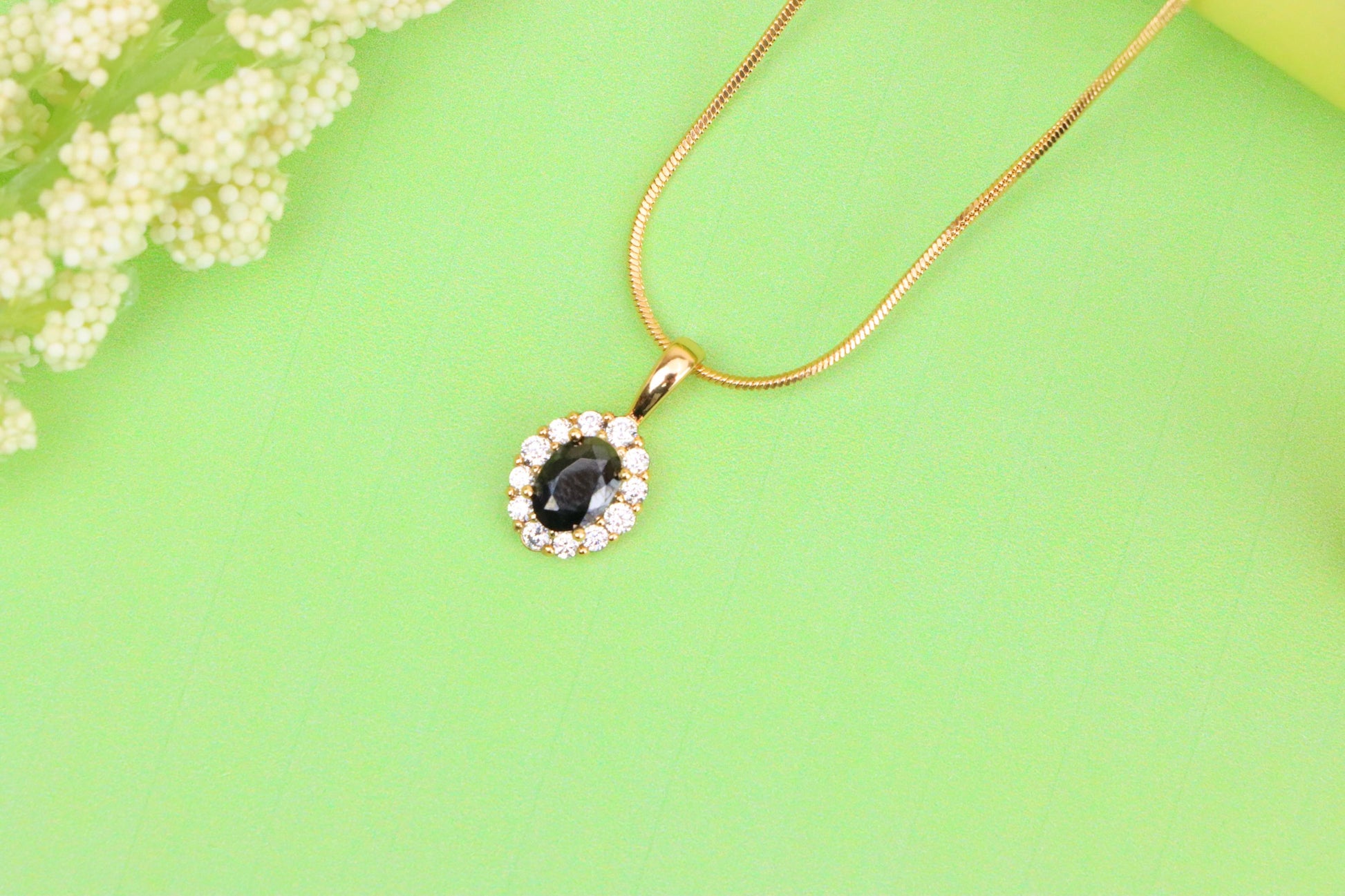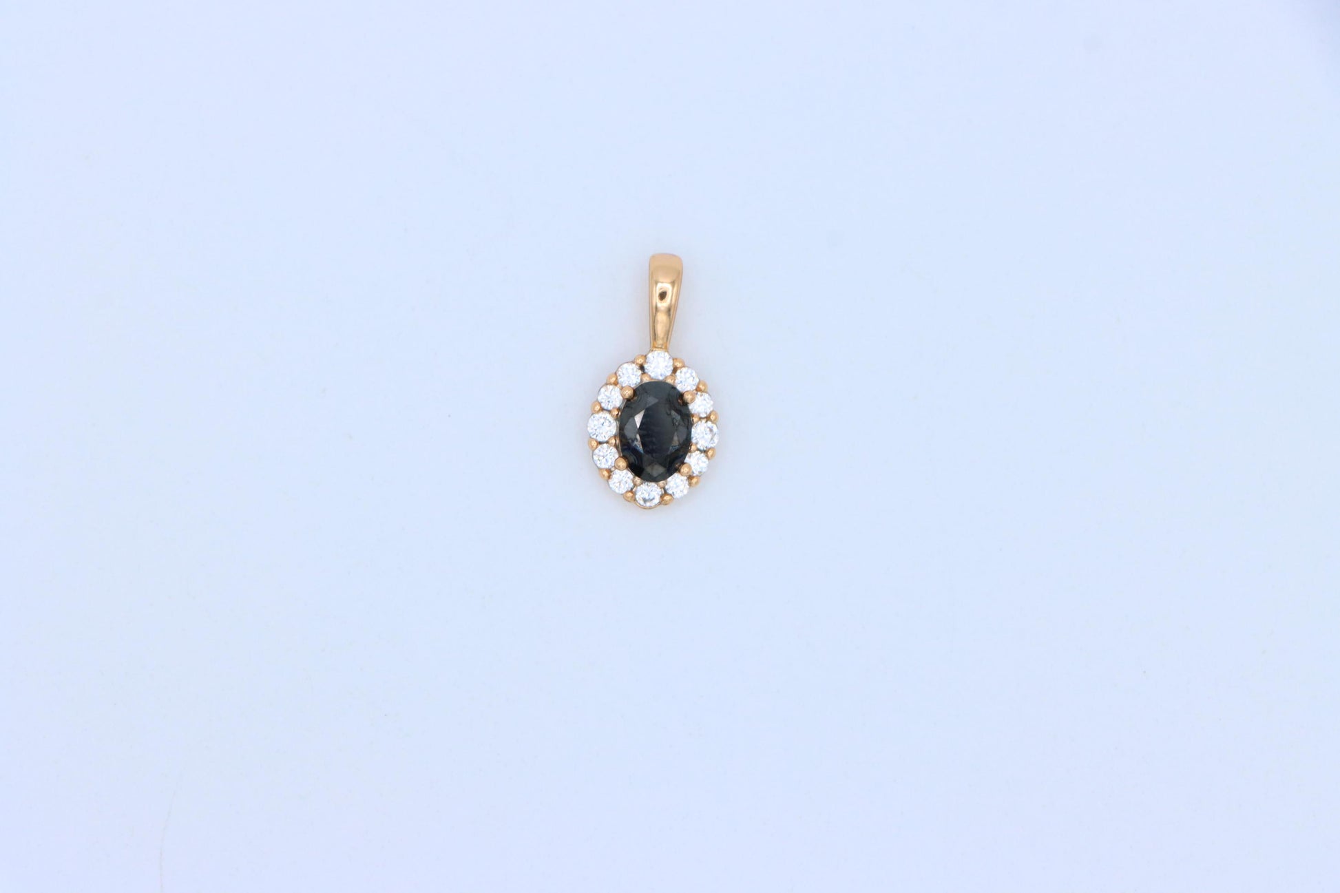 Black Oval Pendant with Sparkling Halo in Gold-Plated Brass Setting, XPPT1814