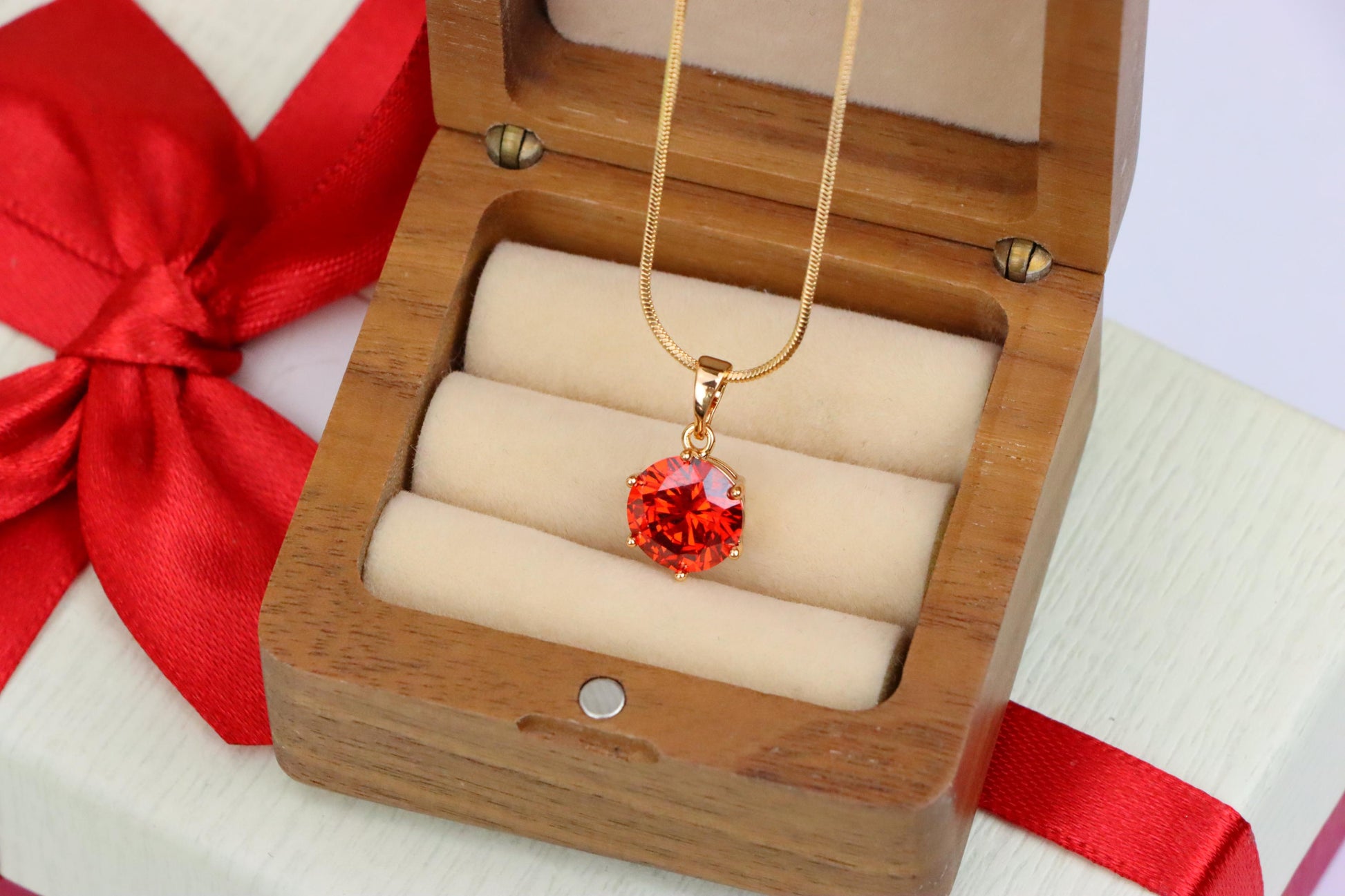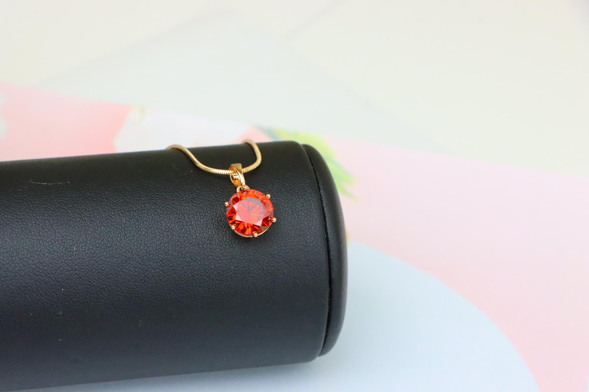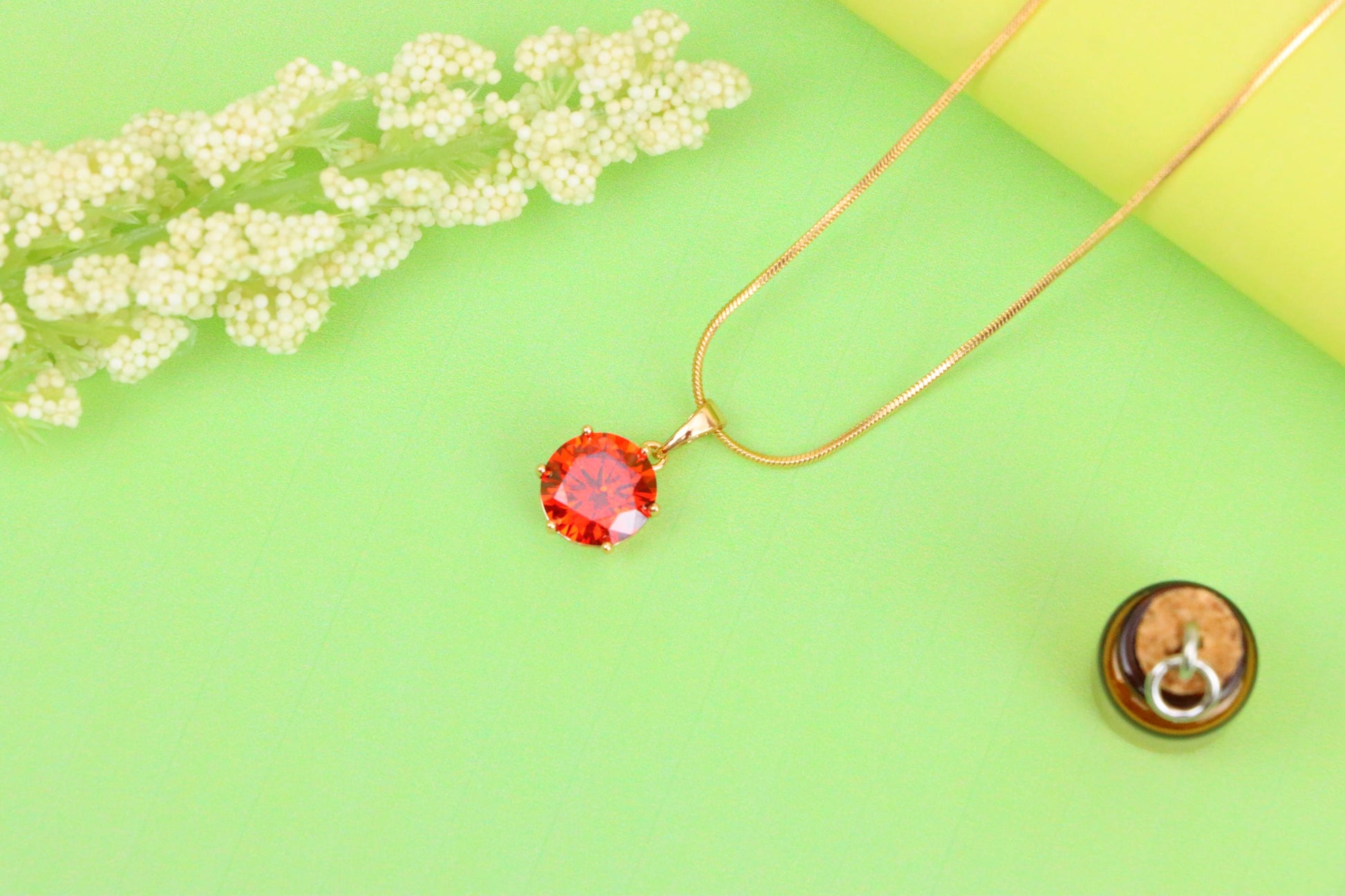 A striking round pendant with a fiery red stone, set in rose gold finish—perfect to elevate any outfit.