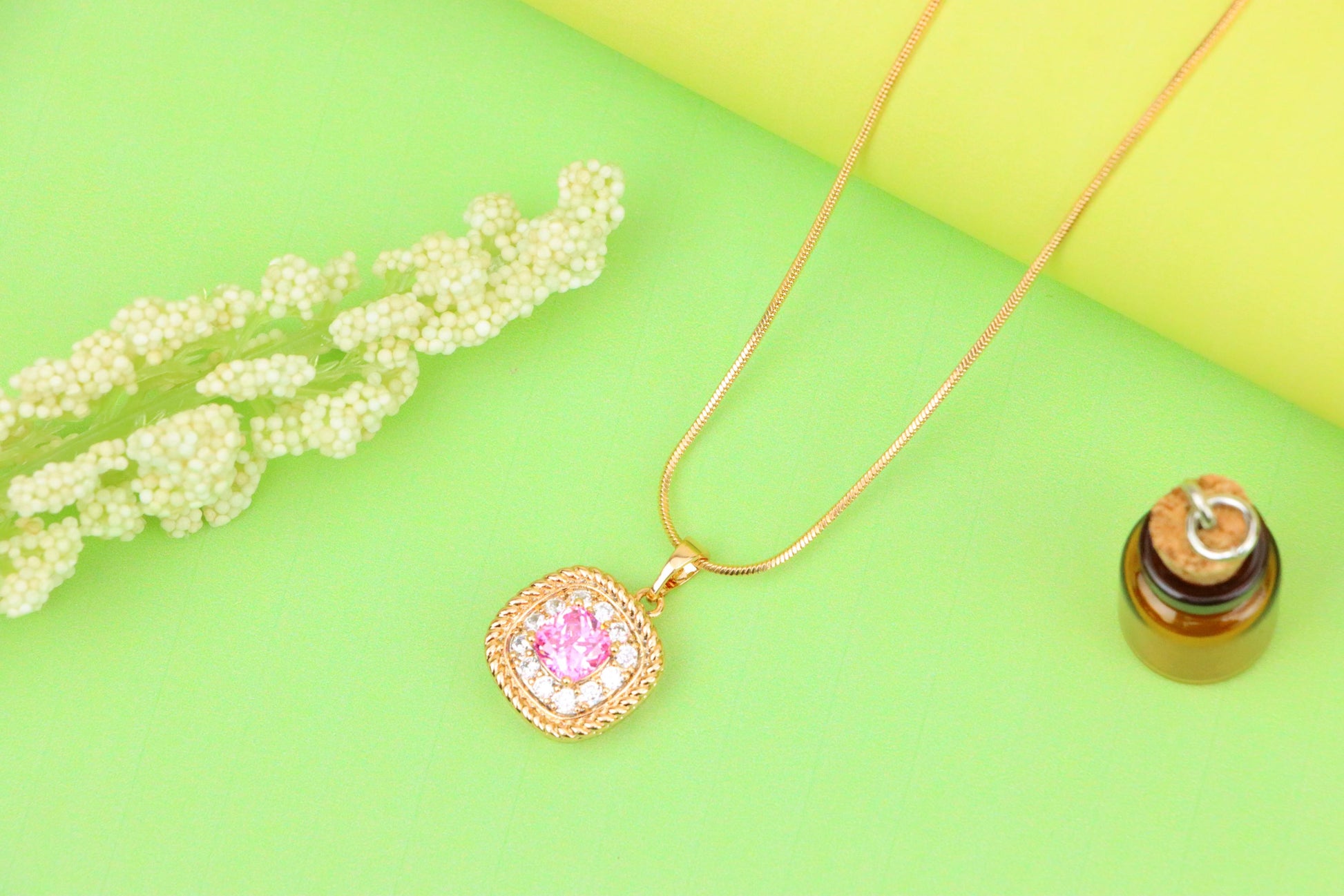 Delicate and radiant, this pink pendant adds a soft glamour to your style.