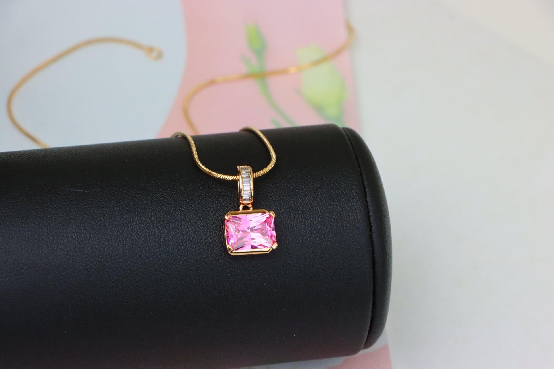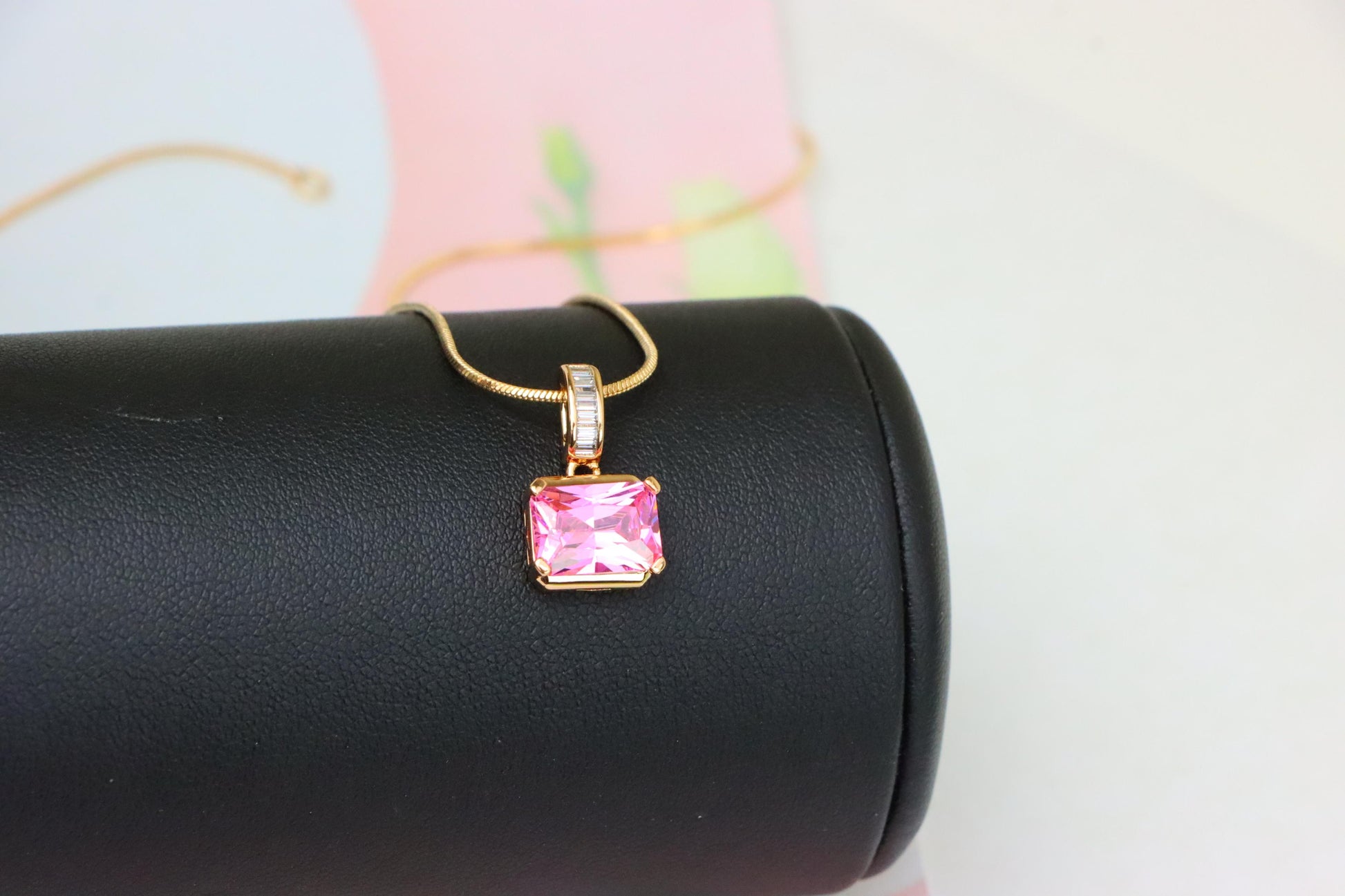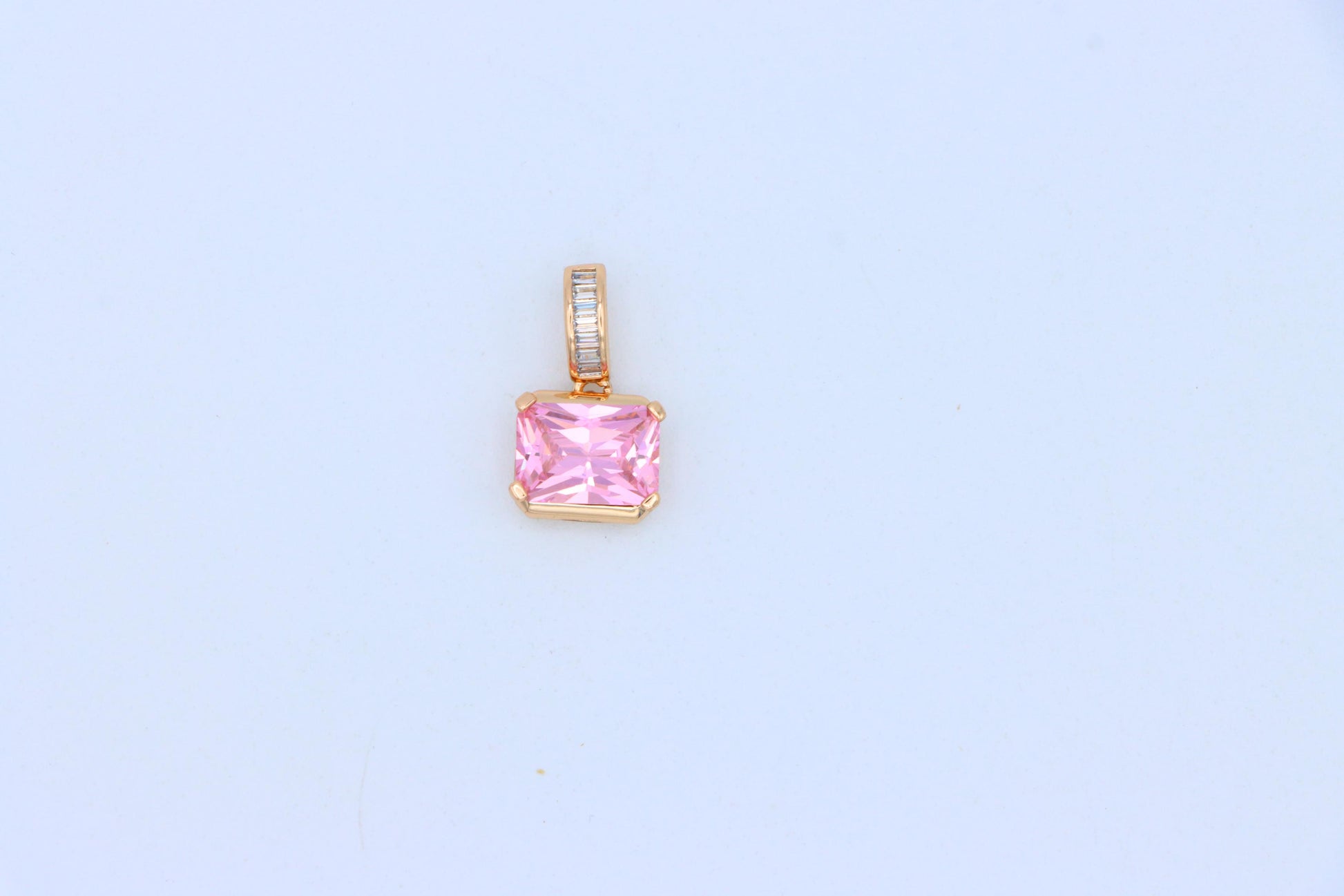This elegant pink pendant features a radiant emerald cut stone with a sparkling baguette-accented bail, designed to elevate any outfit with a feminine touch.