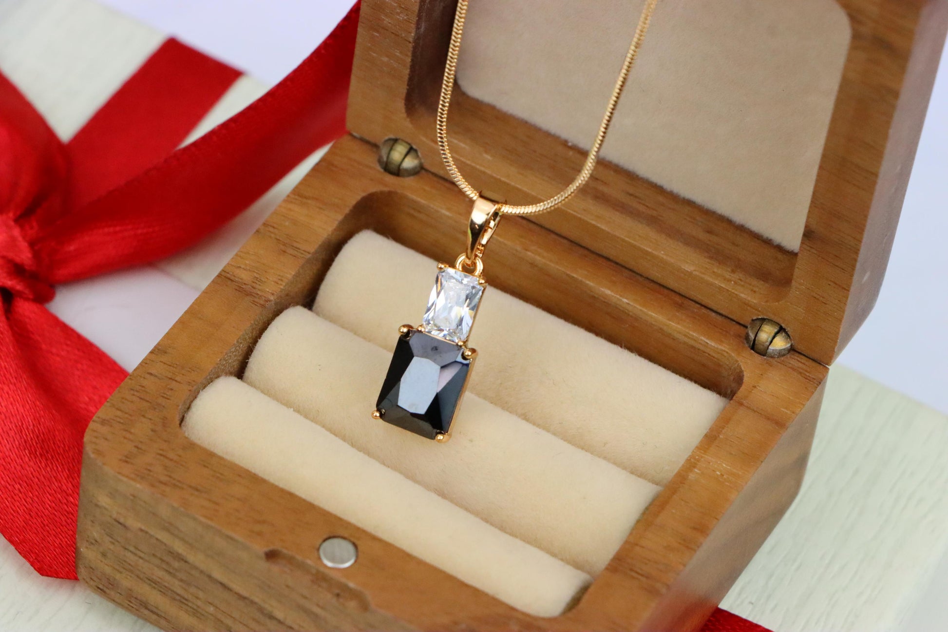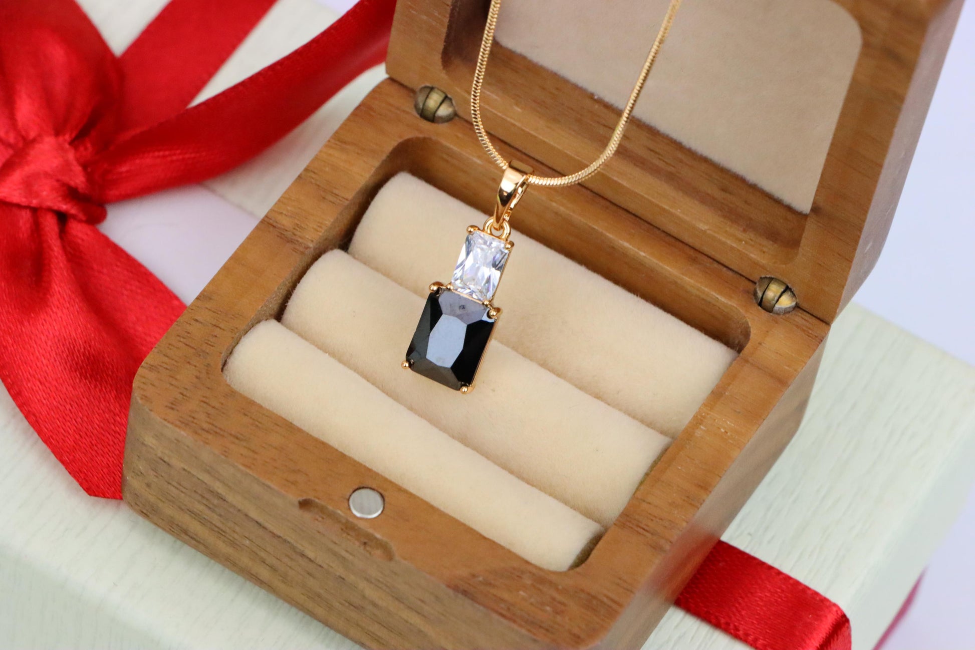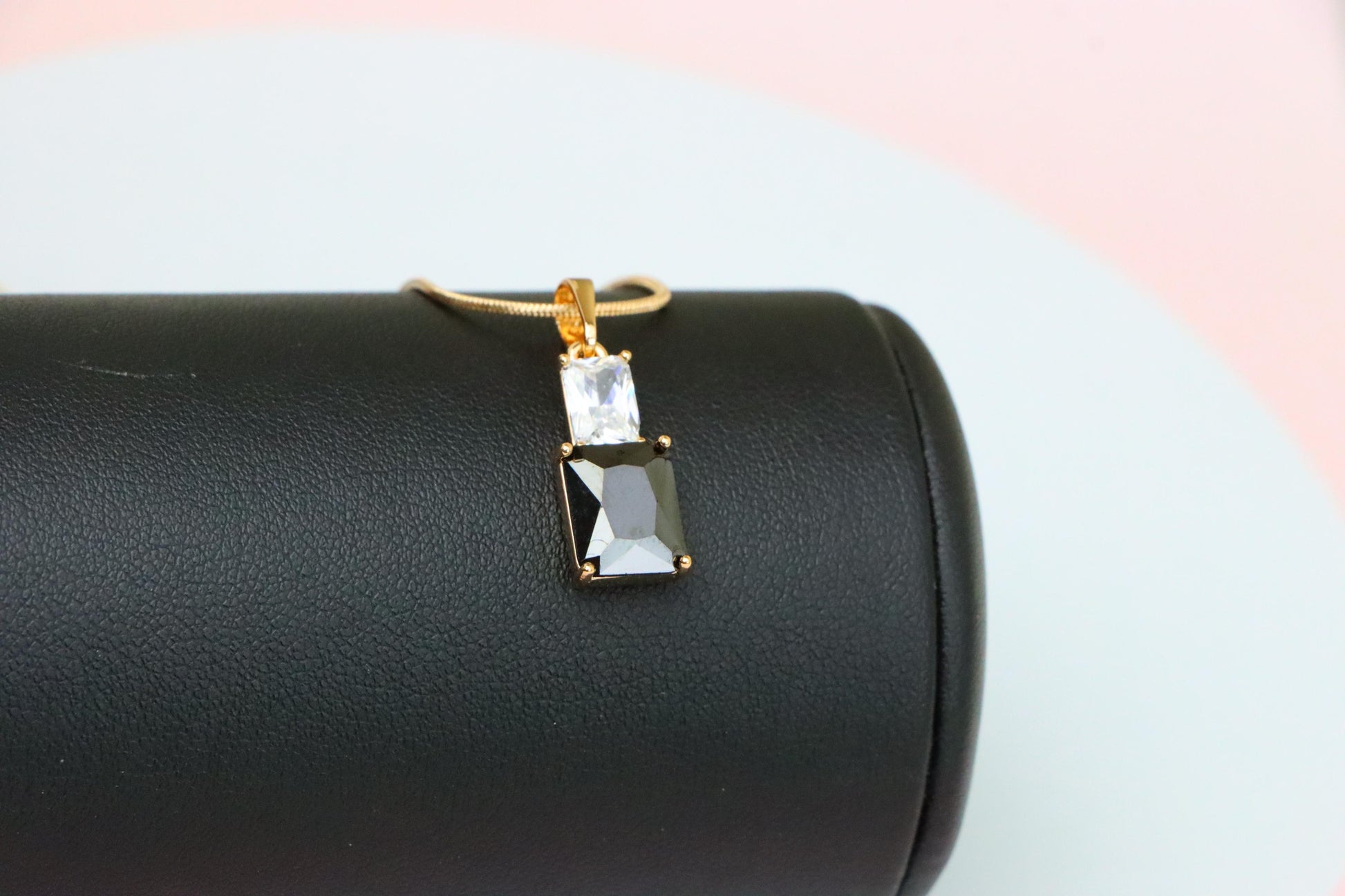 Add a touch of elegance to your look with this striking black pendant, crafted with a dual-stone design and luxurious gold plating over high-quality brass.