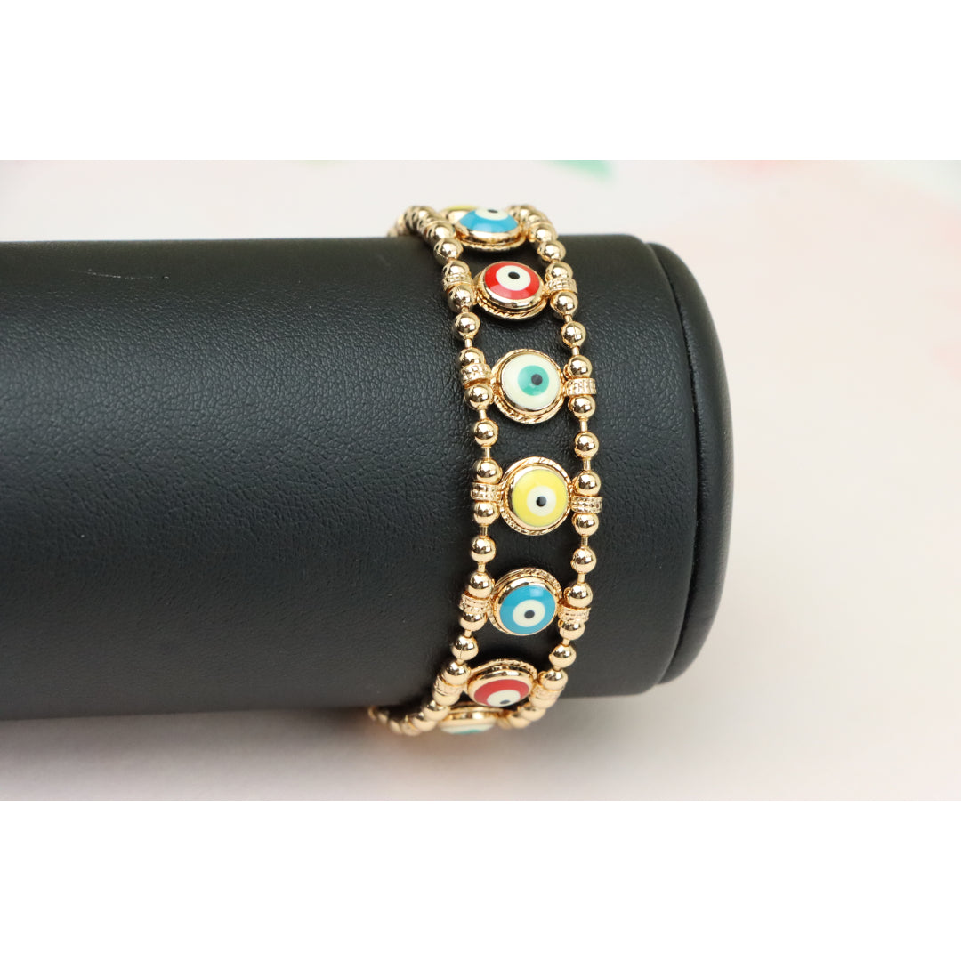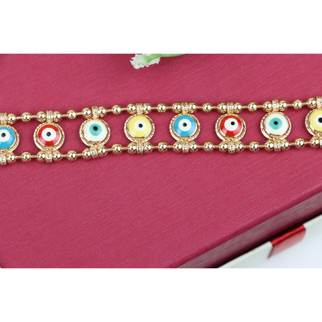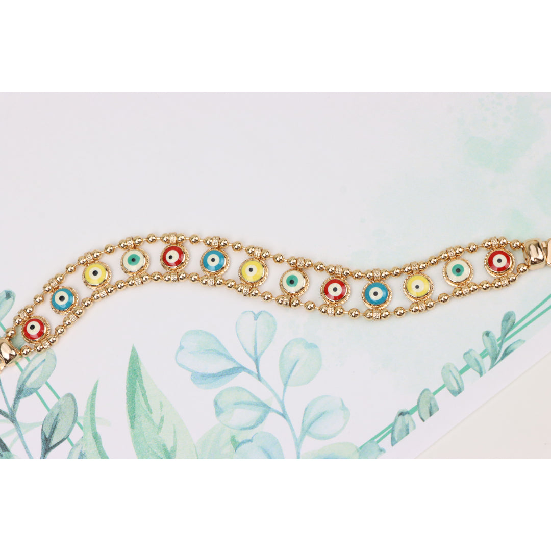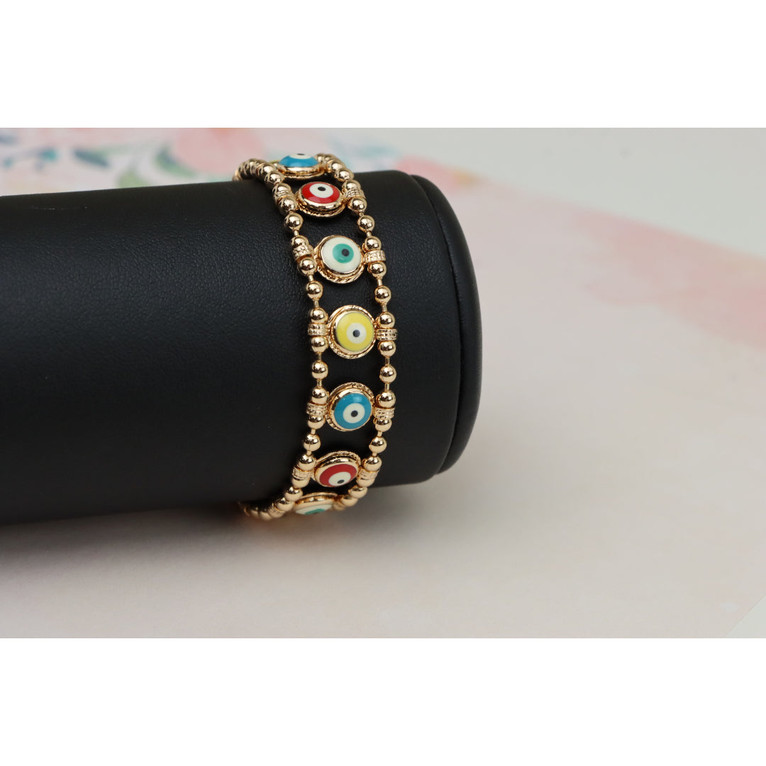 Playful and stylish bracelet adorned with multicolor evil eye charms, crafted with a rose gold finish for both elegance and protection.
