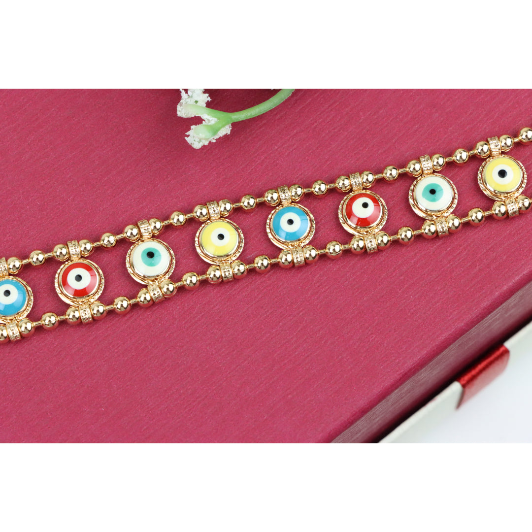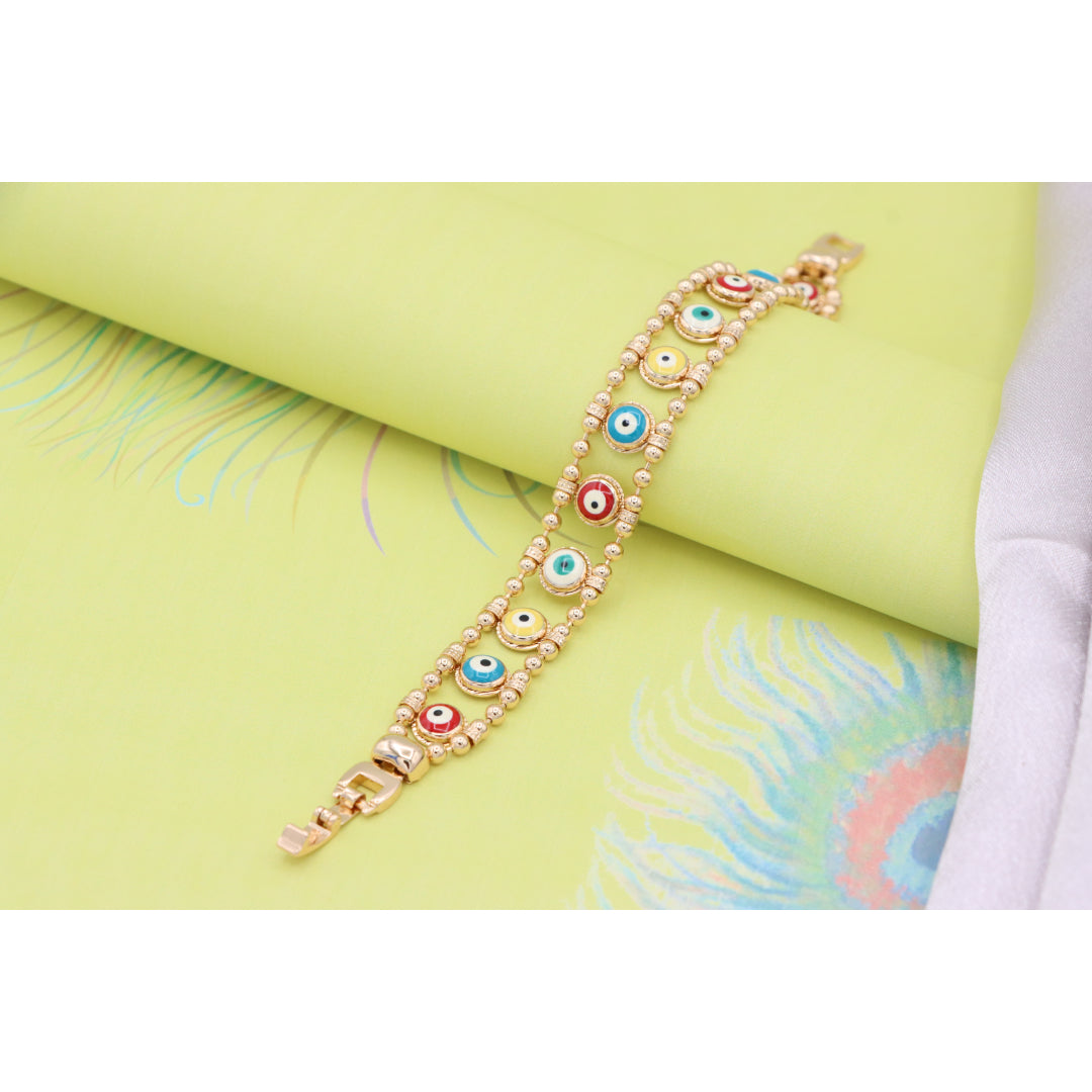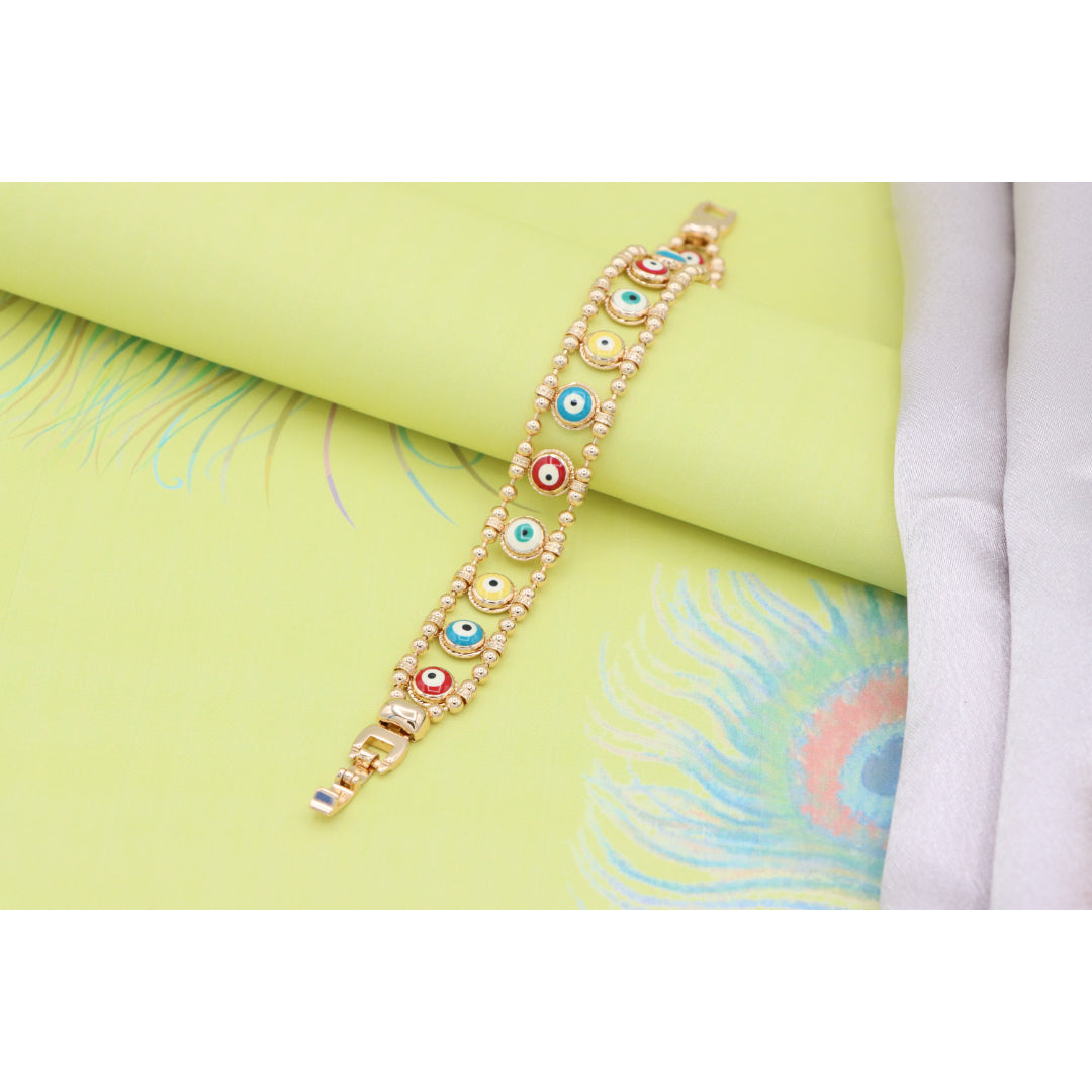 Playful and stylish bracelet adorned with multicolor evil eye charms, crafted with a rose gold finish for both elegance and protection.