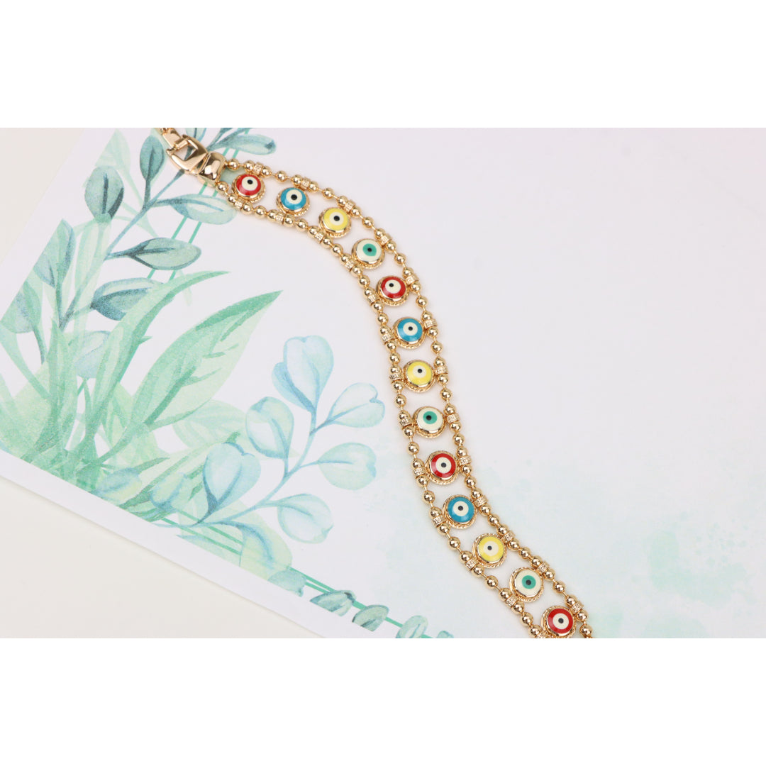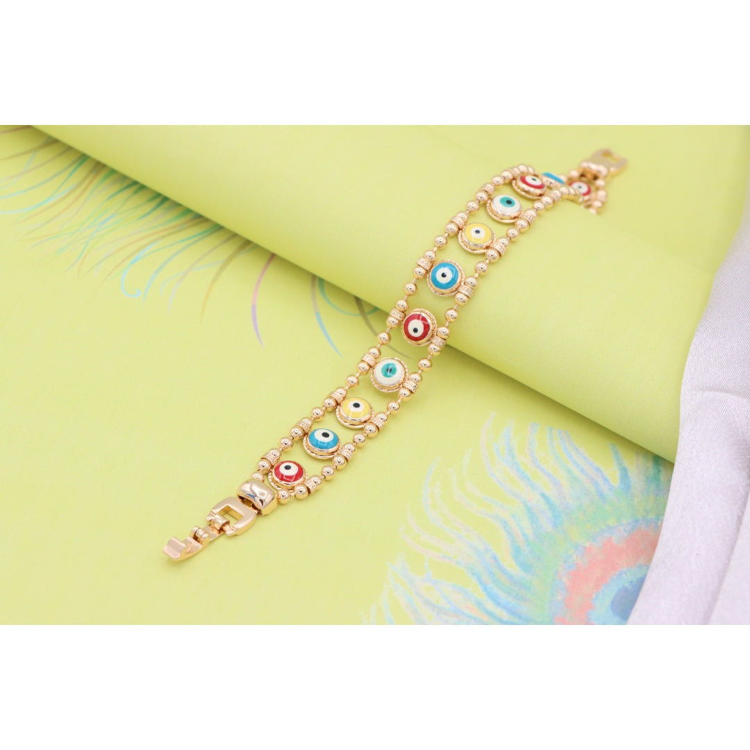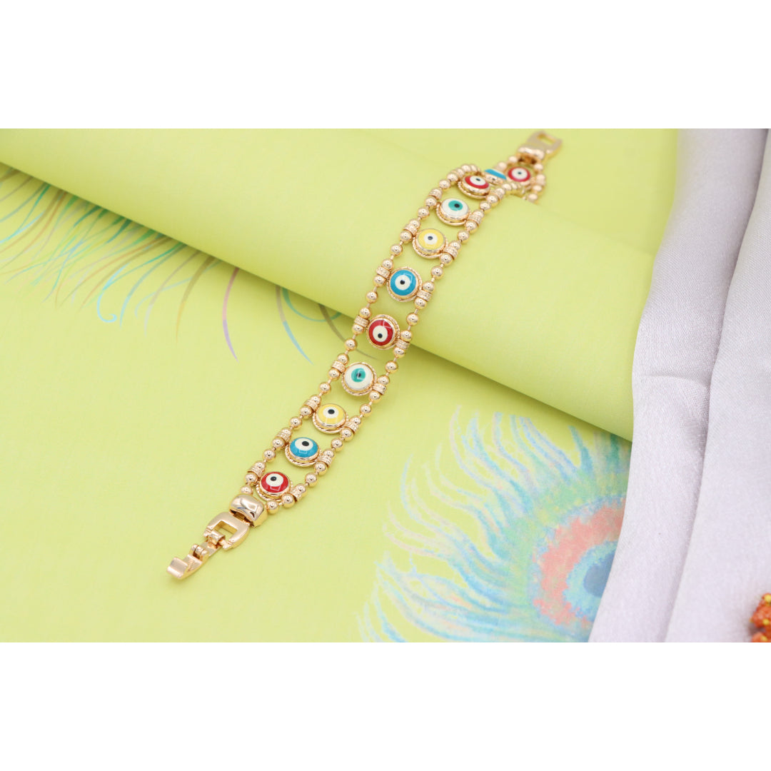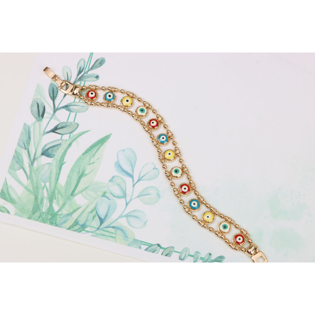 Playful and stylish bracelet adorned with multicolor evil eye charms, crafted with a rose gold finish for both elegance and protection.