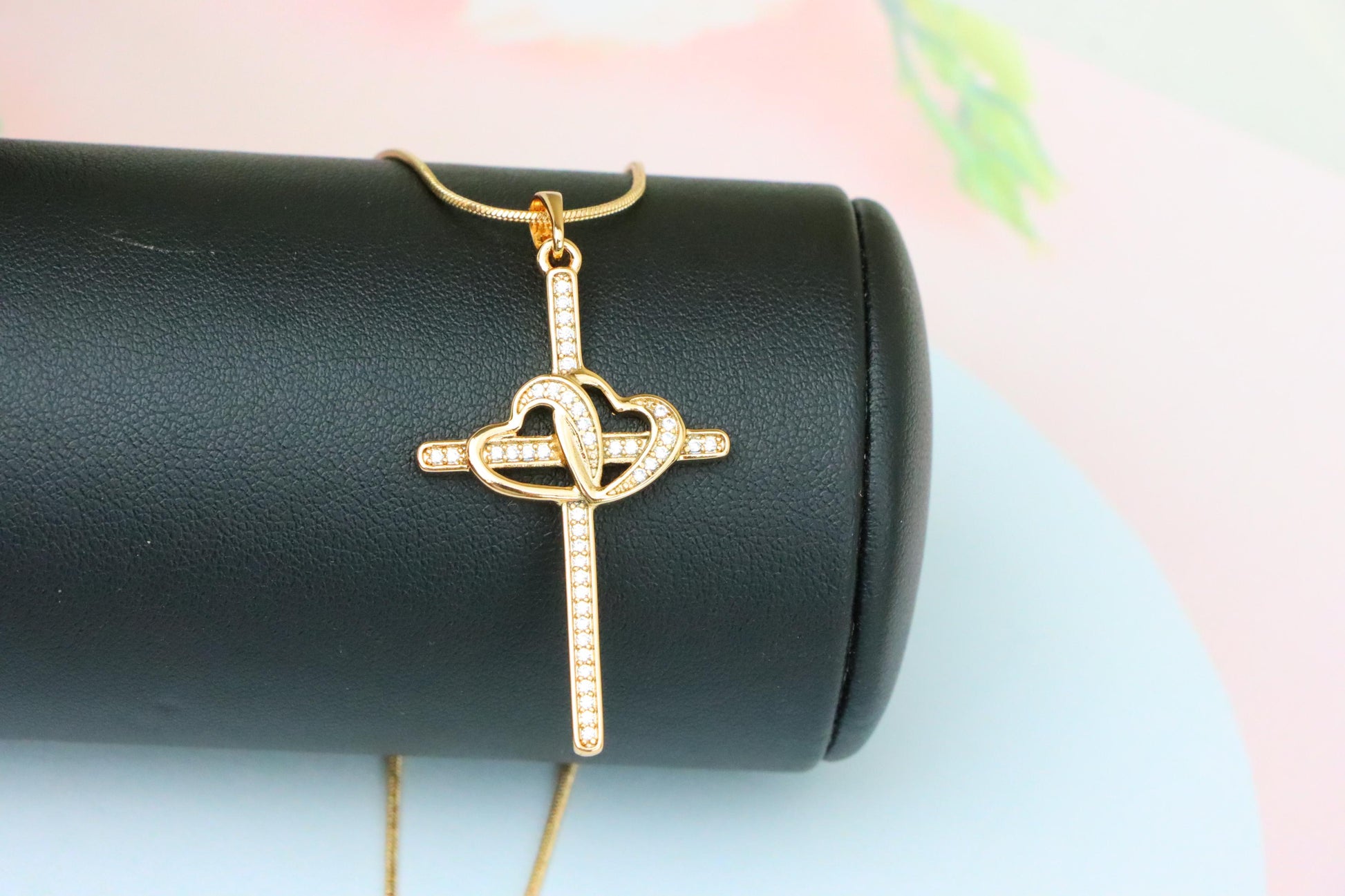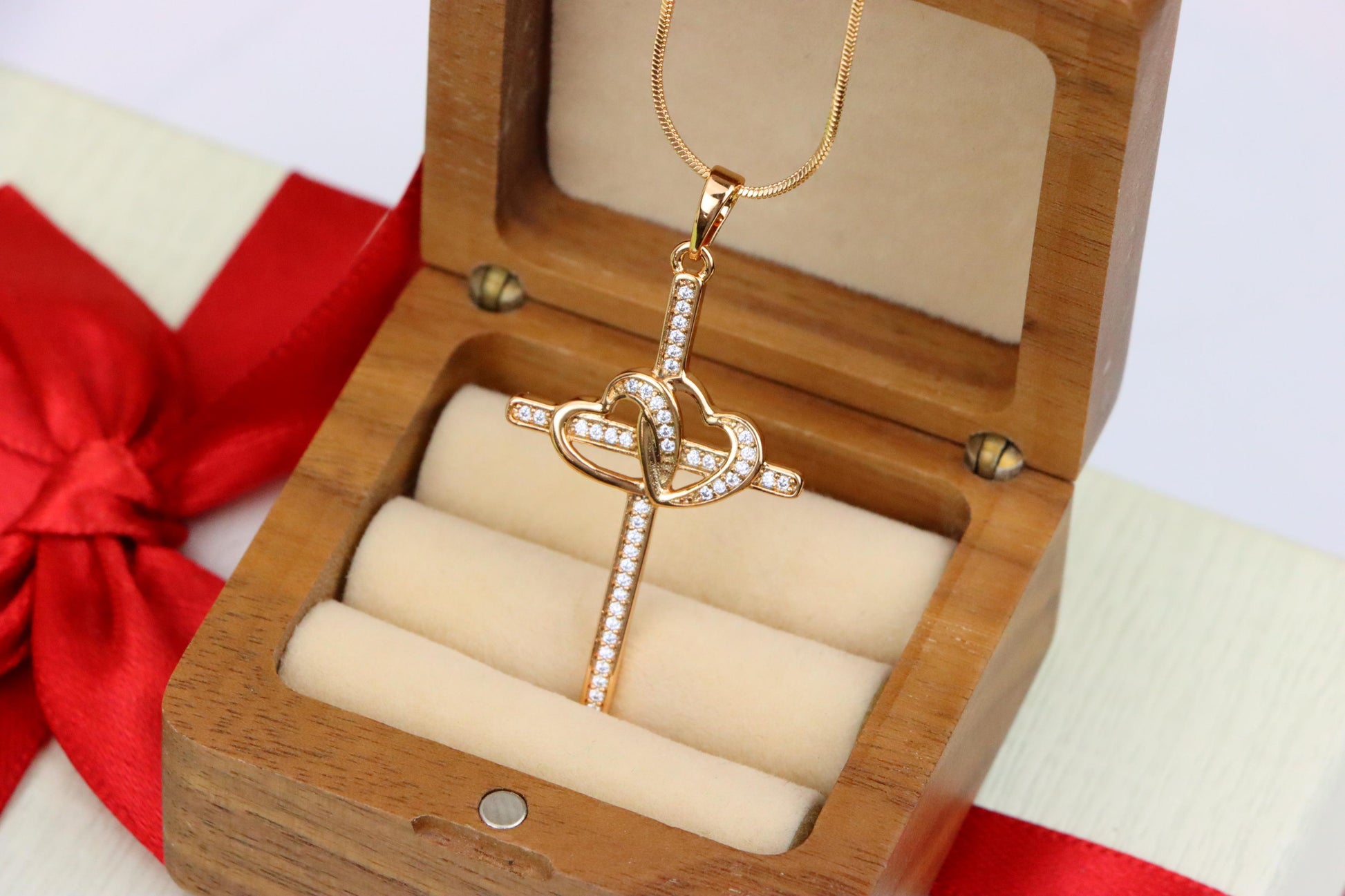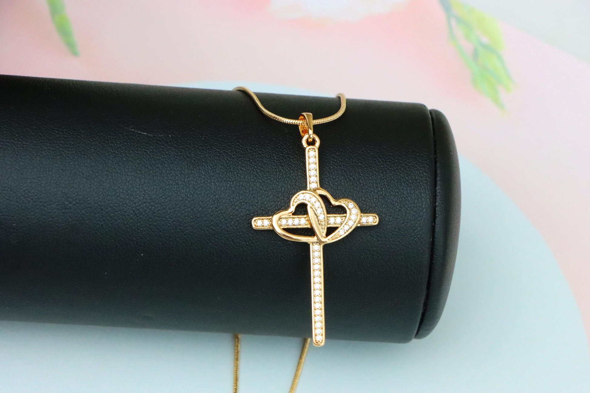 A beautiful expression of faith and love, this rose gold pendant features a cross adorned with sparkling crystals and two interlocked hearts at its center.