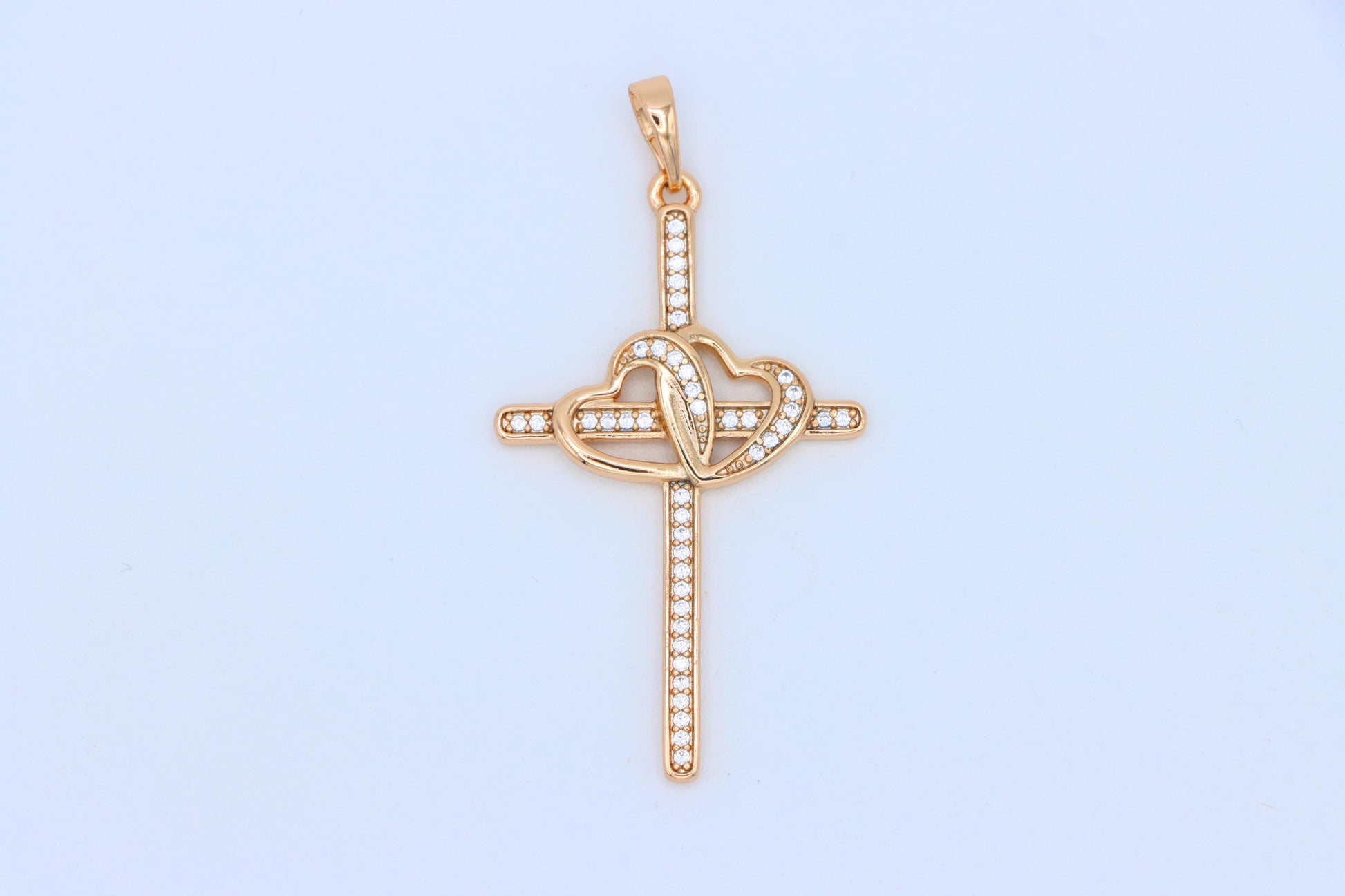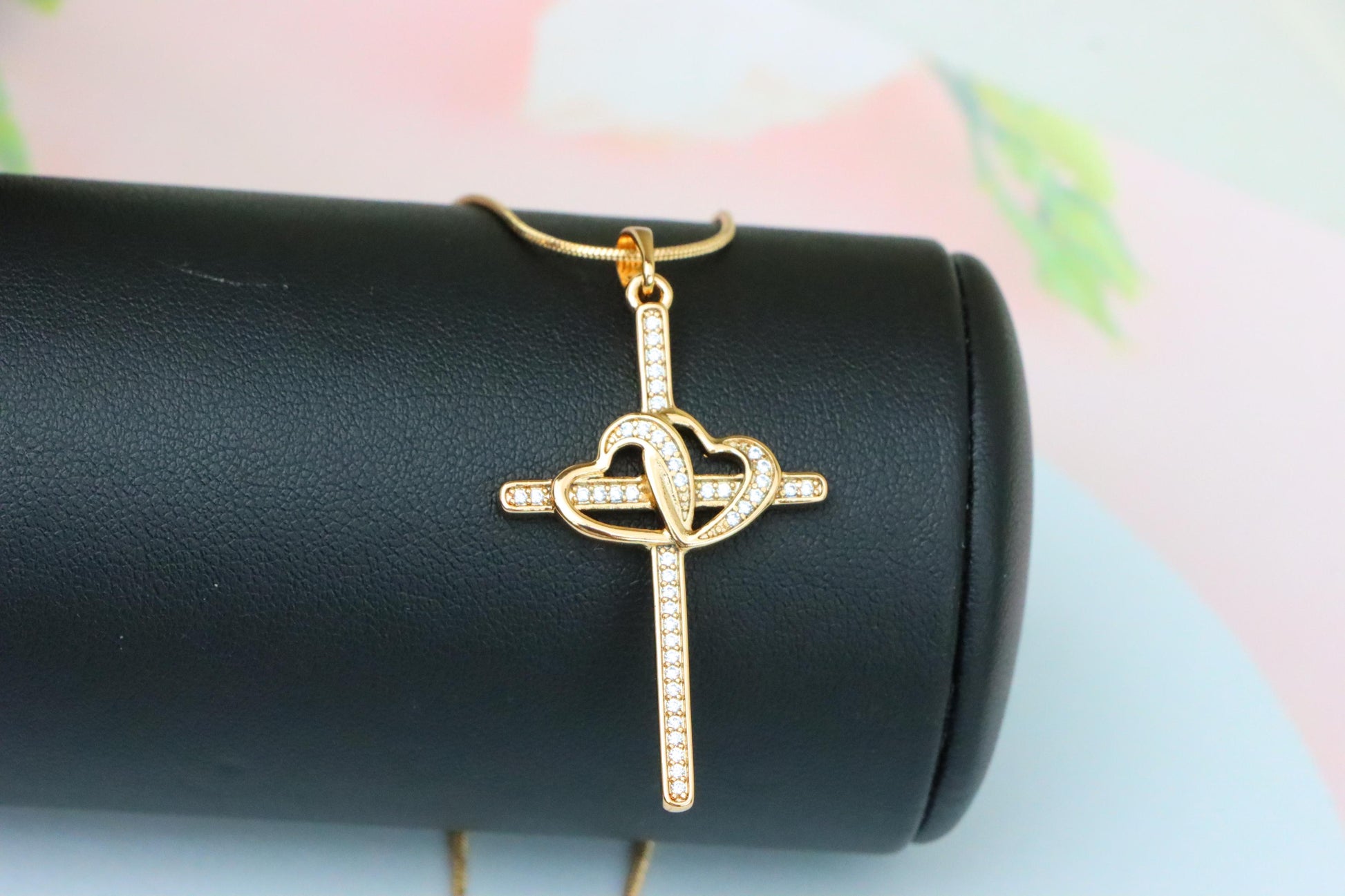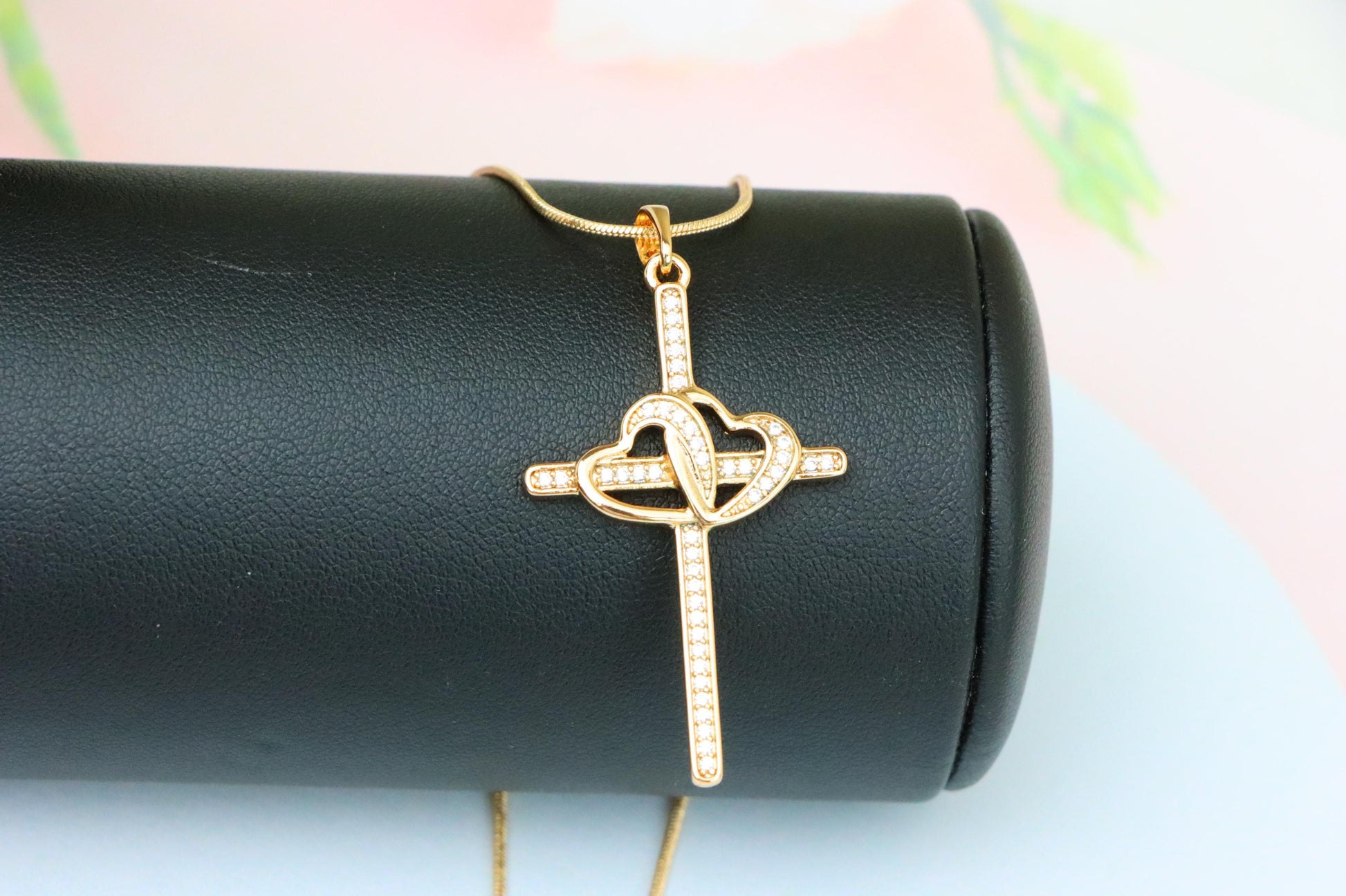A beautiful expression of faith and love, this rose gold pendant features a cross adorned with sparkling crystals and two interlocked hearts at its center.