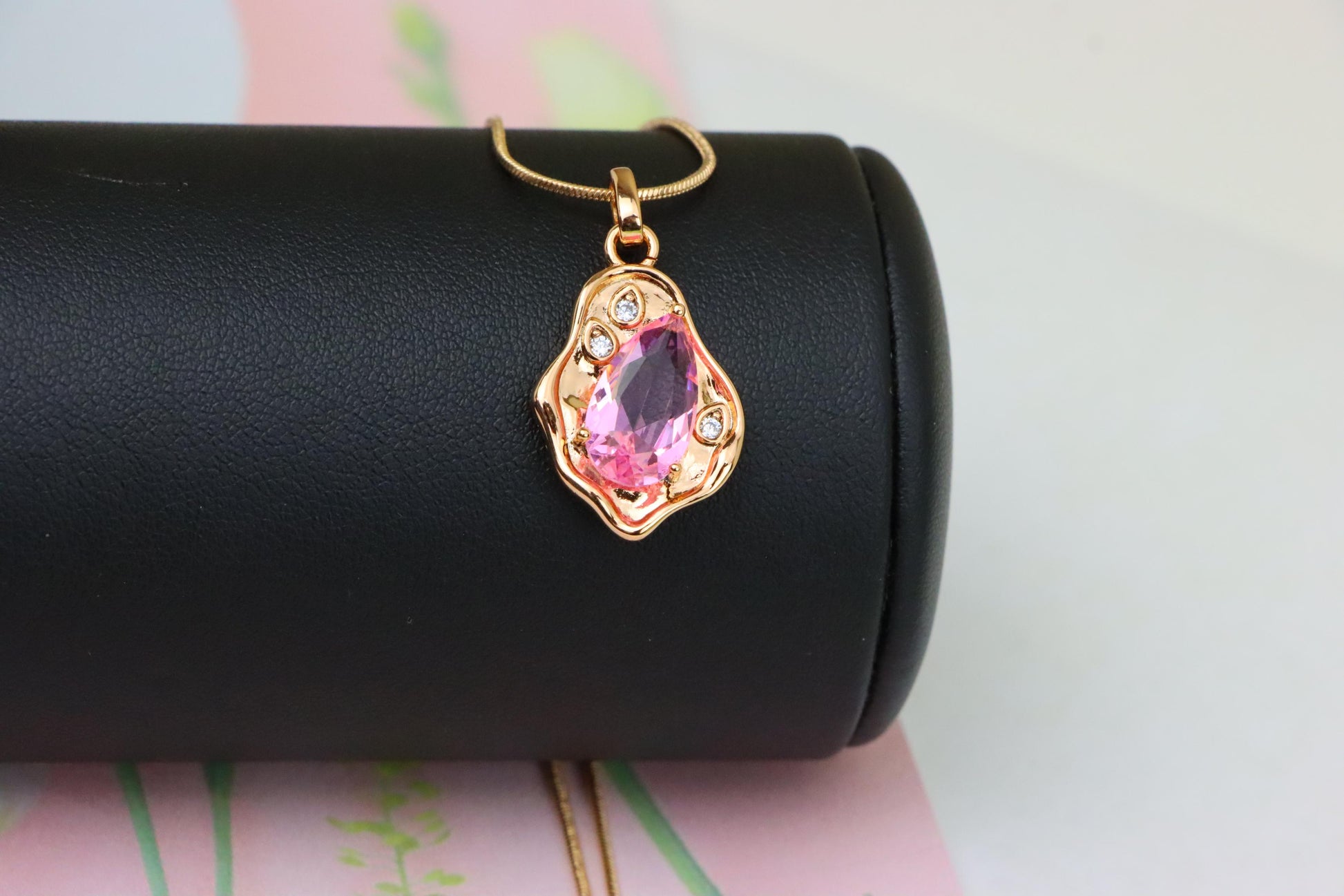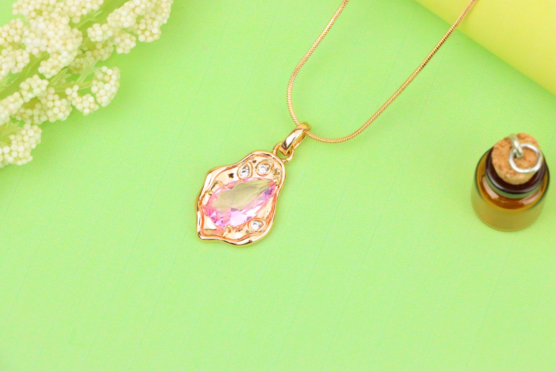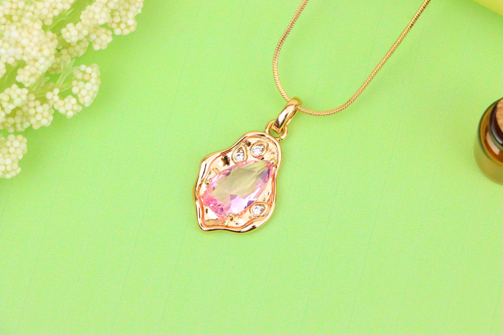 Soft pink teardrop gemstone cradled in a flowing, gold-plated frame with sparkling accents – a feminine and stylish piece for any jewelry lover.
