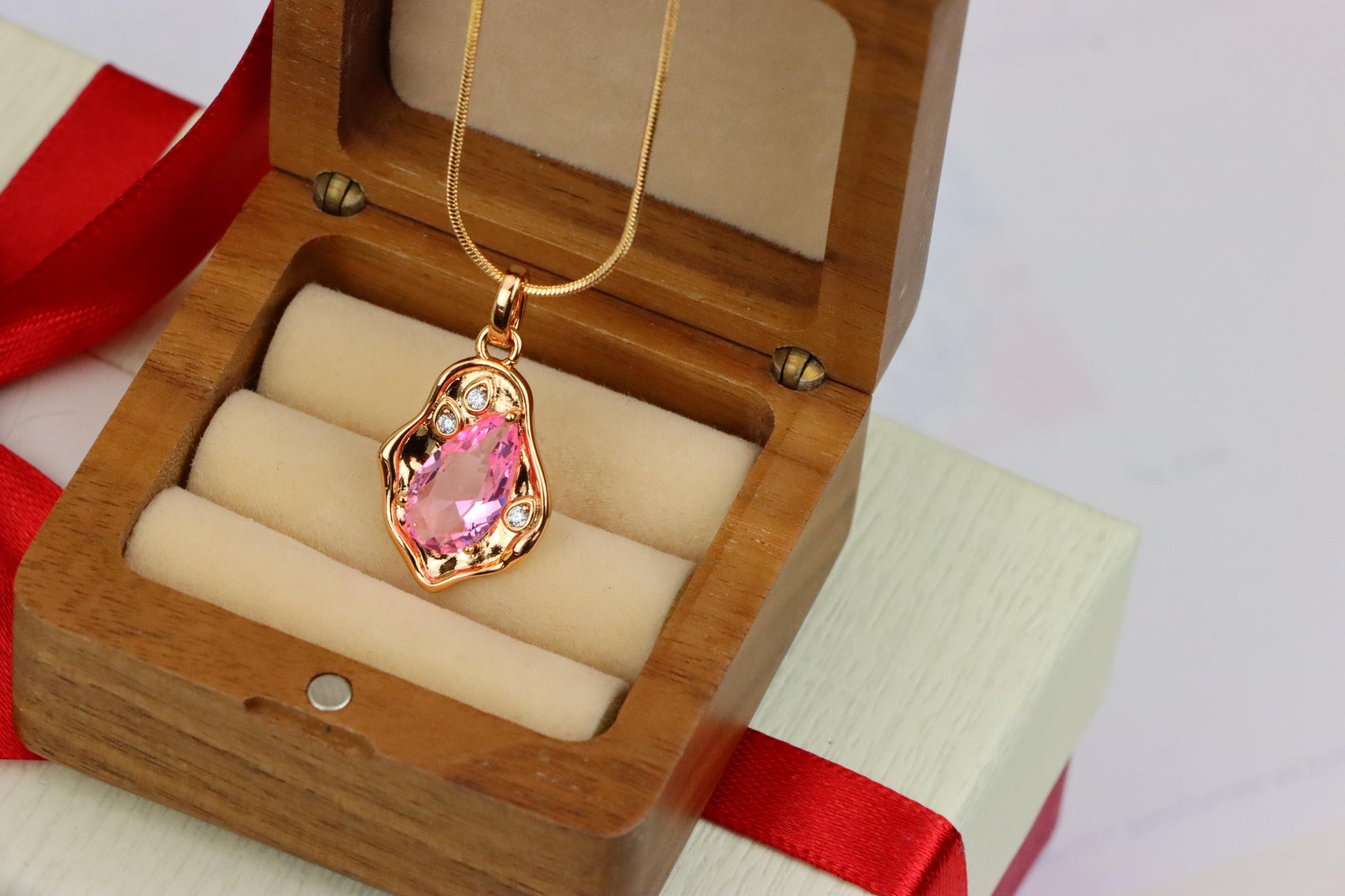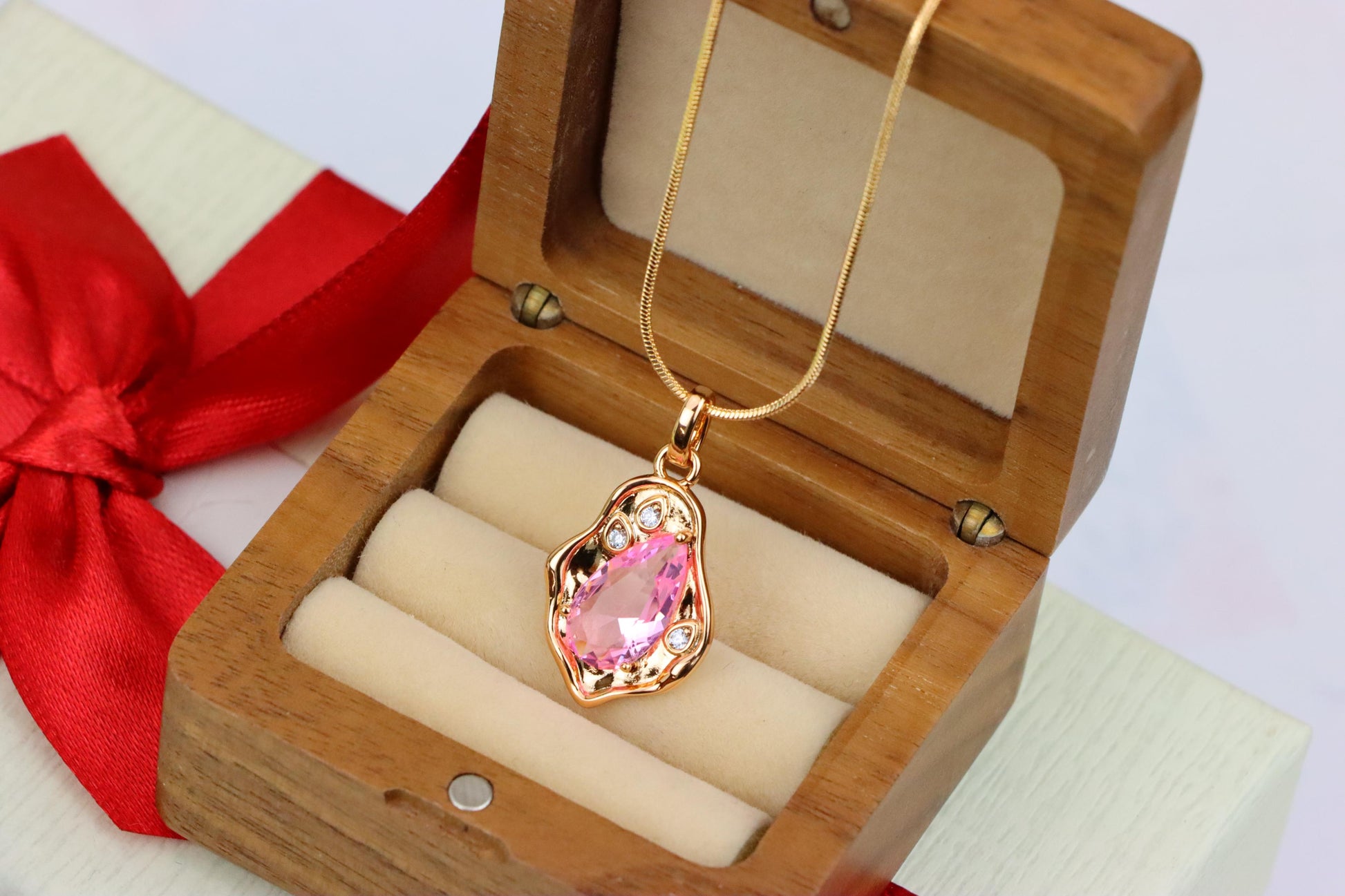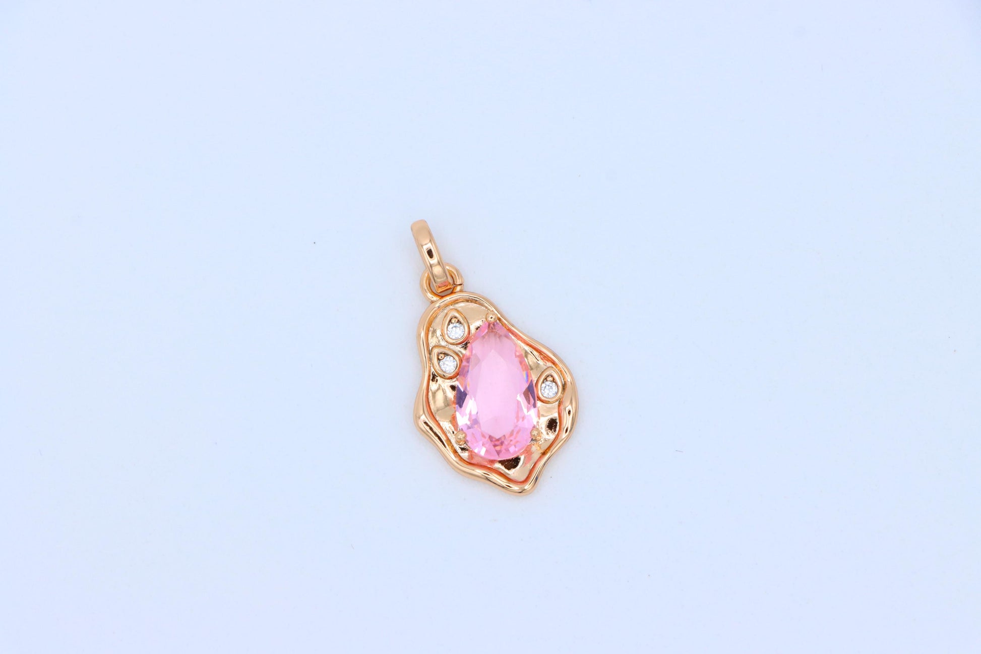Soft pink teardrop gemstone cradled in a flowing, gold-plated frame with sparkling accents – a feminine and stylish piece for any jewelry lover.