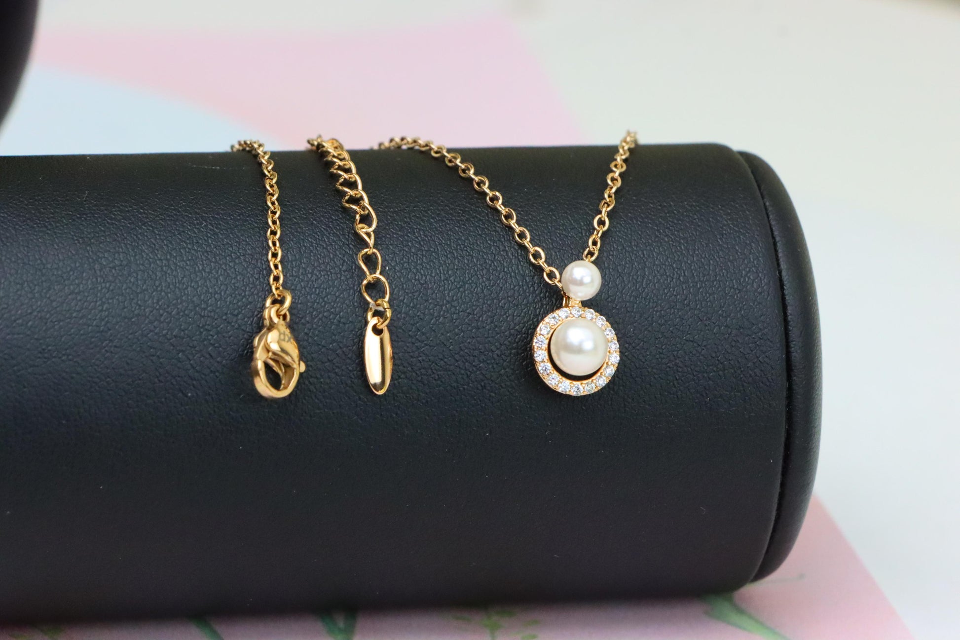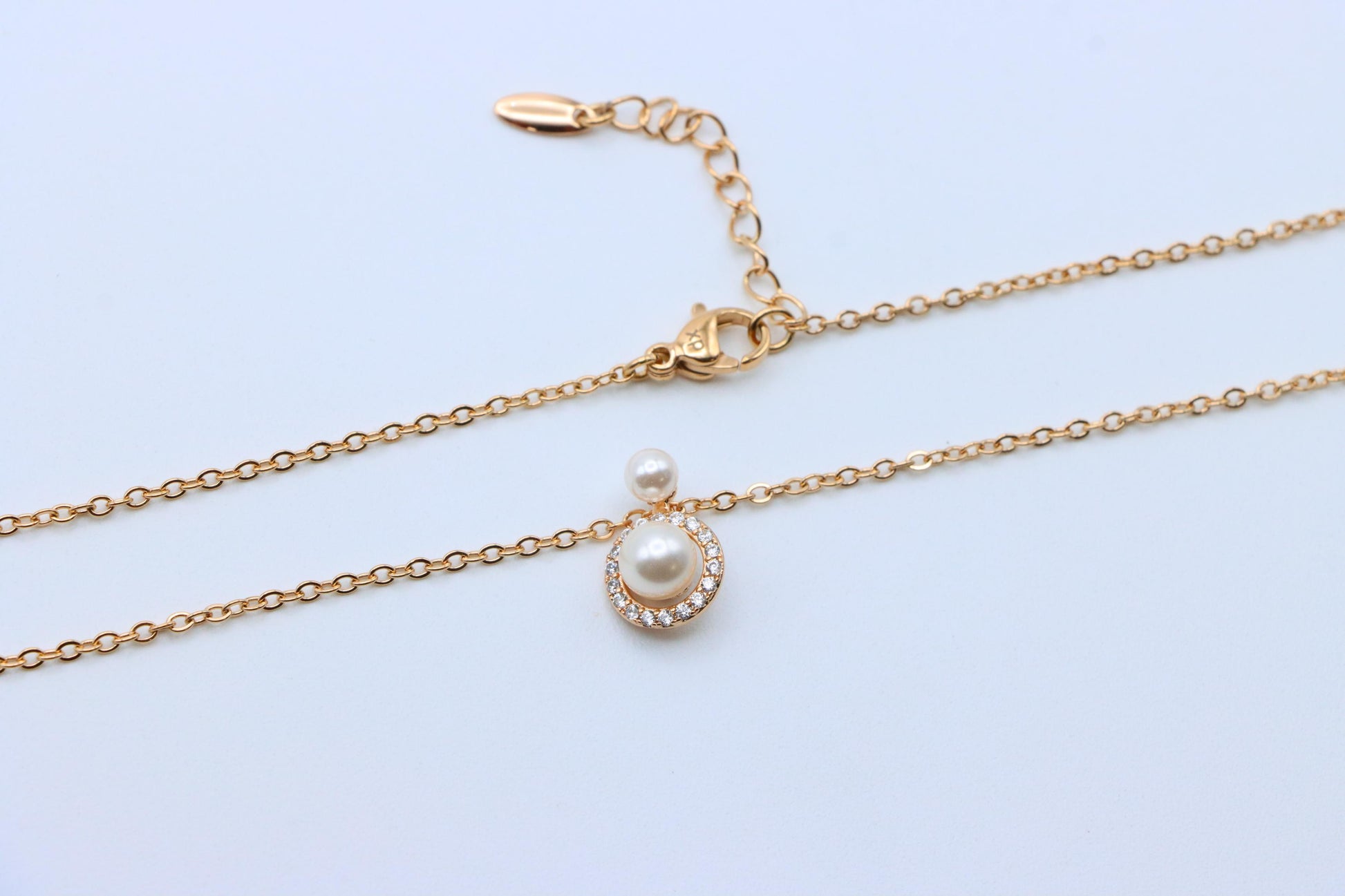 Elegant Dual Pearl Rose Gold Necklace with Sparkling Halo Circle, XPNL1899 (2161-2)