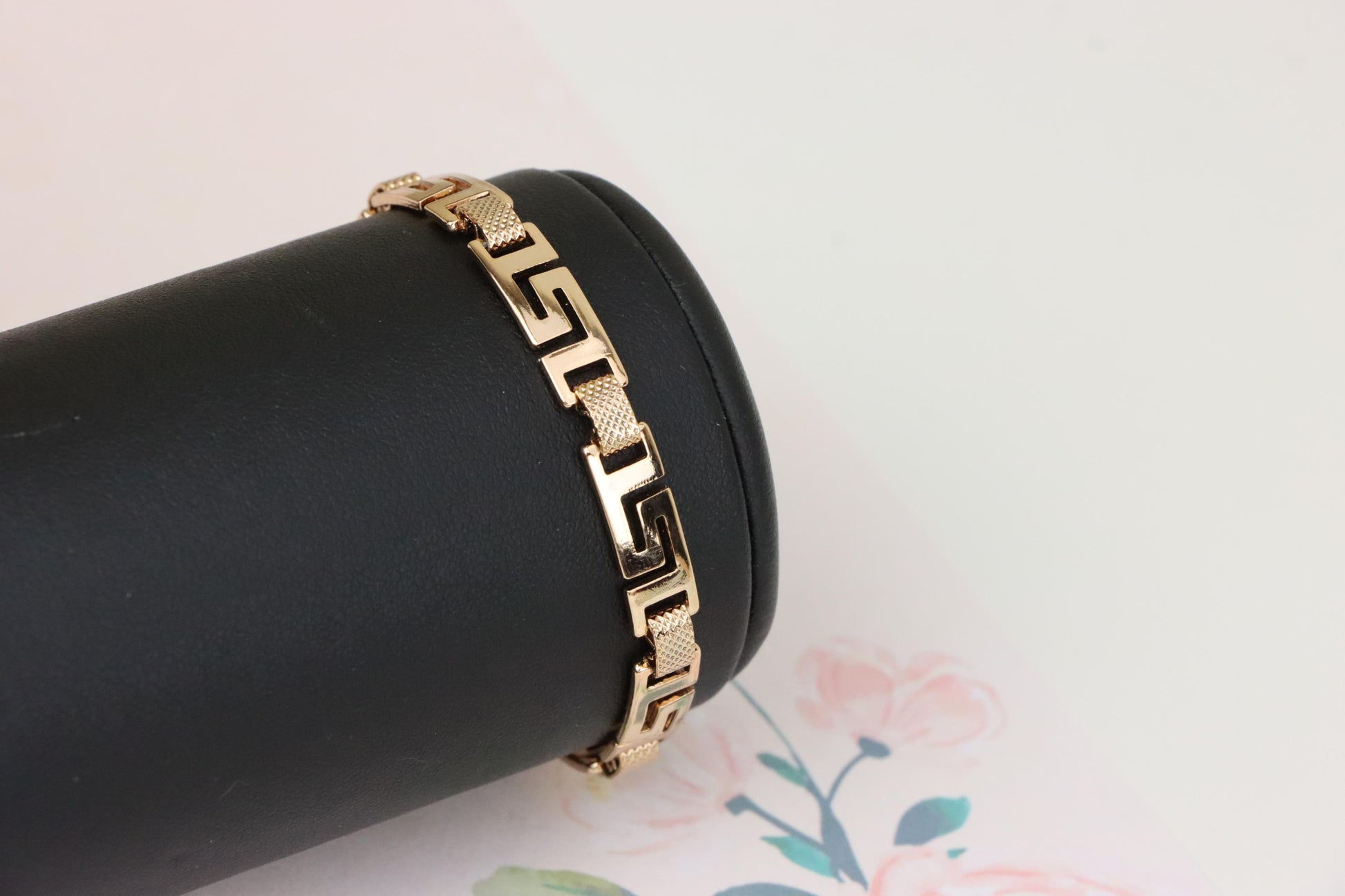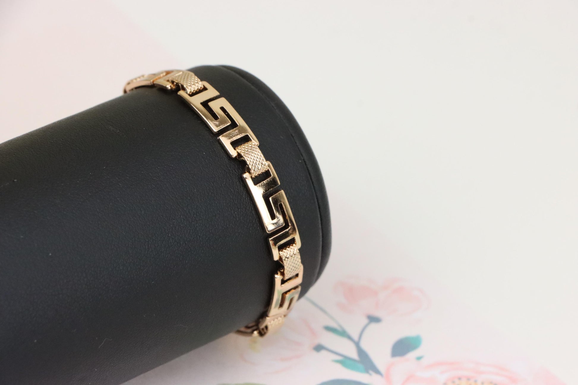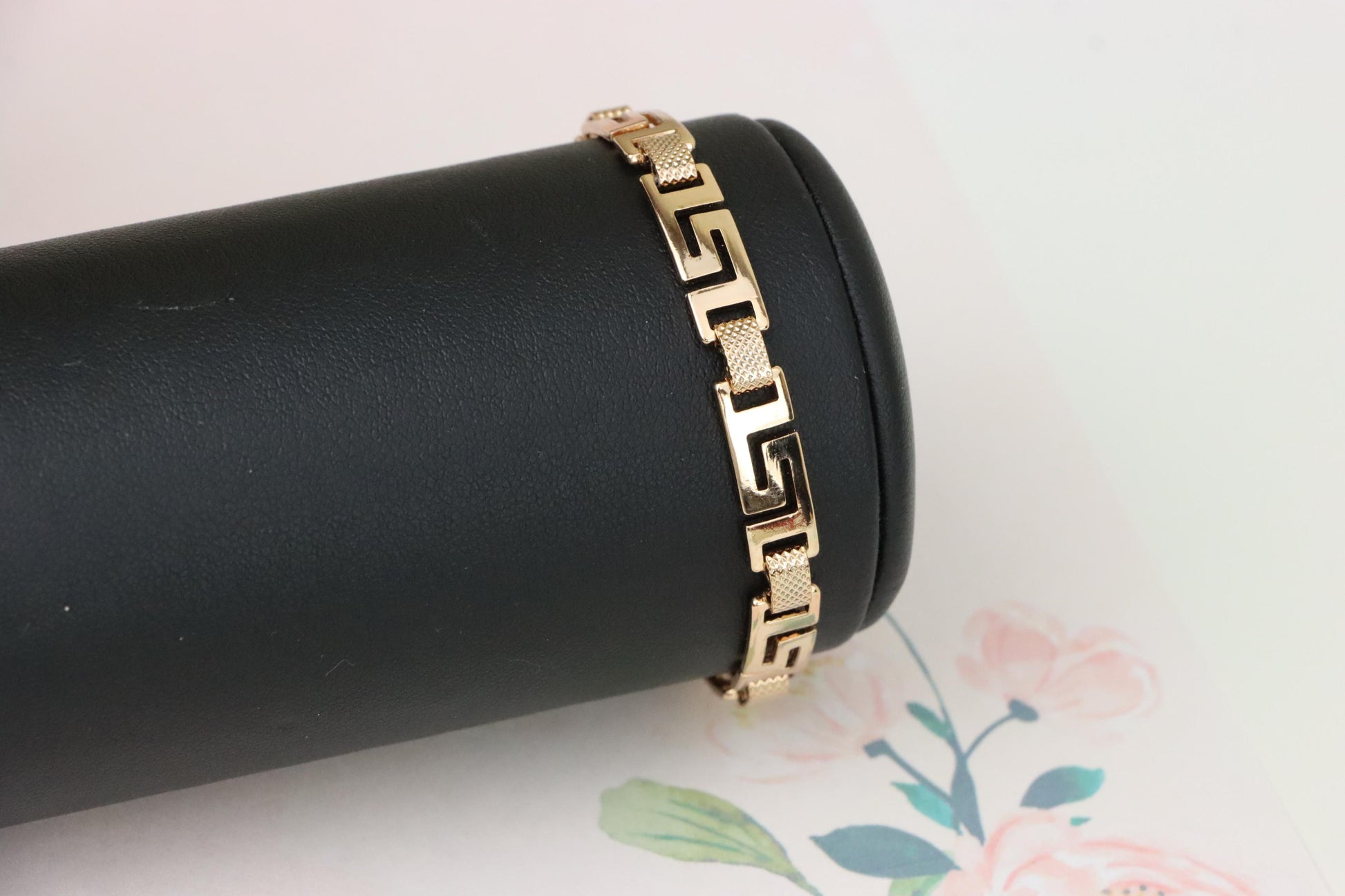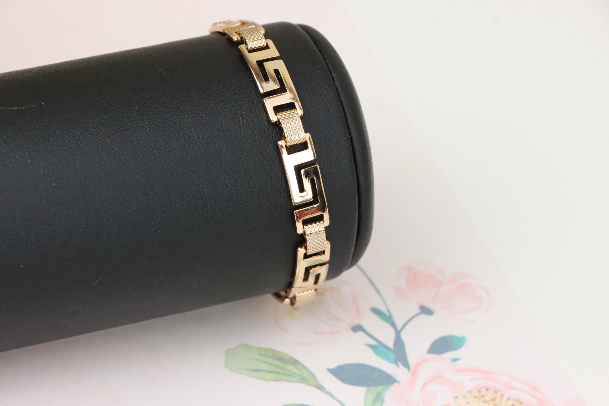 Grace your wrist with this bold yet refined rose gold bracelet, featuring a striking Greek key design that blends classic elegance with modern appeal.