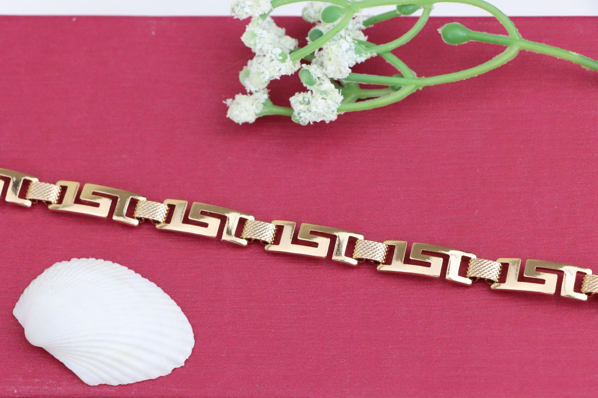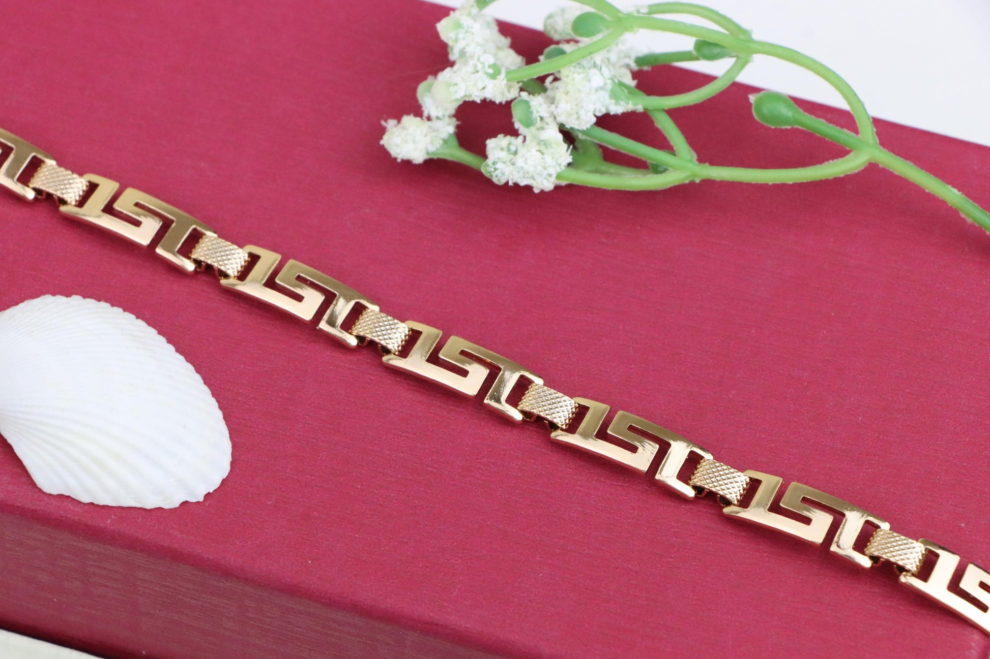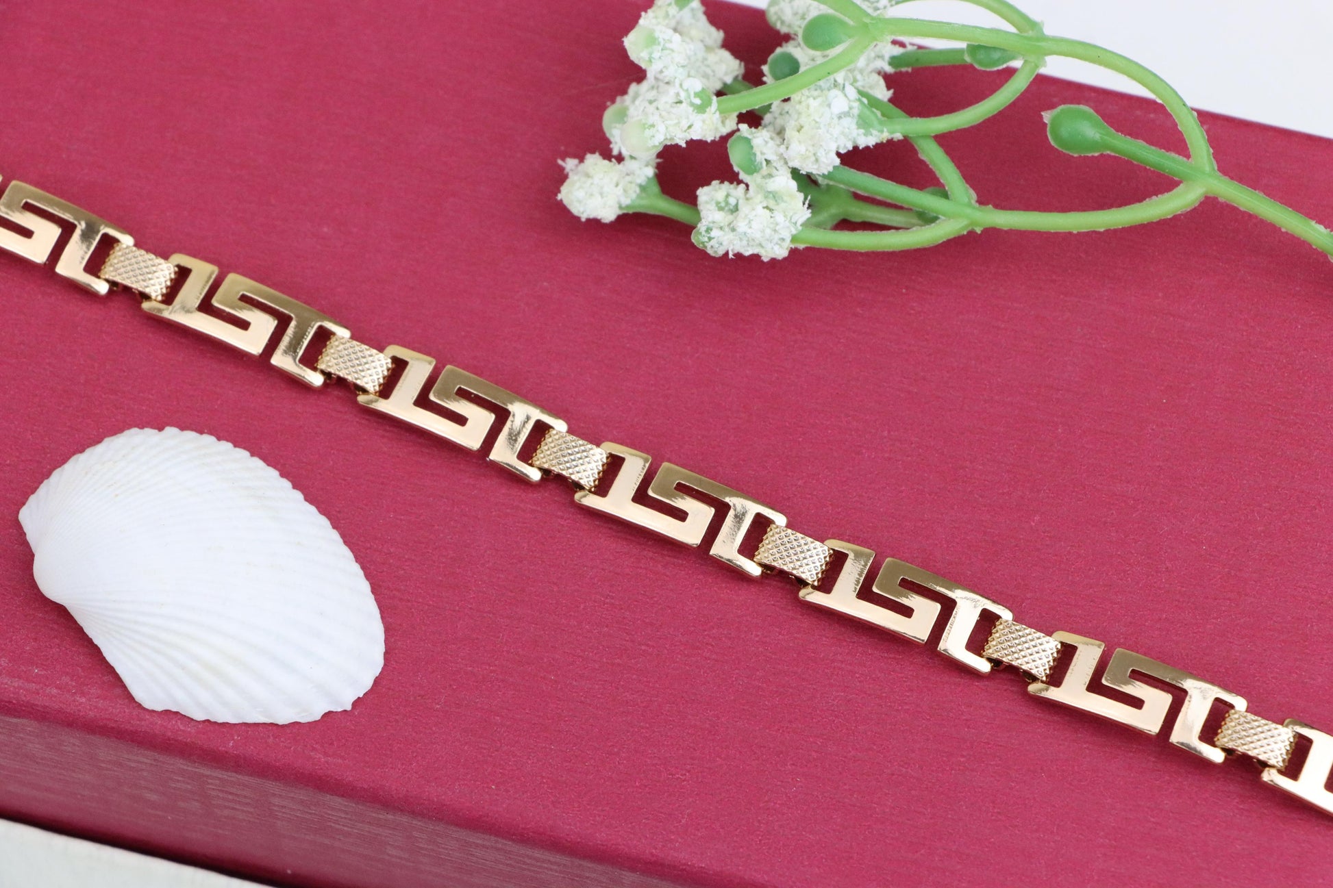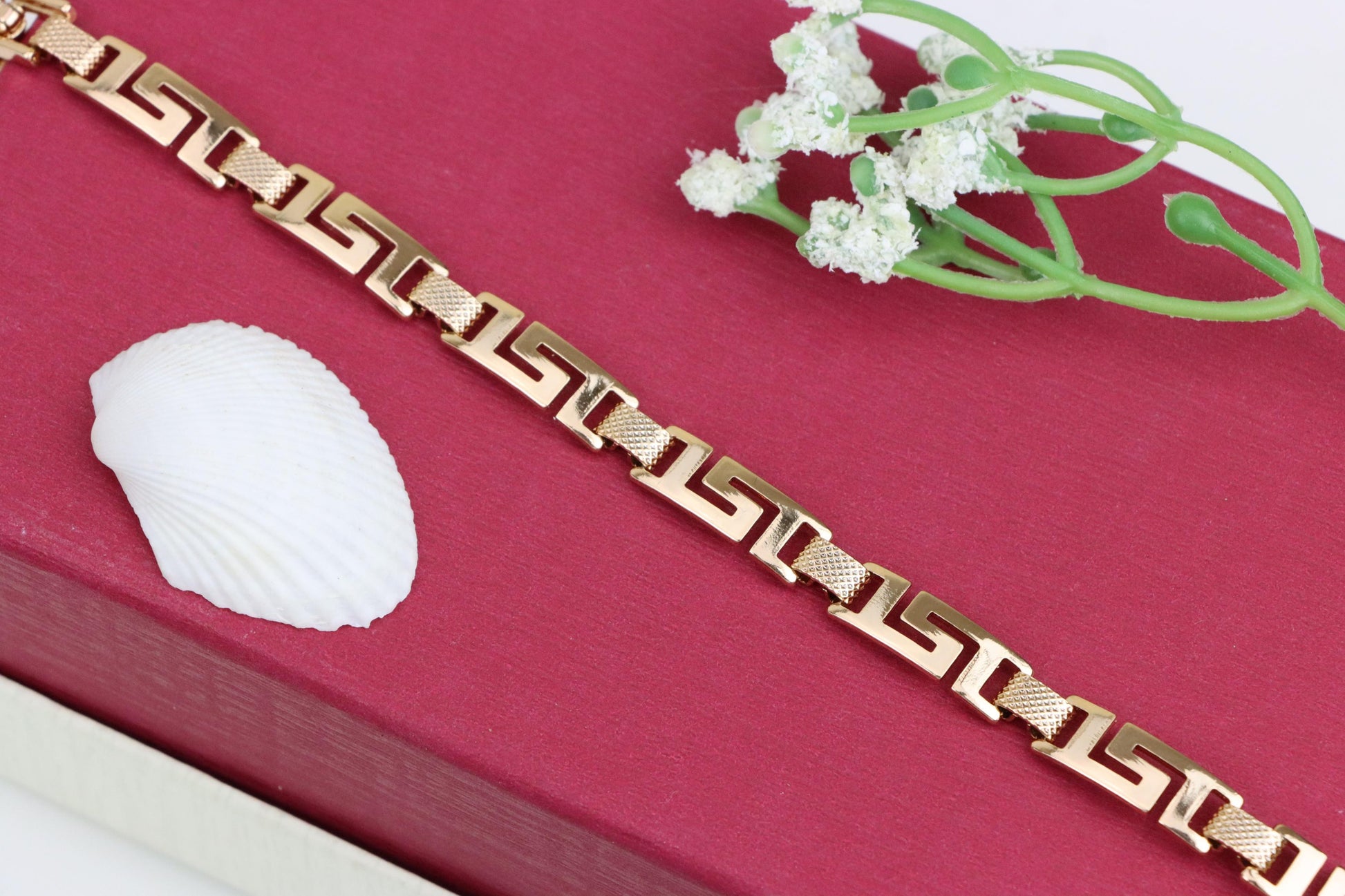 Grace your wrist with this bold yet refined rose gold bracelet, featuring a striking Greek key design that blends classic elegance with modern appeal.