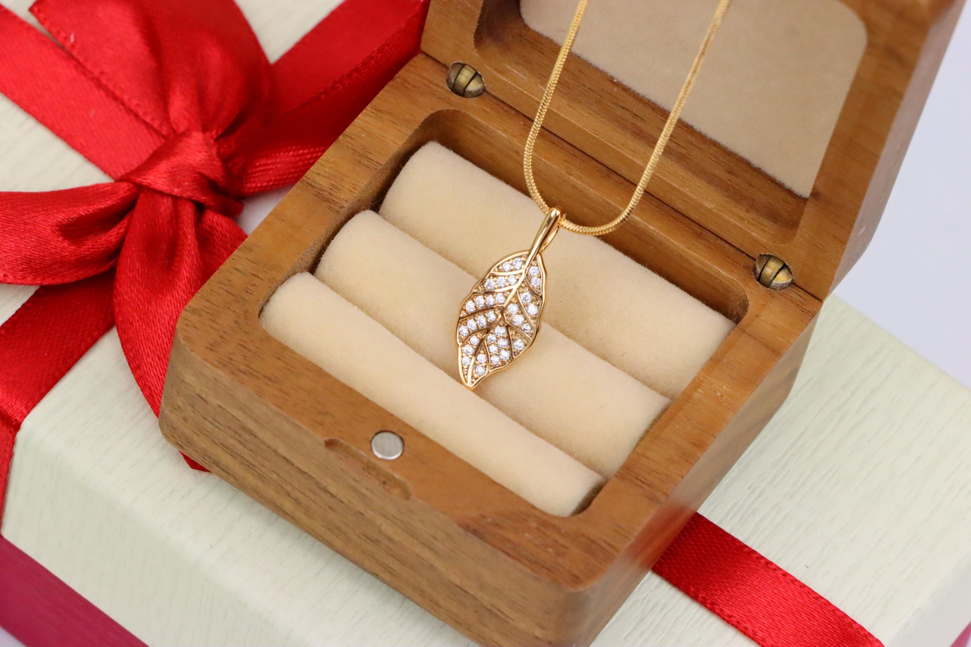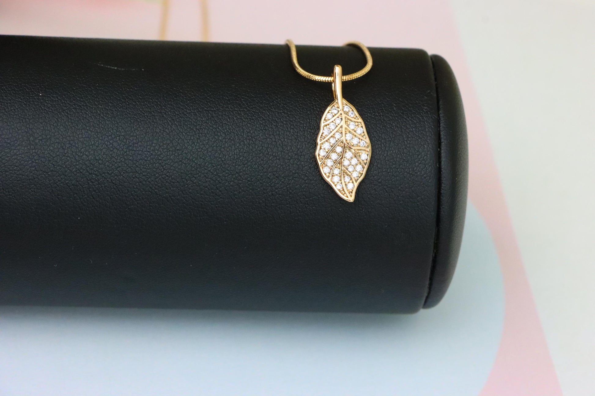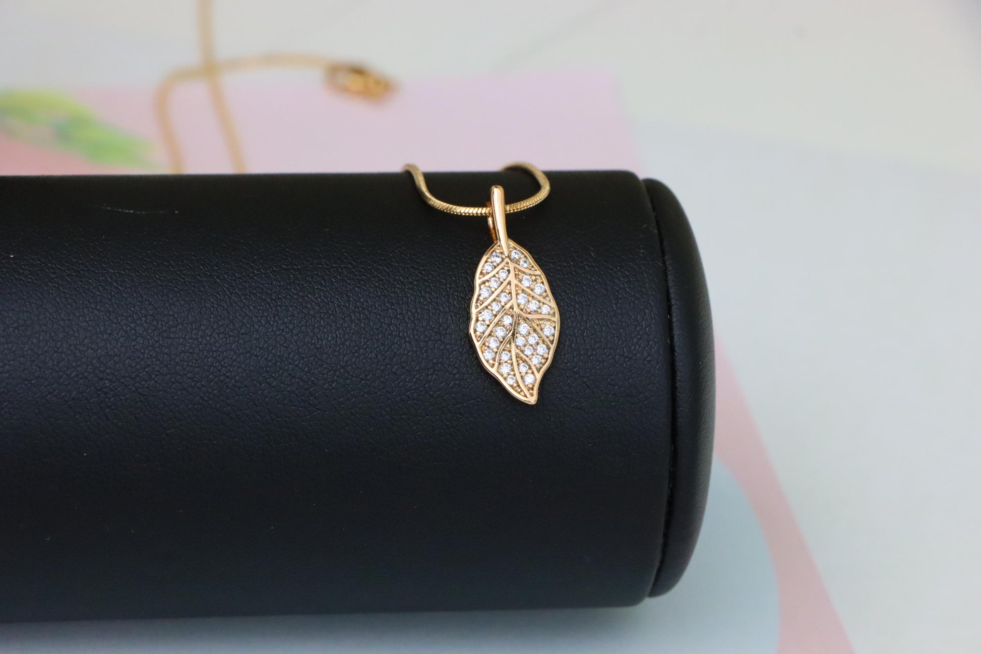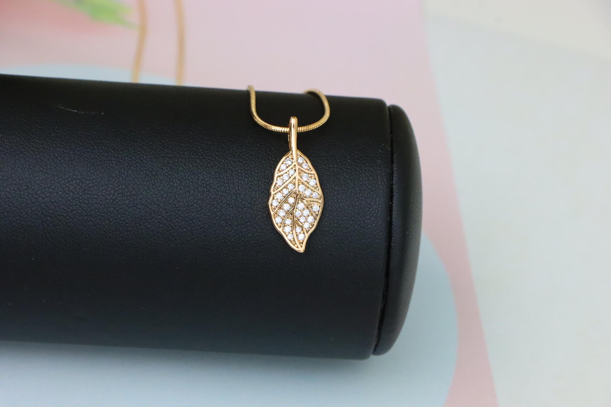 Nature-inspired pendant shaped like a leaf, featuring shimmering white stones for a graceful and radiant appeal.