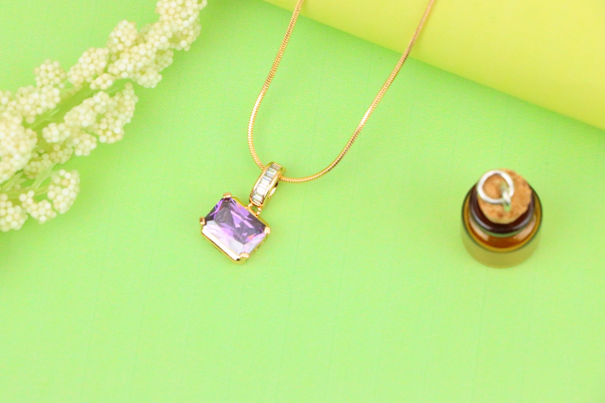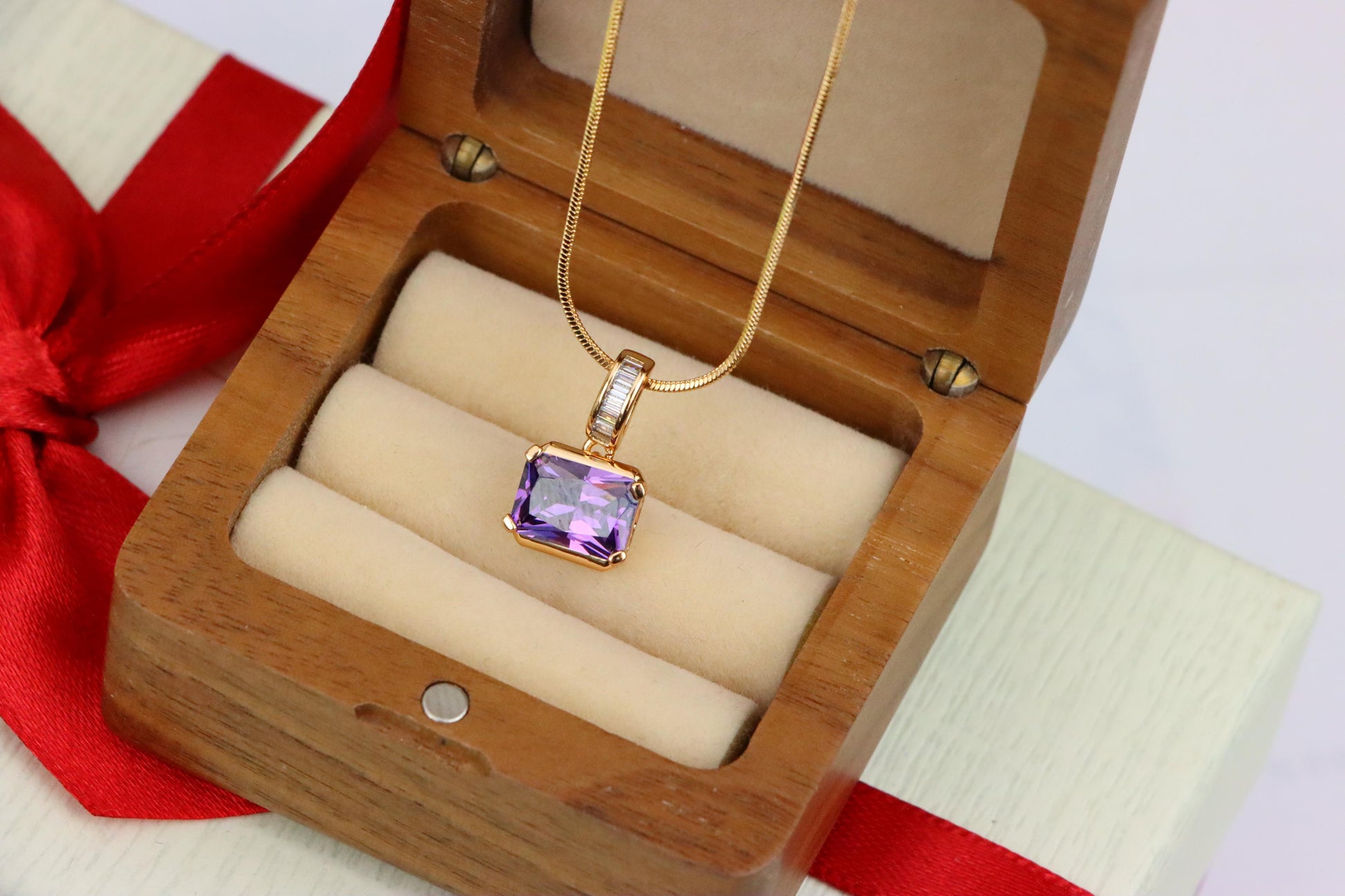 A stunning purple pendant showcasing an emerald-cut stone and luxurious baguette detailing on the bail, perfect for adding a royal touch to your look.