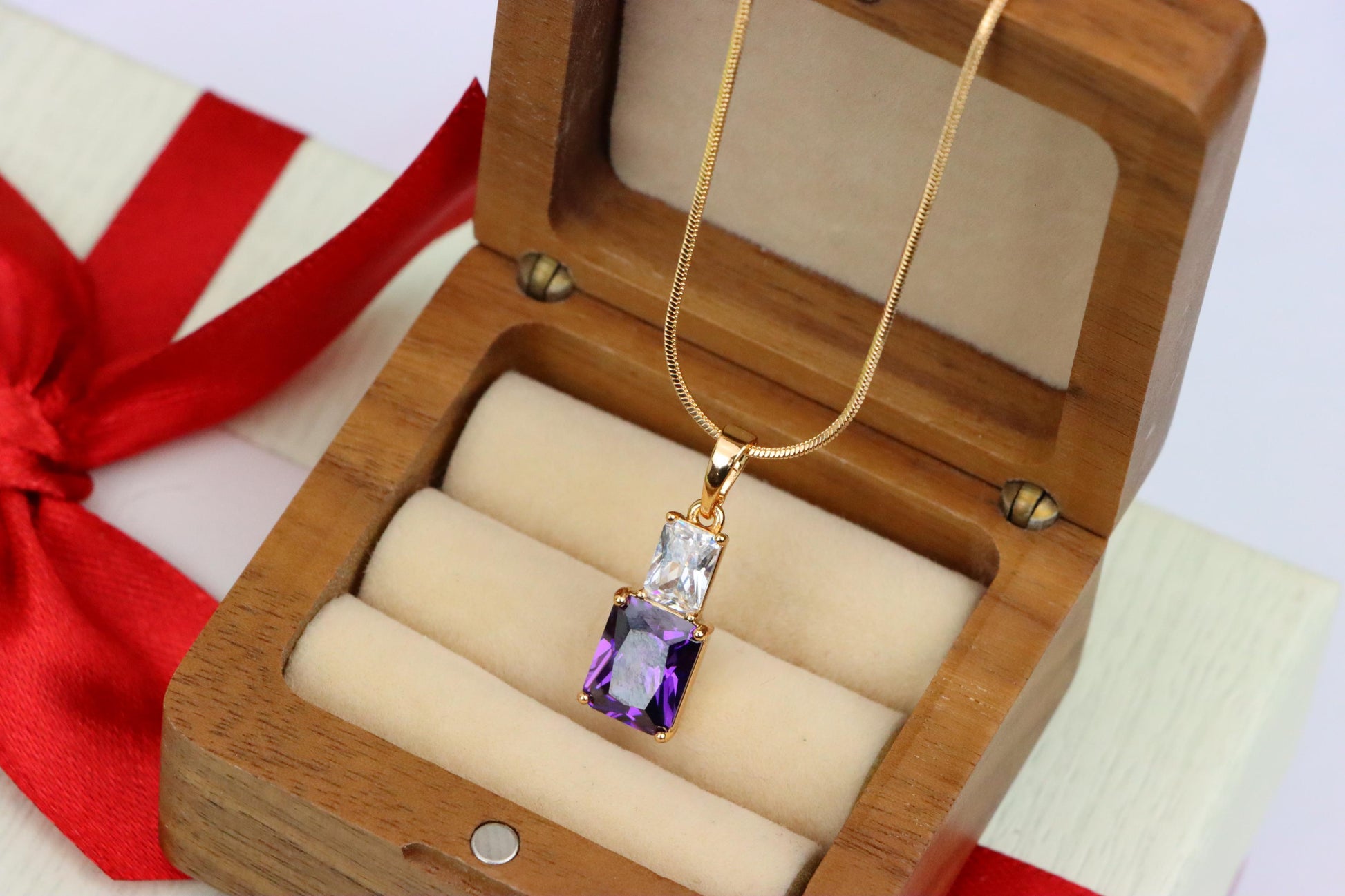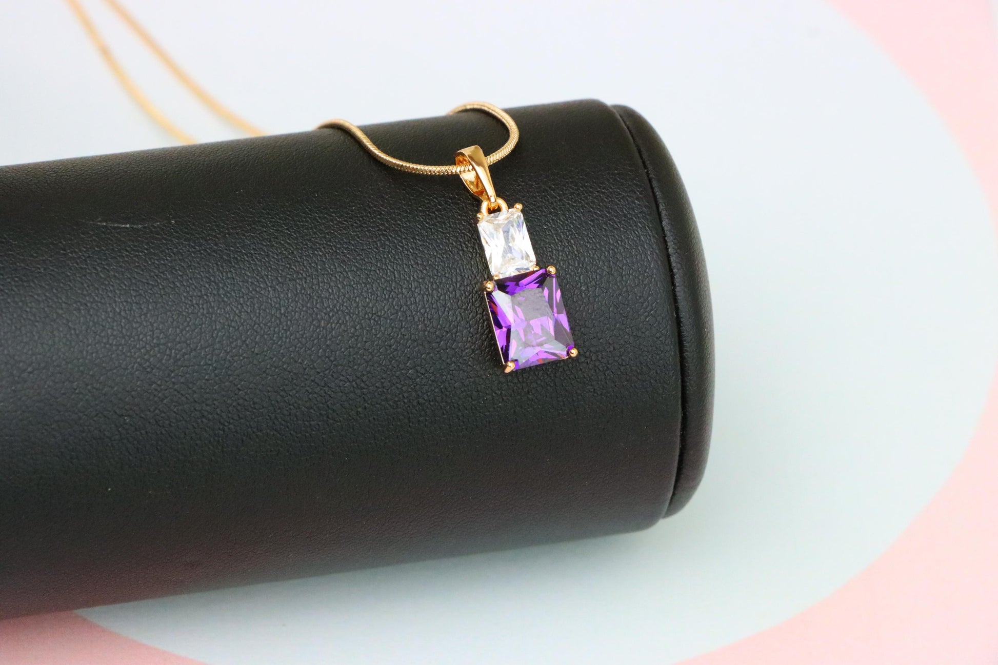 This beautiful purple pendant features a richly colored gemstone and sparkling accent, all set in a high-quality gold-plated brass frame for a polished, modern look.