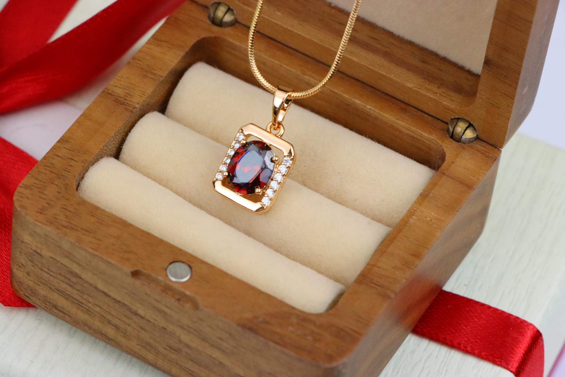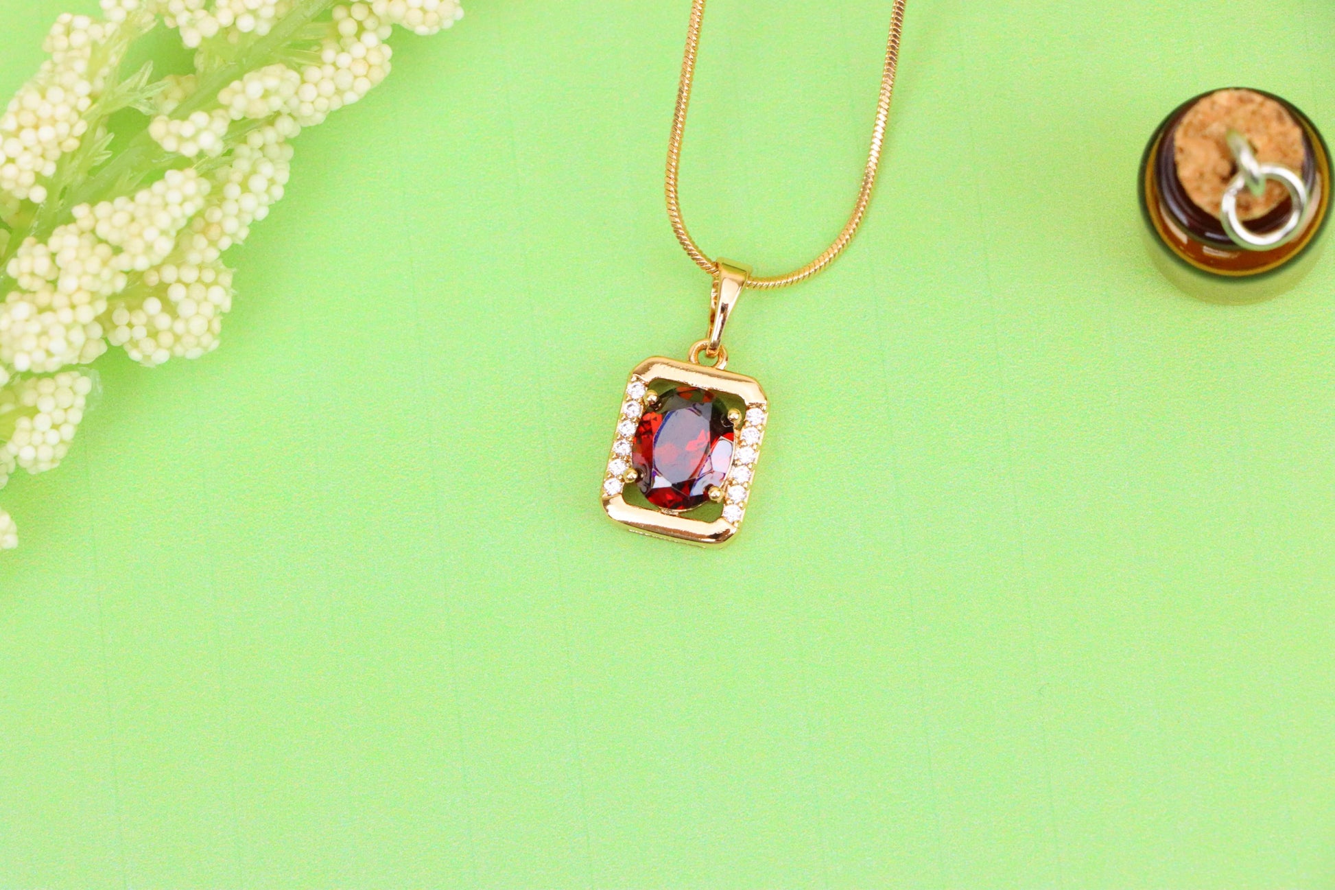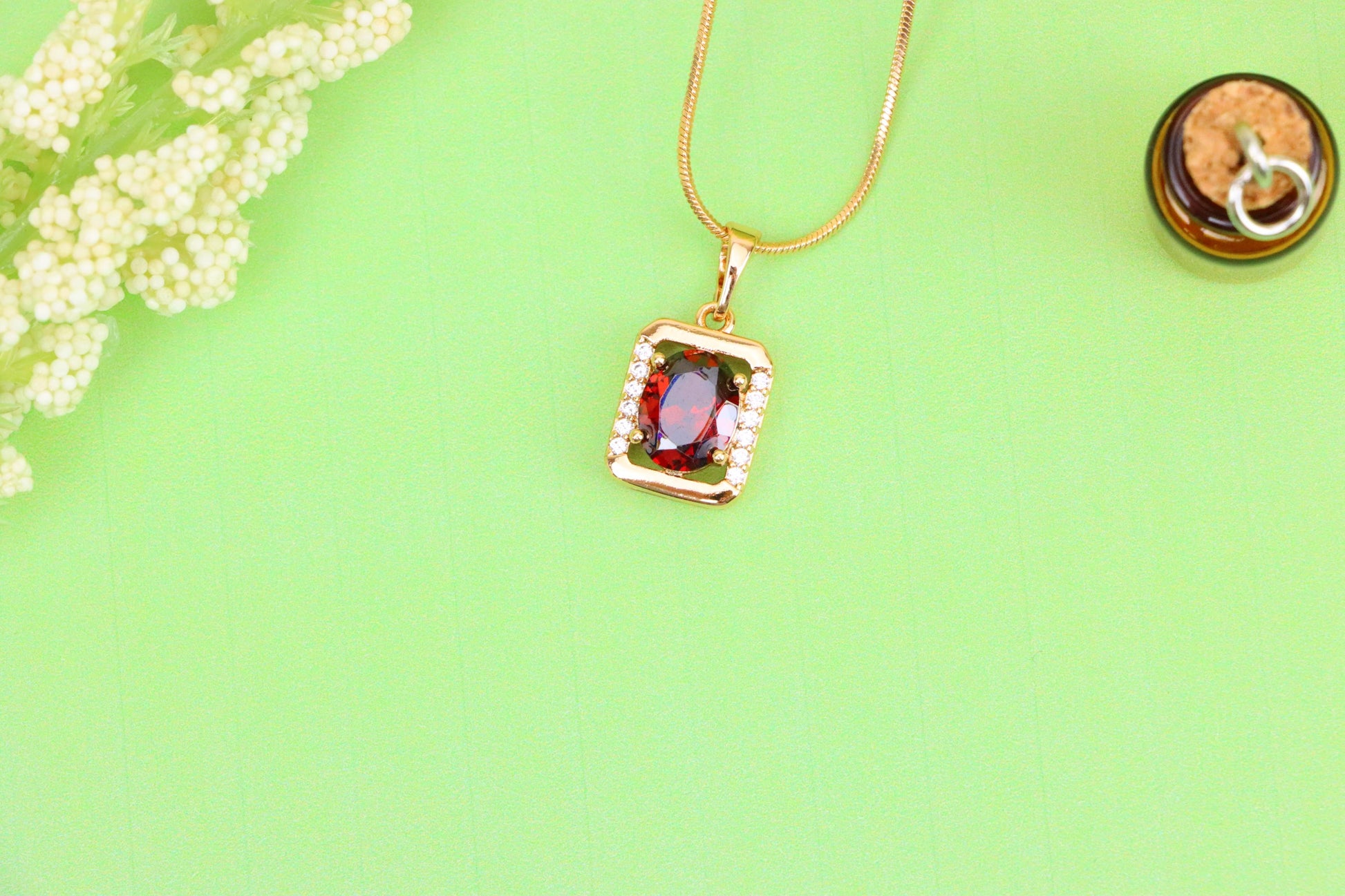 A striking rectangular pendant with a deep red centerpiece and clear CZ border.