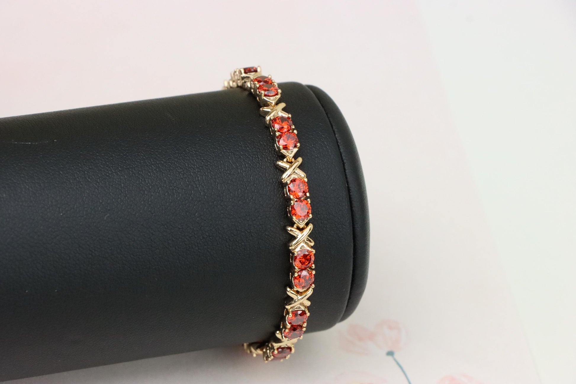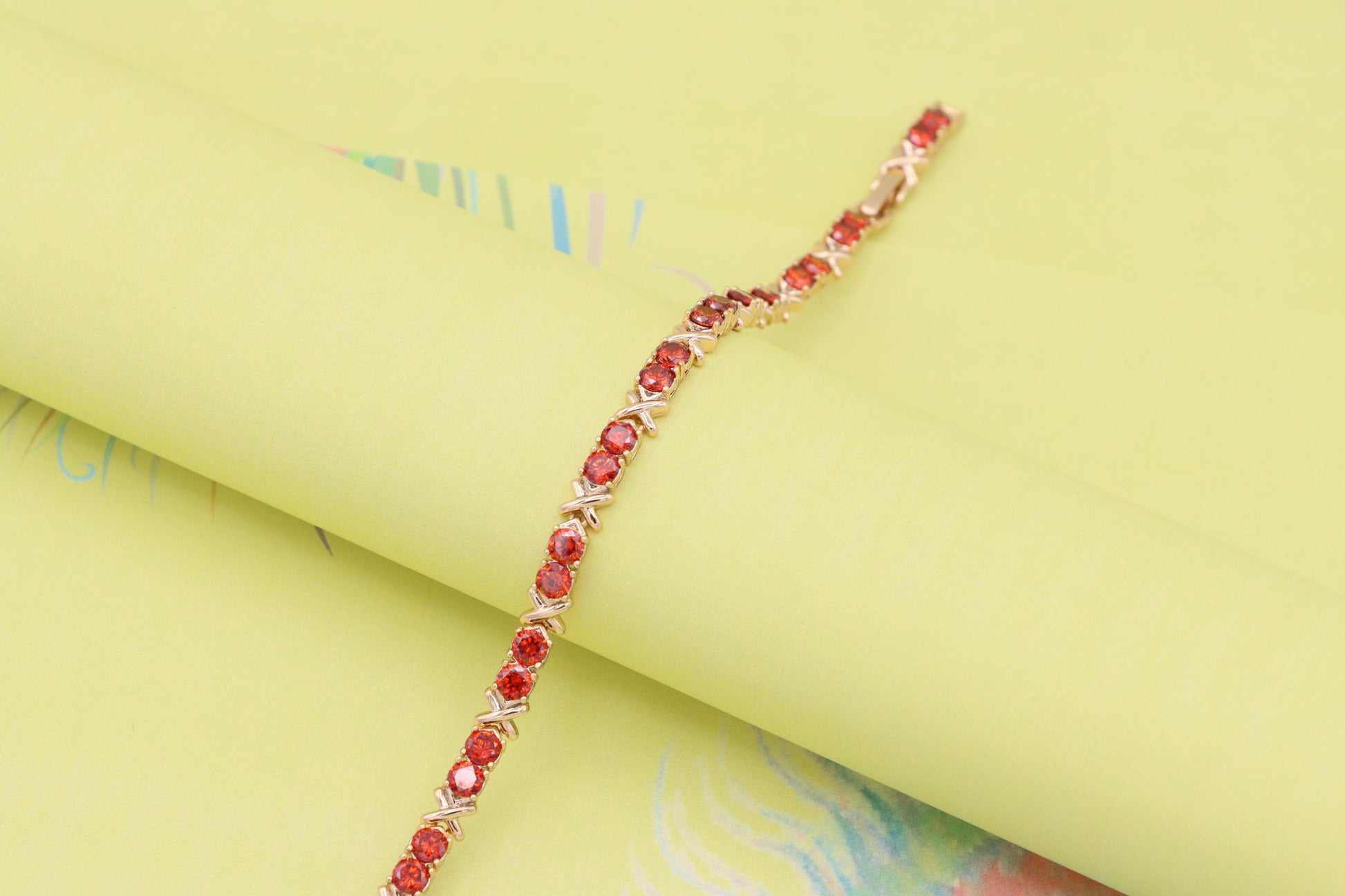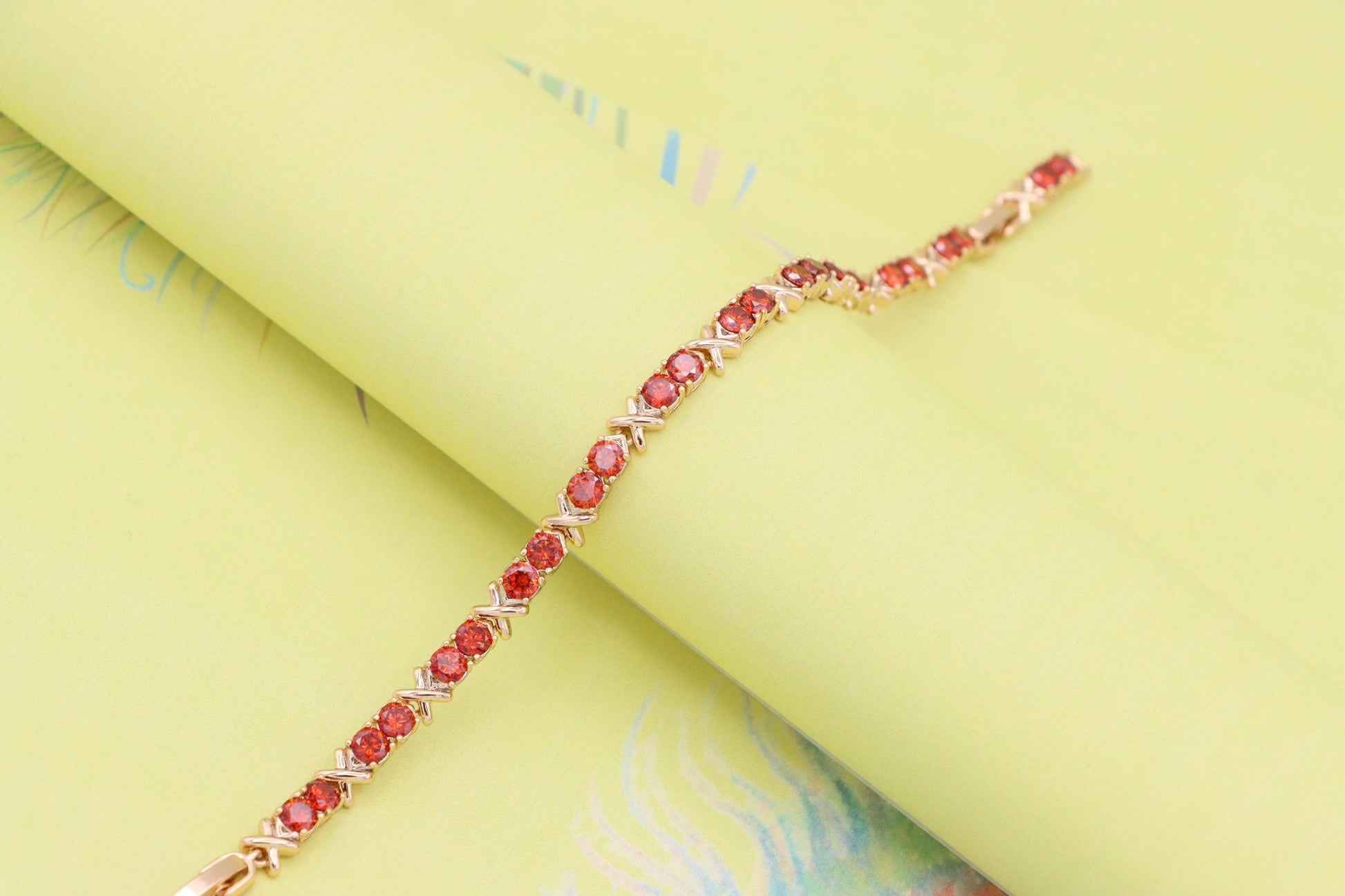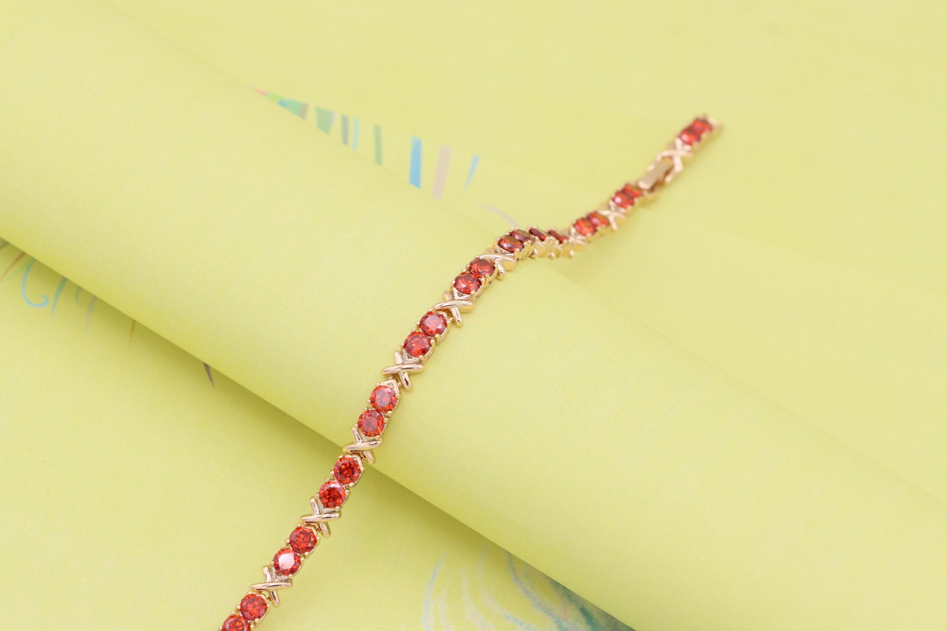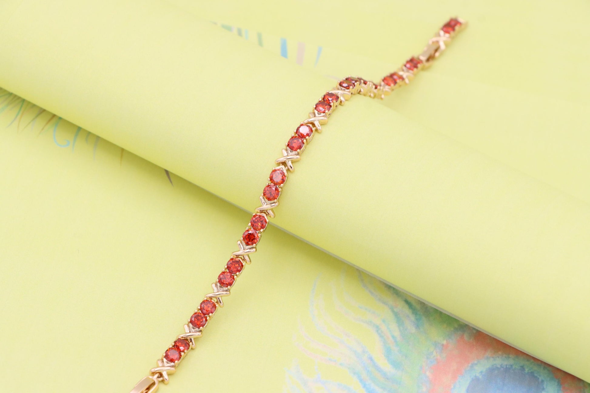 Crafted in rose gold over premium quality brass, this stunning bracelet features oval red stones interlinked with stylish X-shaped connectors, offering a perfect blend of elegance and charm. Length is approximately 6.7 + 0.8 inches (17 + 2 cm).