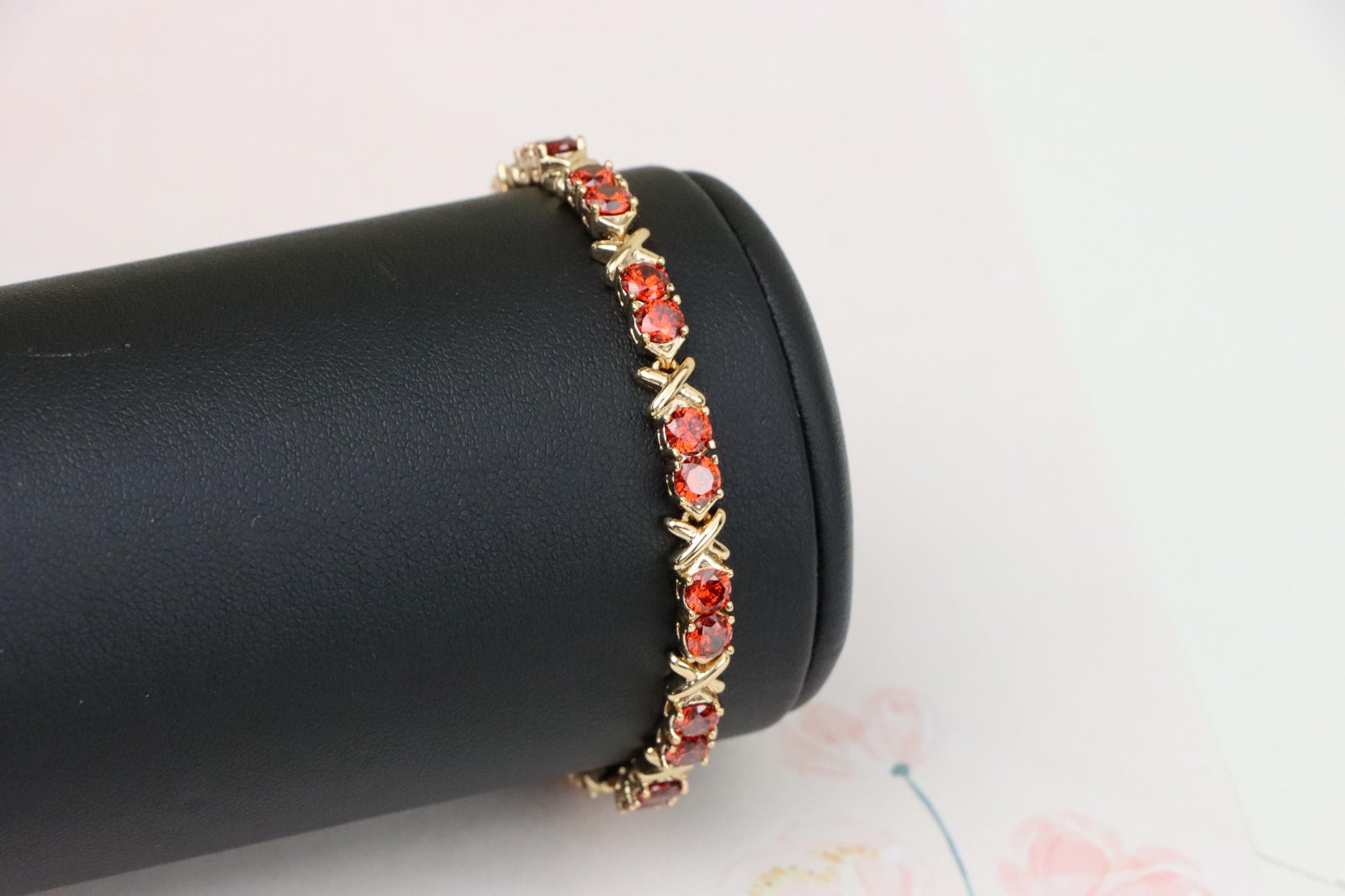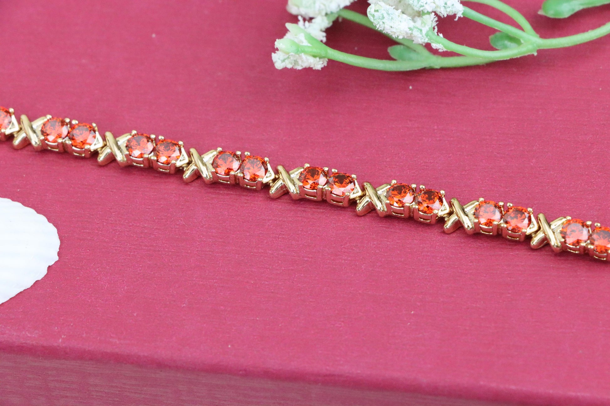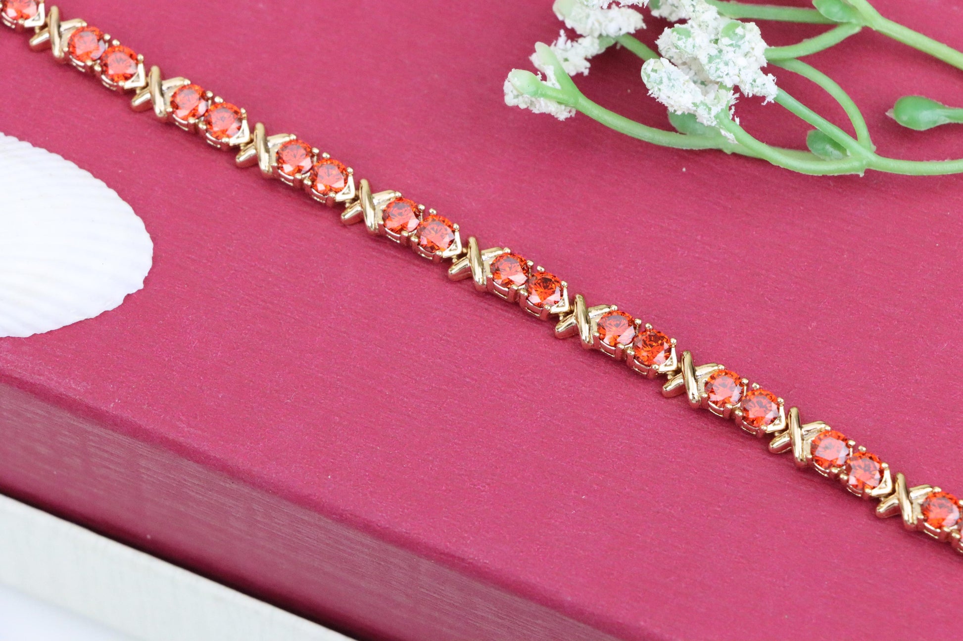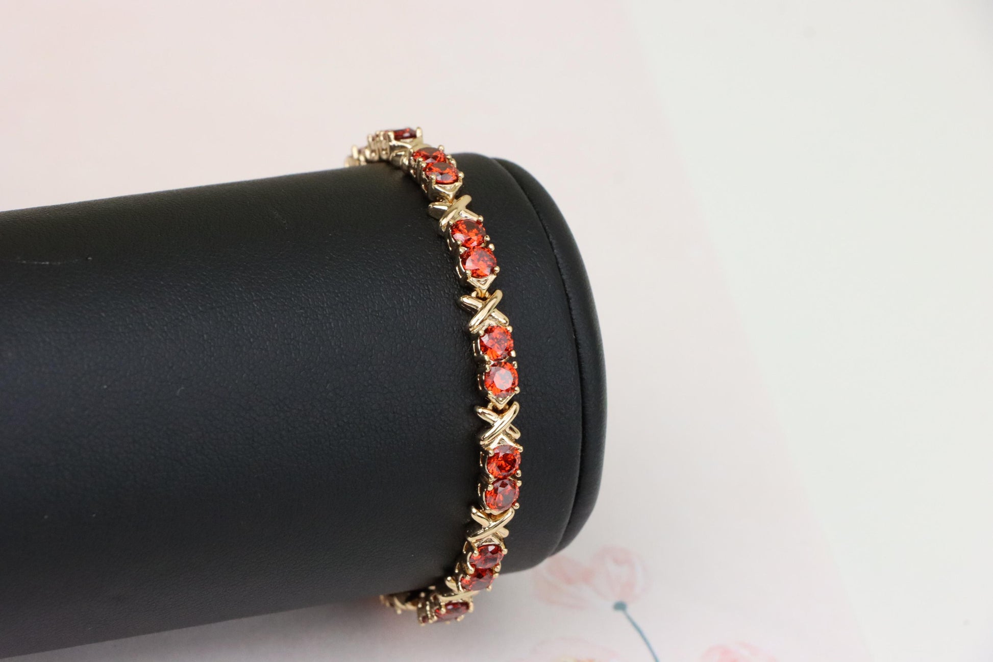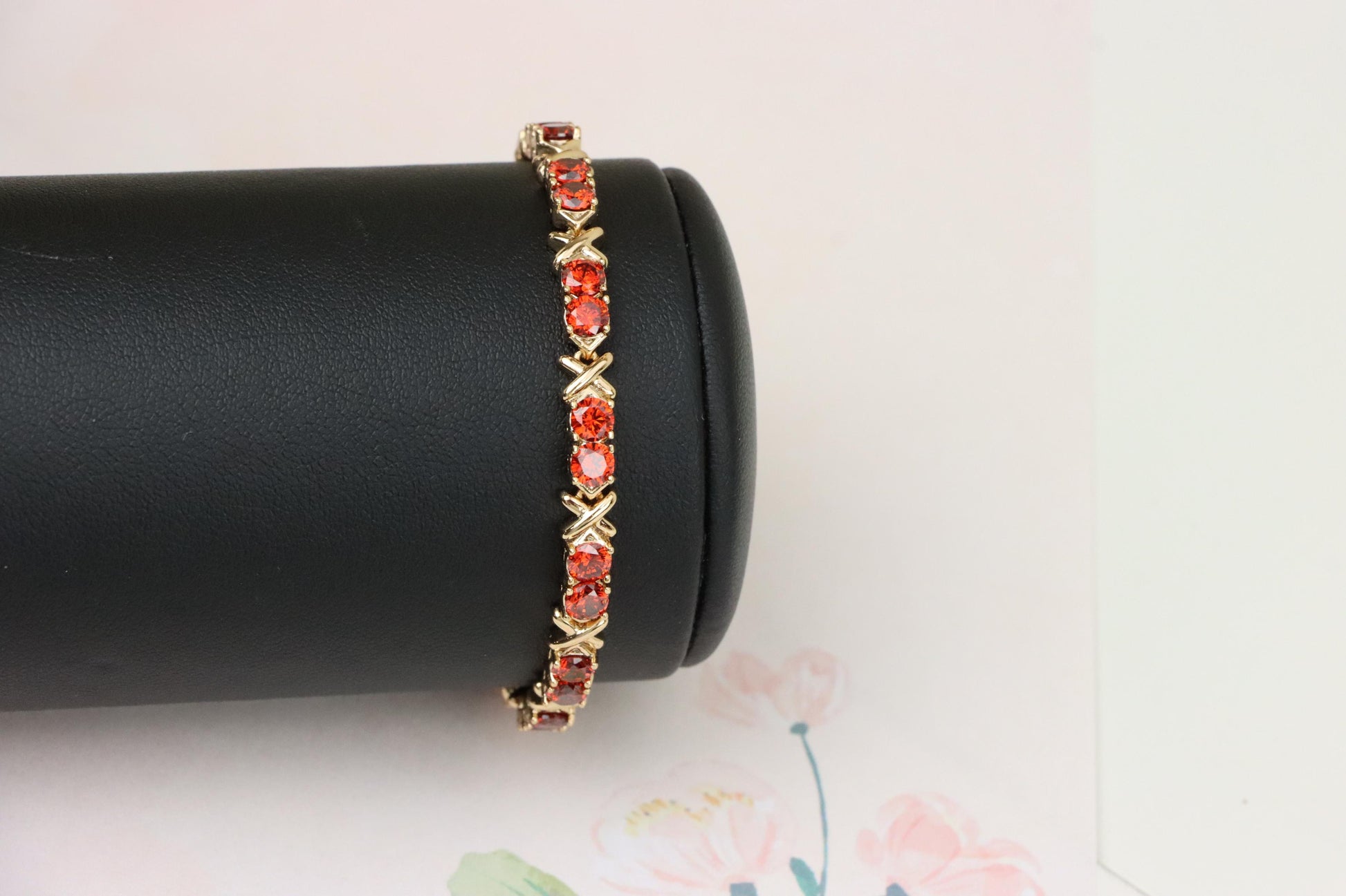 Crafted in rose gold over premium quality brass, this stunning bracelet features oval red stones interlinked with stylish X-shaped connectors, offering a perfect blend of elegance and charm. Length is approximately 6.7 + 0.8 inches (17 + 2 cm).