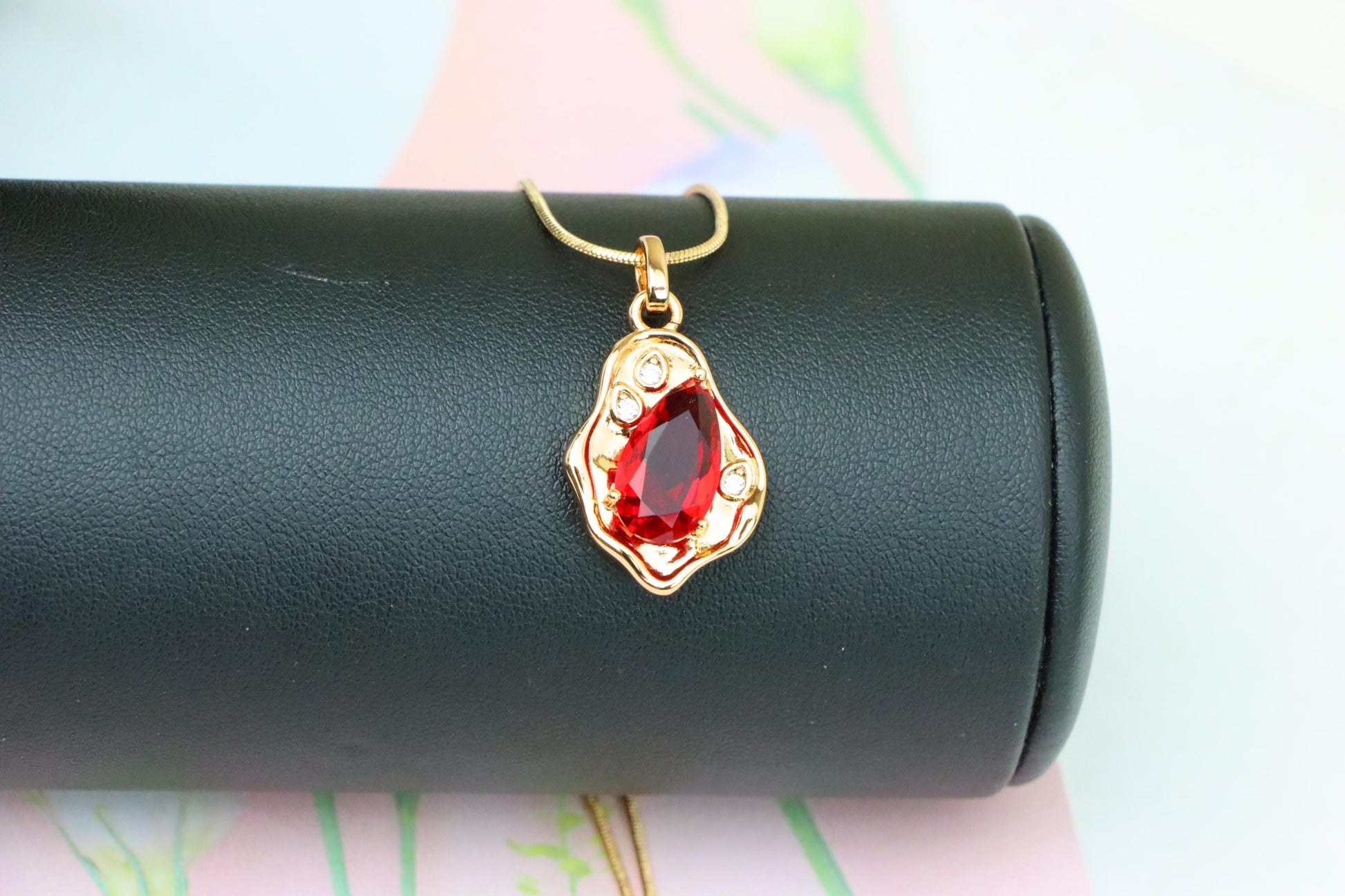 Eye-catching red teardrop pendant set in a fluid, organic gold-plated frame accented with sparkling cubic zirconia. A perfect blend of bold color and artistic elegance.