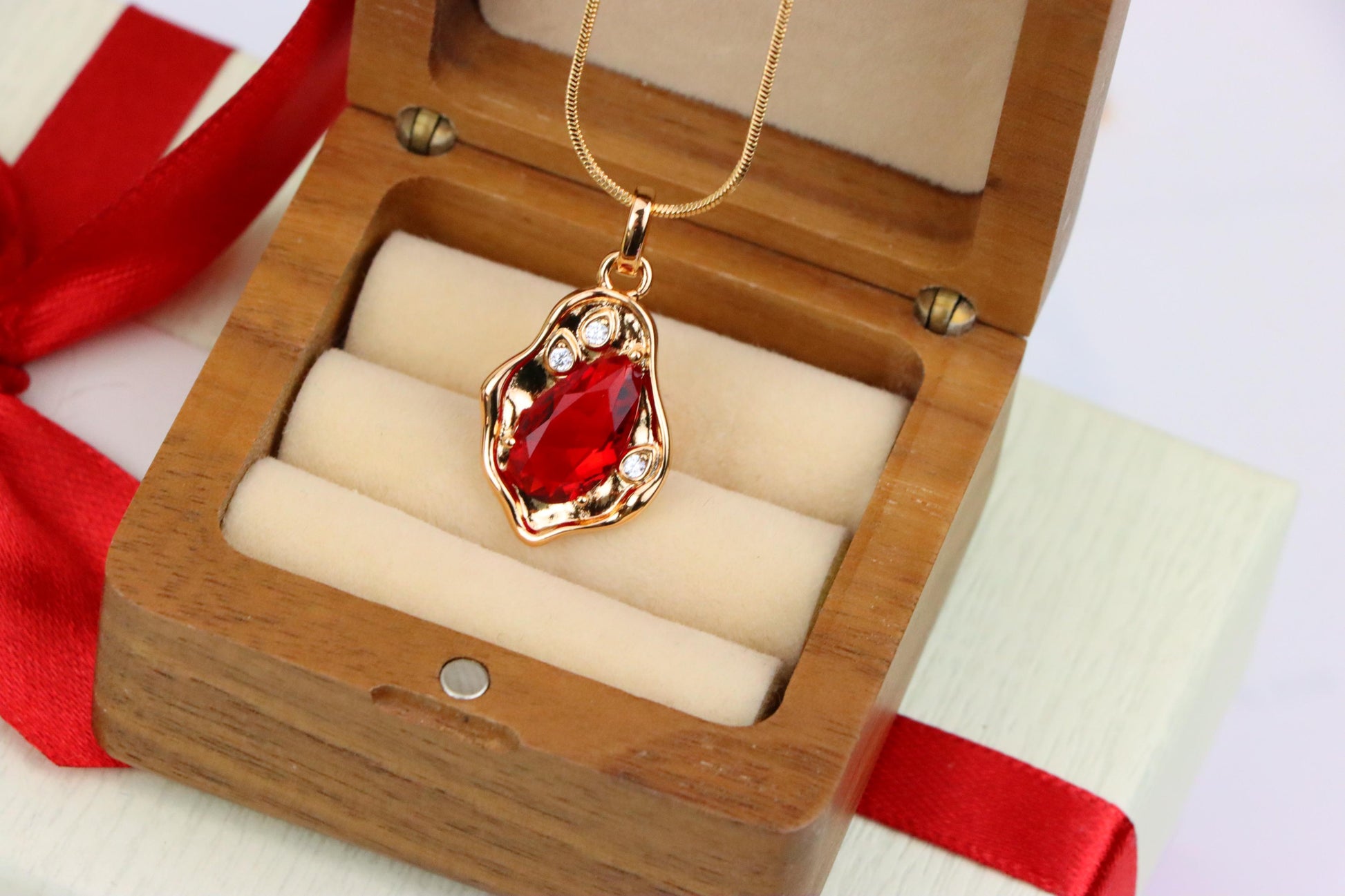 ✔️ Striking red teardrop center stone with crystal accents