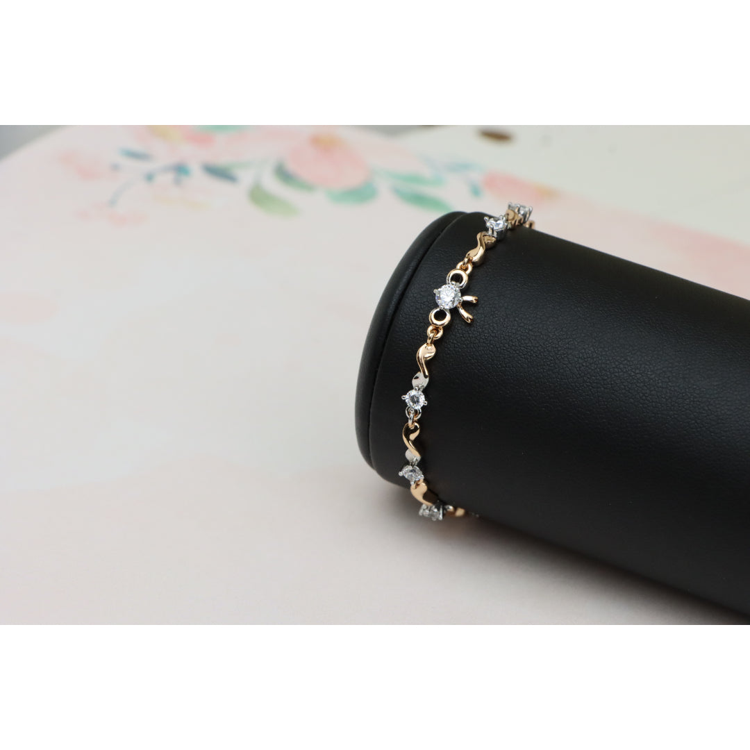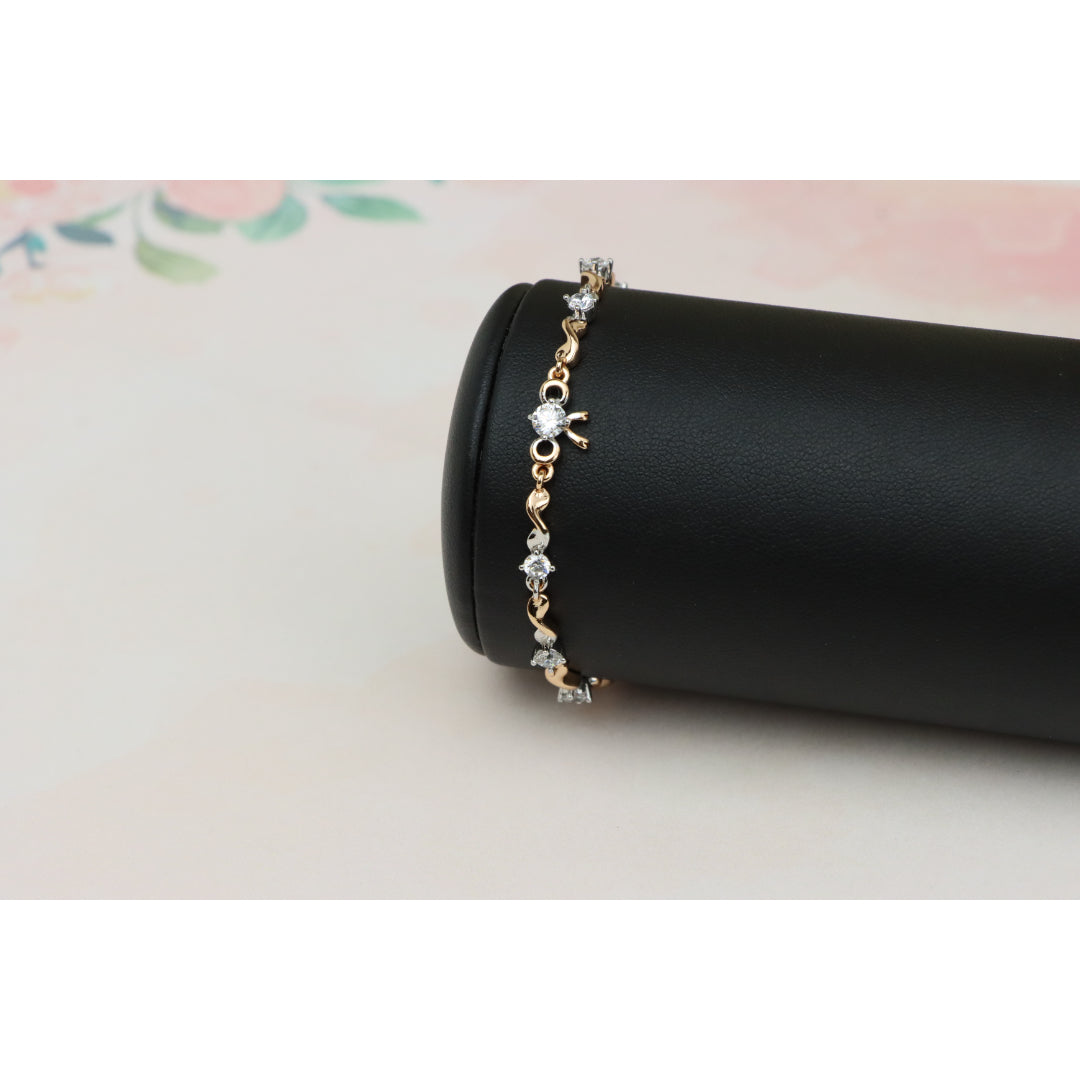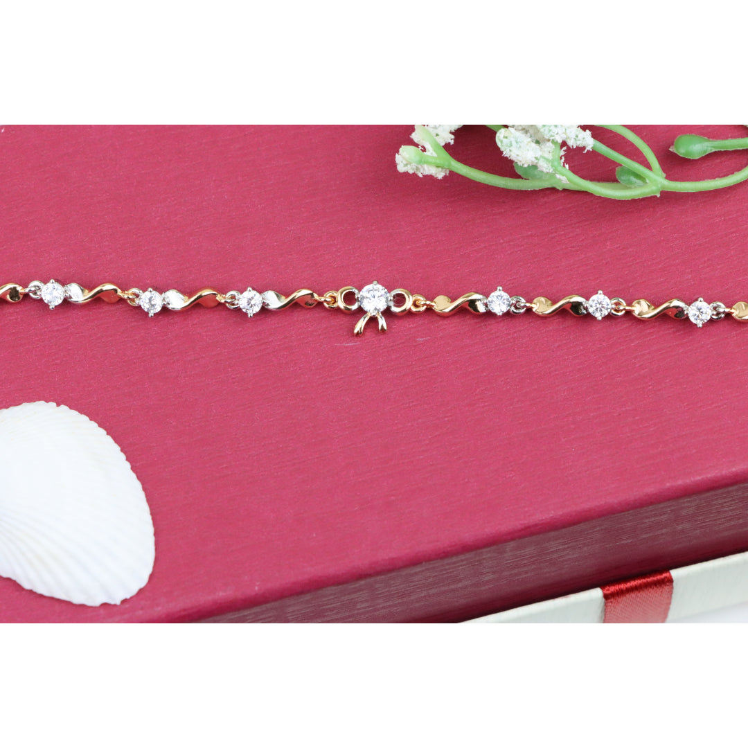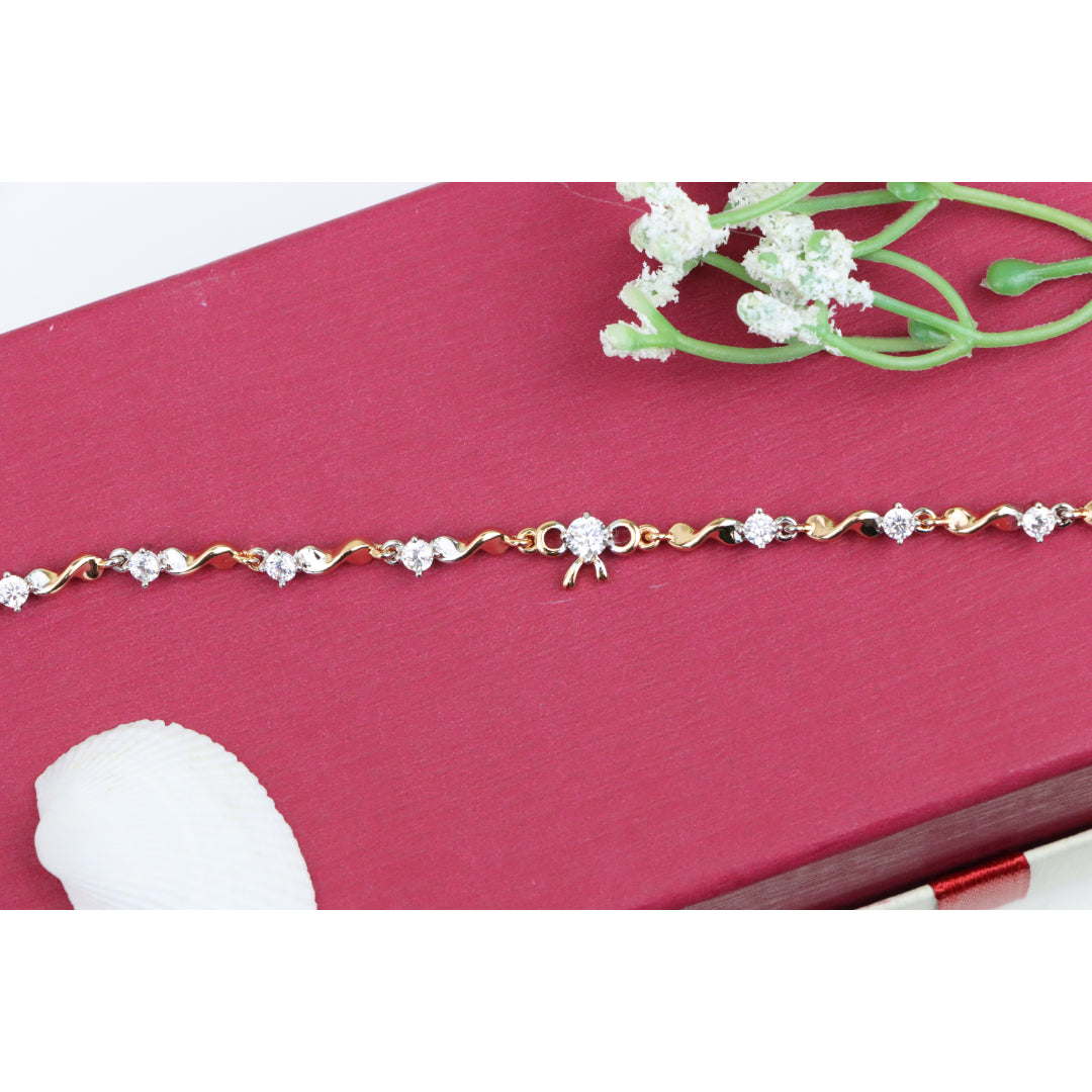 This beautiful bracelet features a delicate blend of rose gold and silver tones, highlighted with sparkling crystal accents in a charming bow and twist design. Perfect for adding a touch of elegance to any outfit.