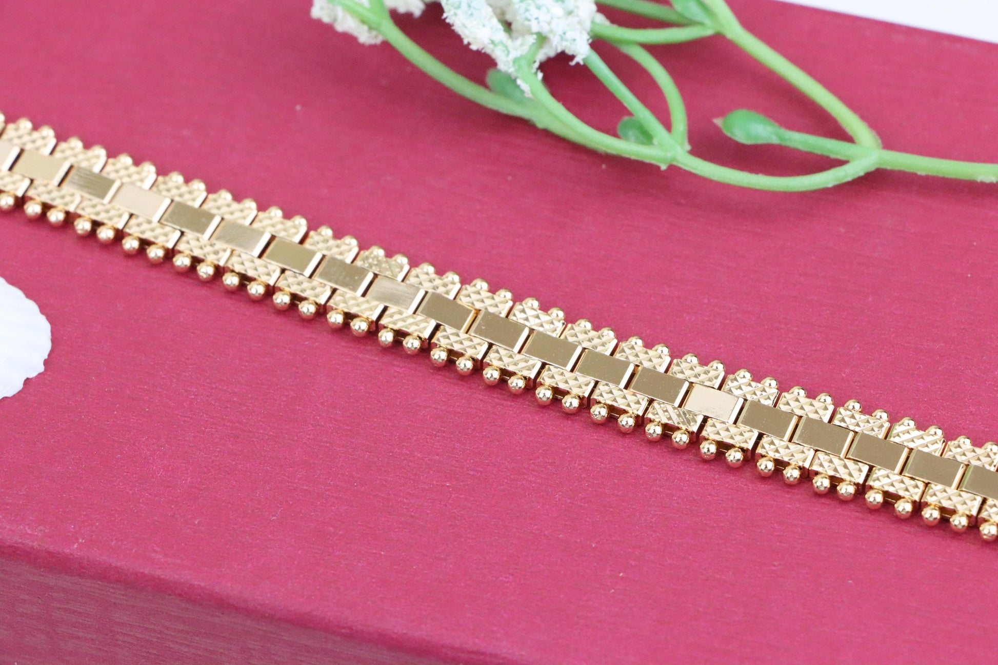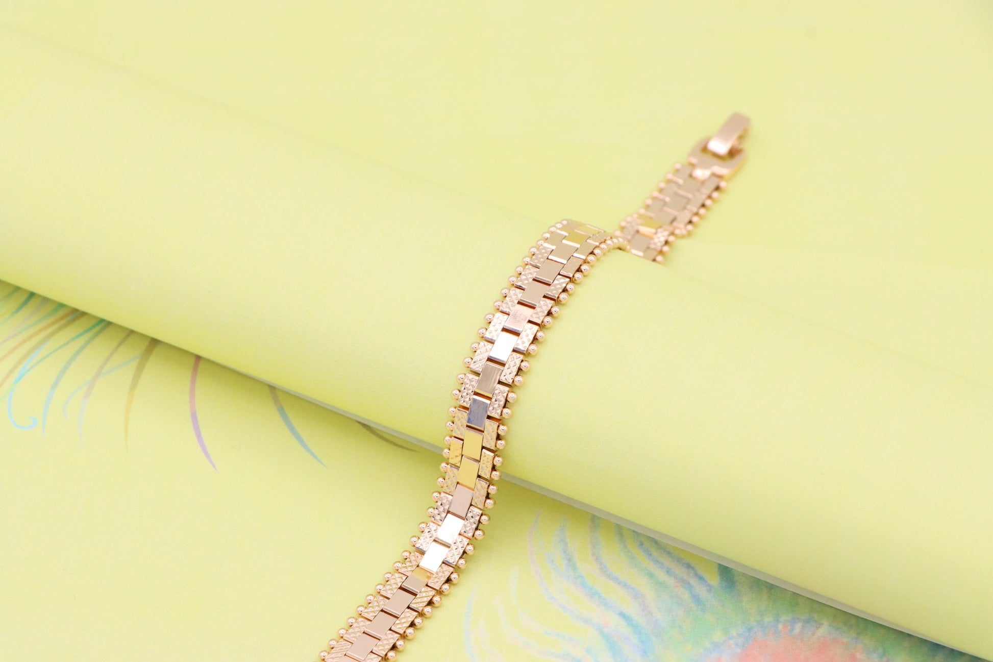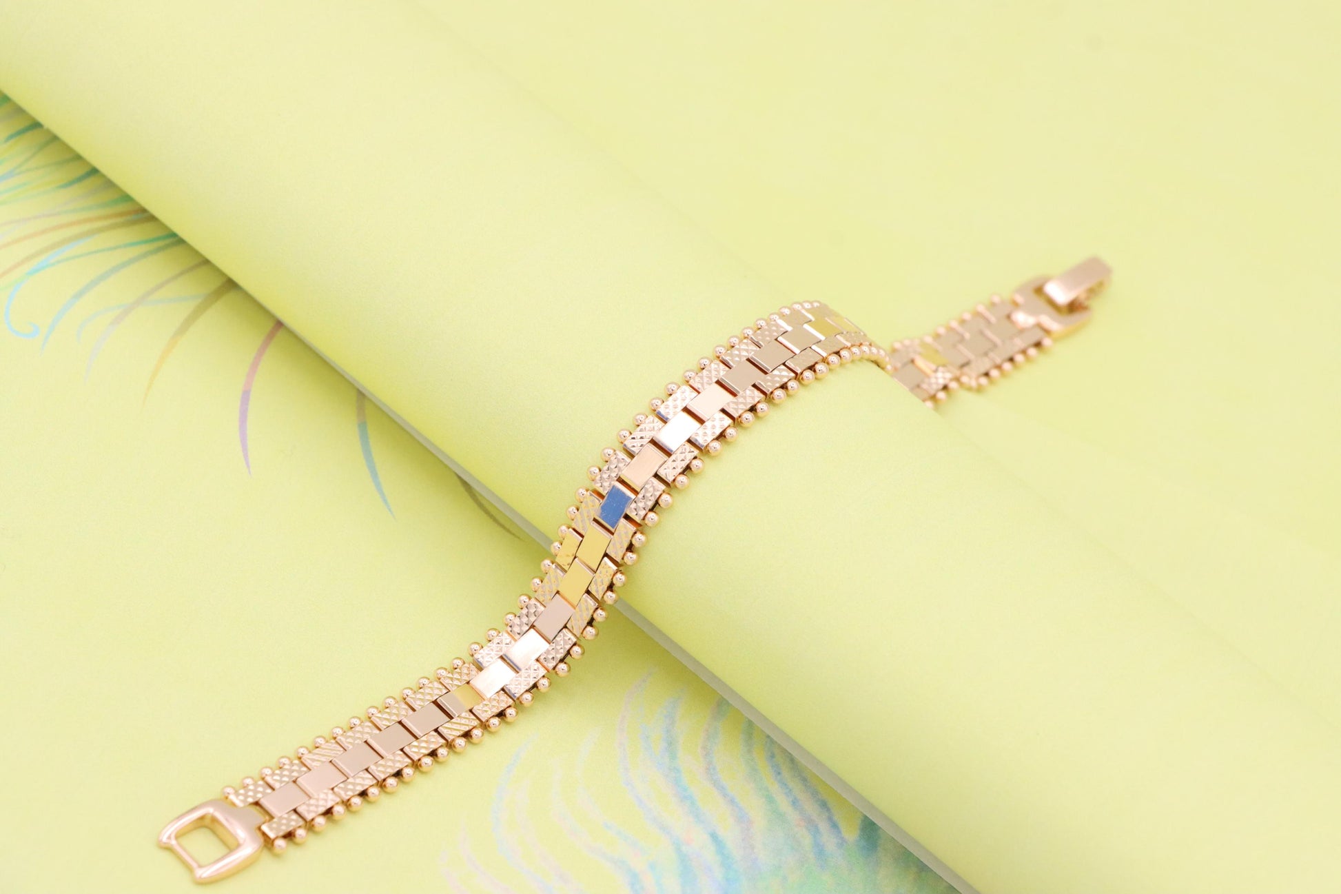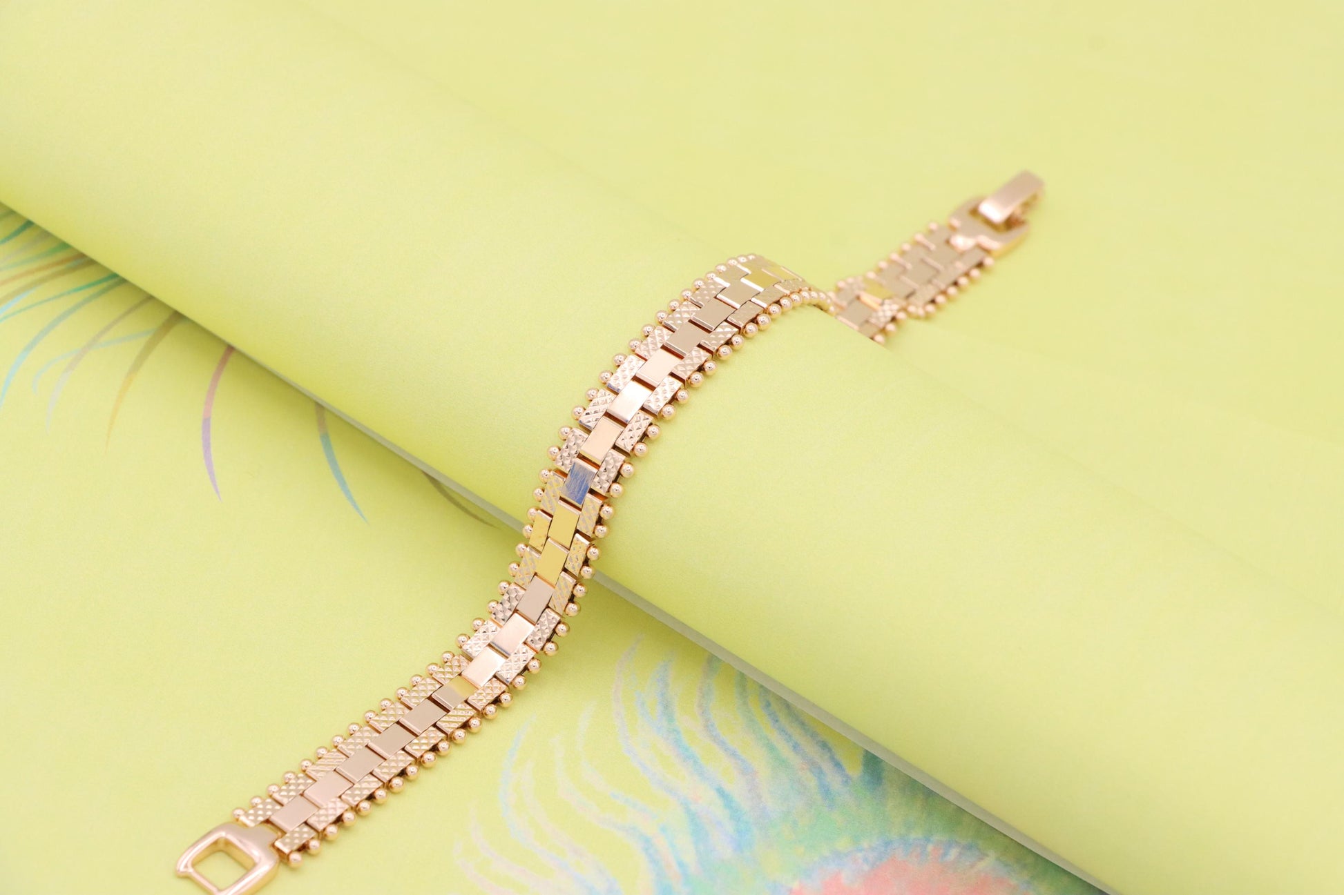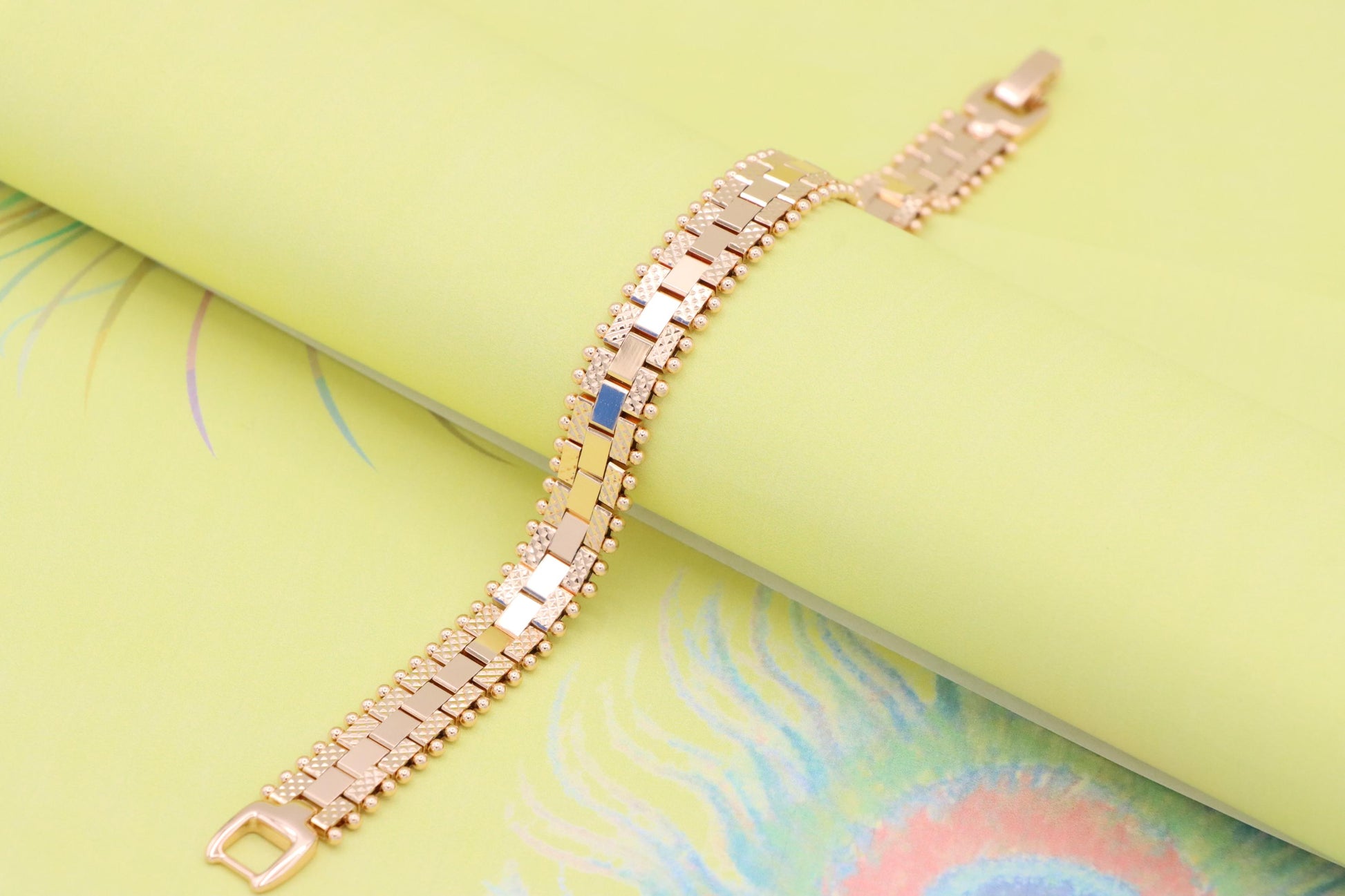Stylish rose gold bracelet crafted with attention to detail, featuring a unique geometric link pattern and delicate beaded accents along the edges. Perfect for casual elegance or gifting.