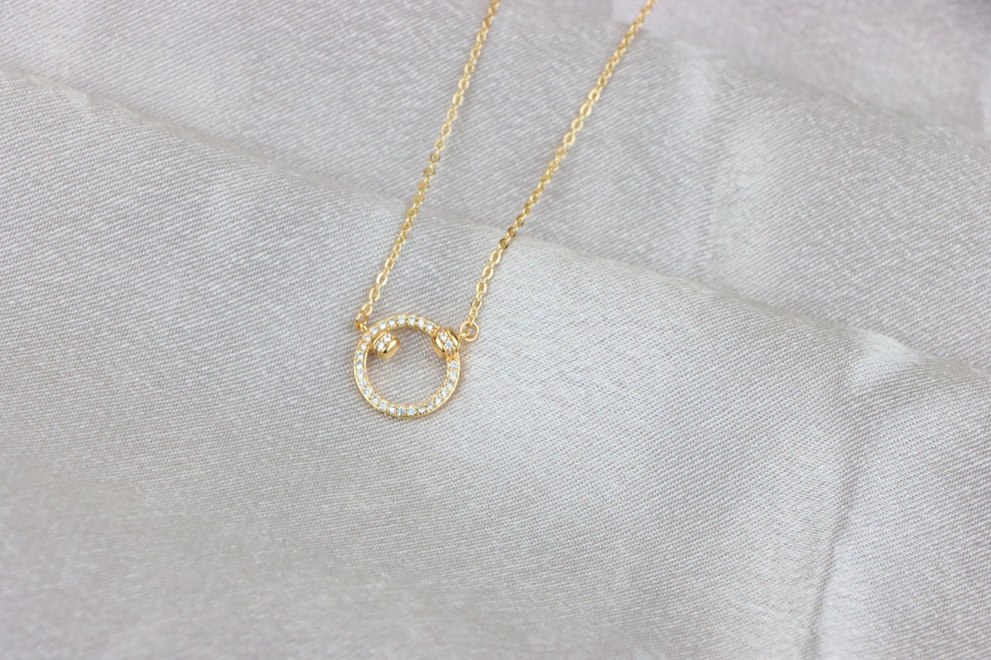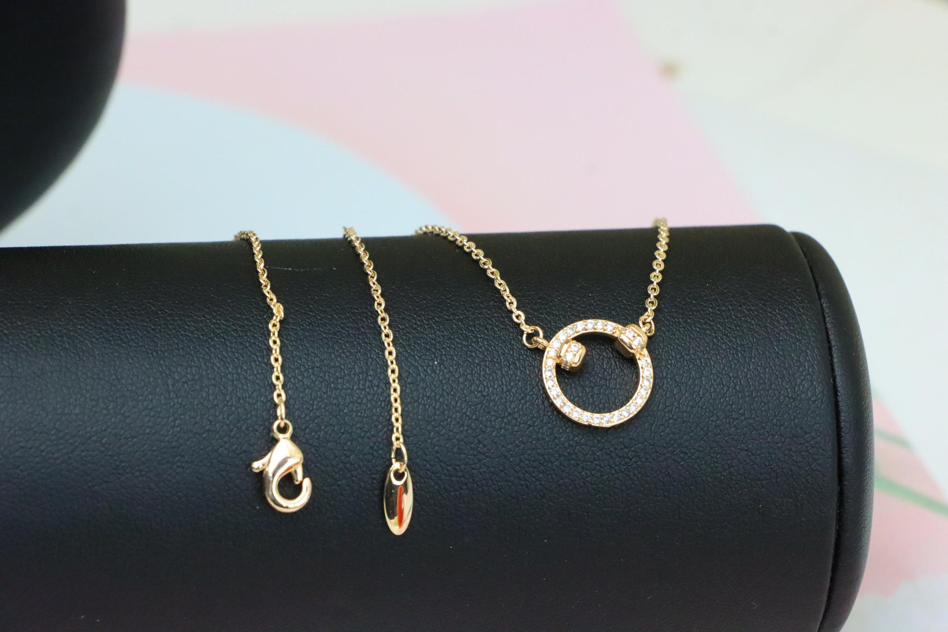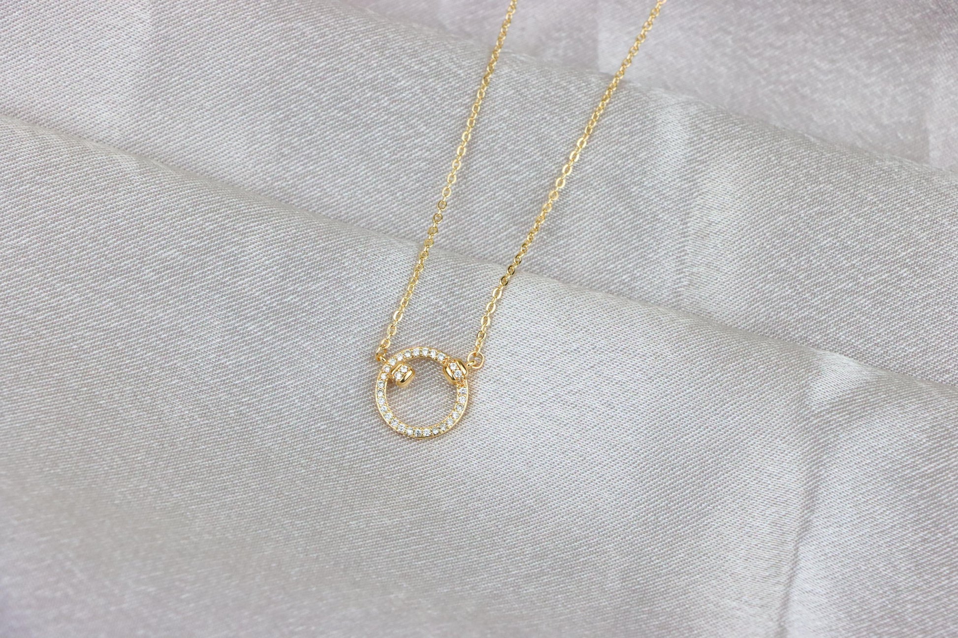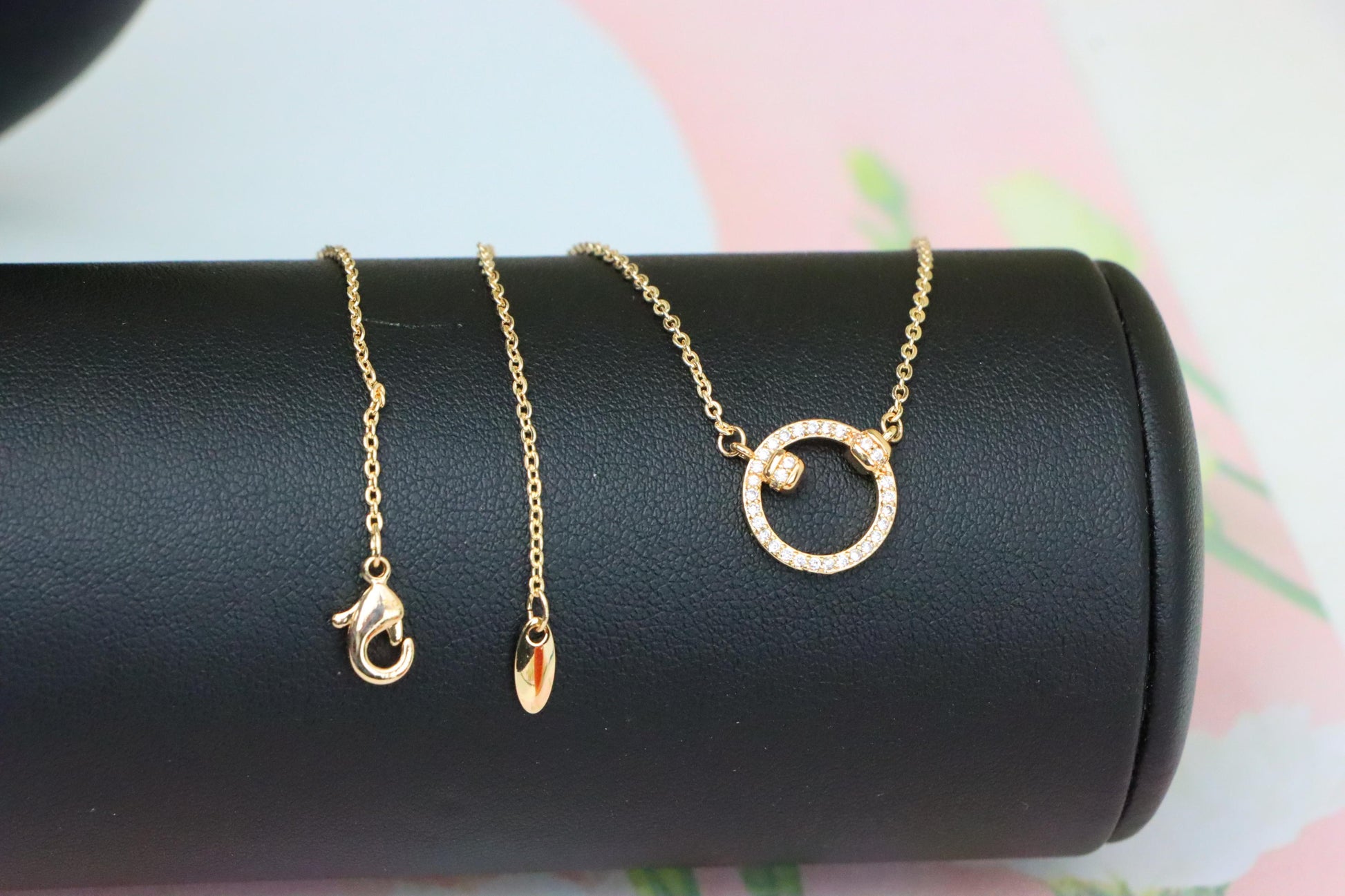 Gold plated over high quality brass, this rose gold necklace is a stunning minimalist piece with a modern circular pendant accentuated by crystal detailing. Necklace length is approximately 18.7 + 2 inches.