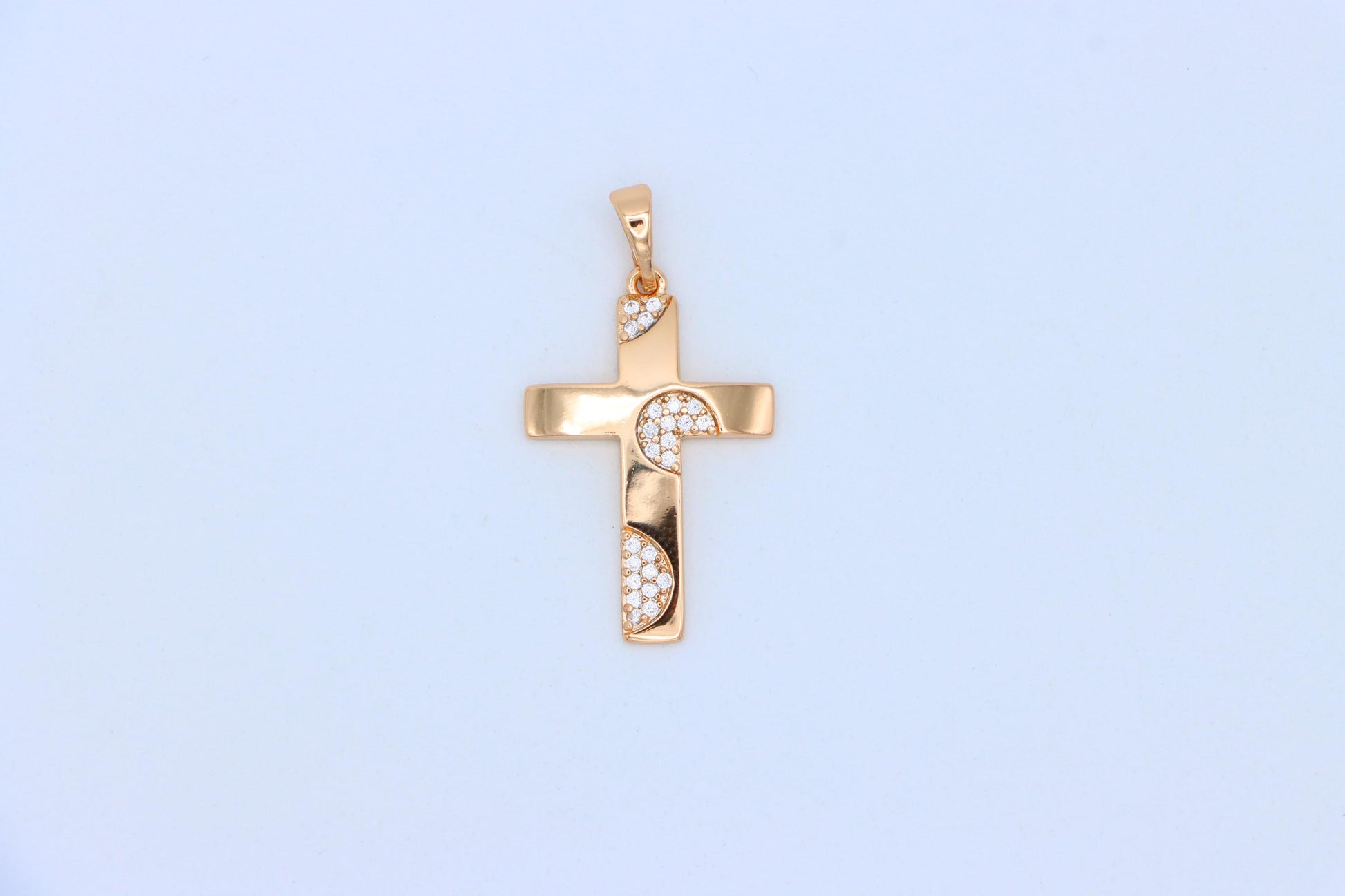 Modern cross design with crescent crystal inlays in a polished rose gold tone.