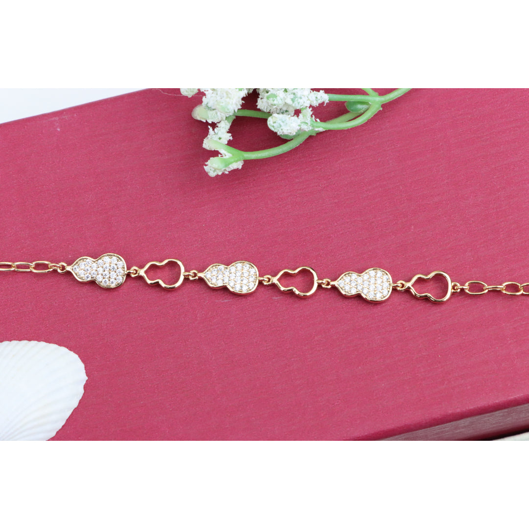 This stunning rose gold bracelet features an alternating gourd-shaped design with shimmering crystals. Crafted from high-quality brass and finished with a luxurious gold plating, it’s both durable and beautifully eye-catching.