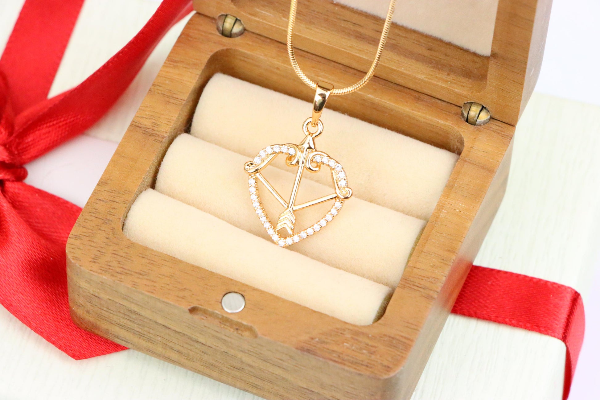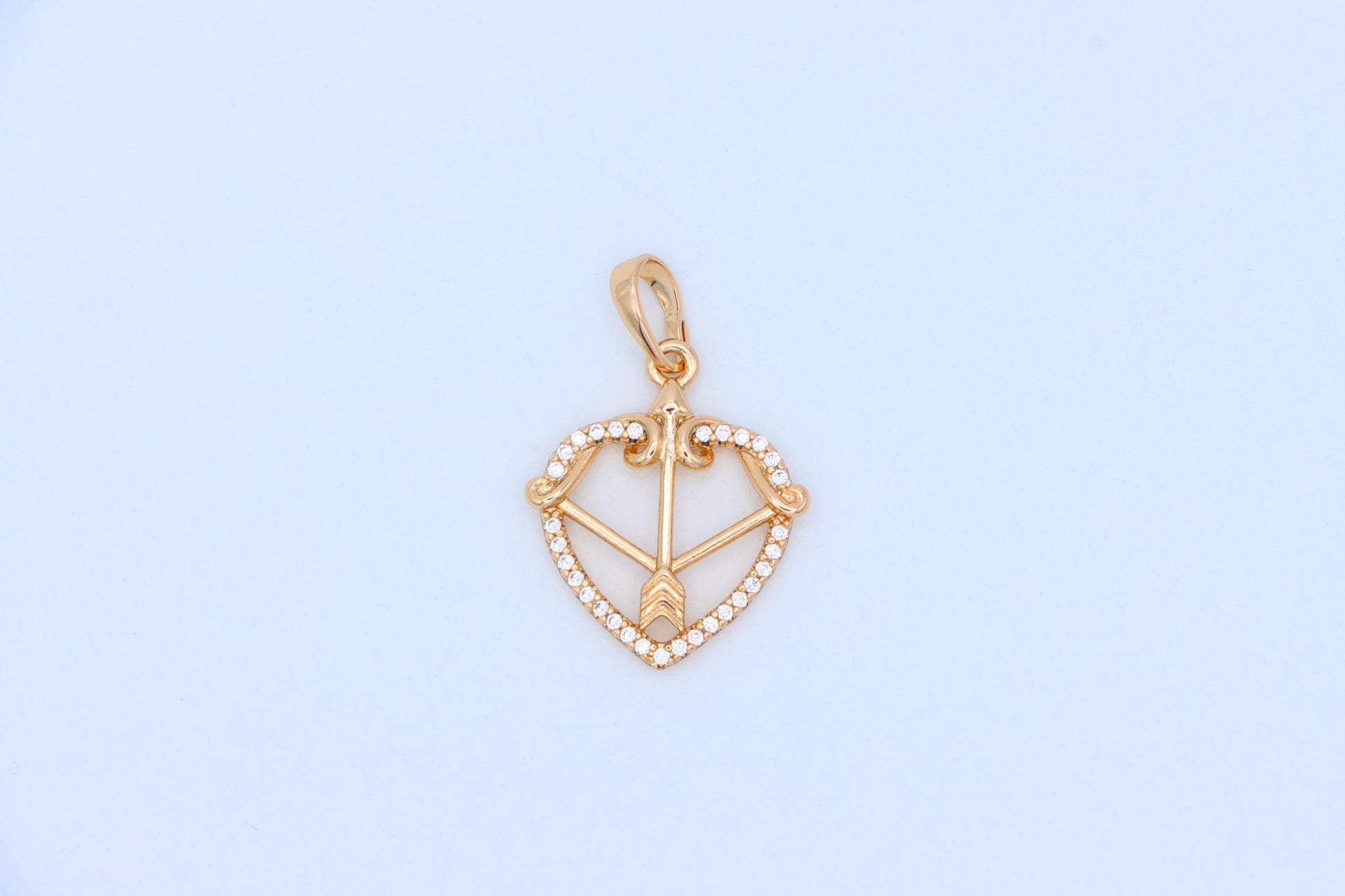 Dazzling heart-shaped pendant featuring a detailed arrow design, crafted in rose gold over high-quality brass. A graceful accessory that adds charm to any outfit.