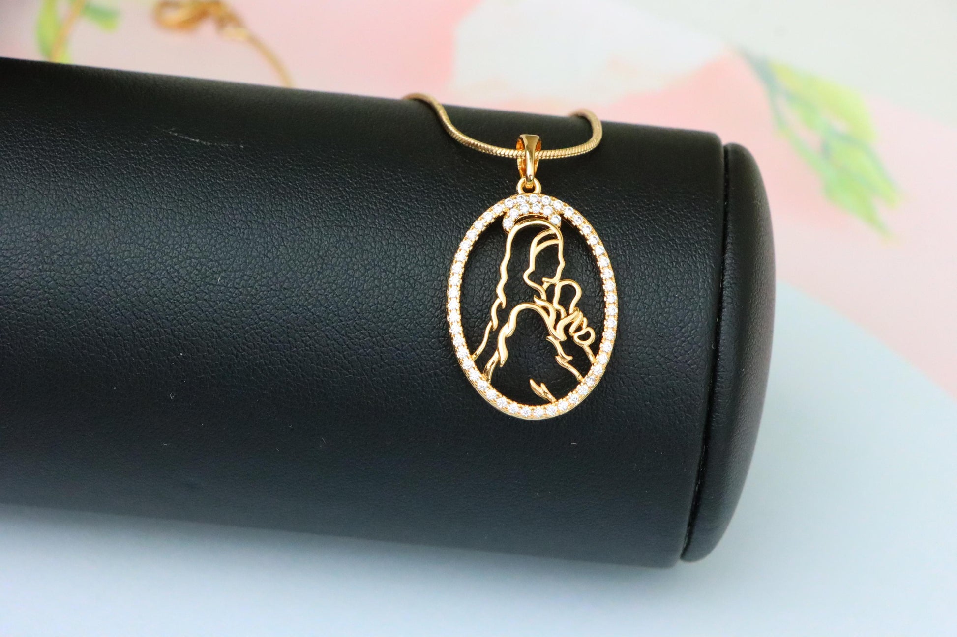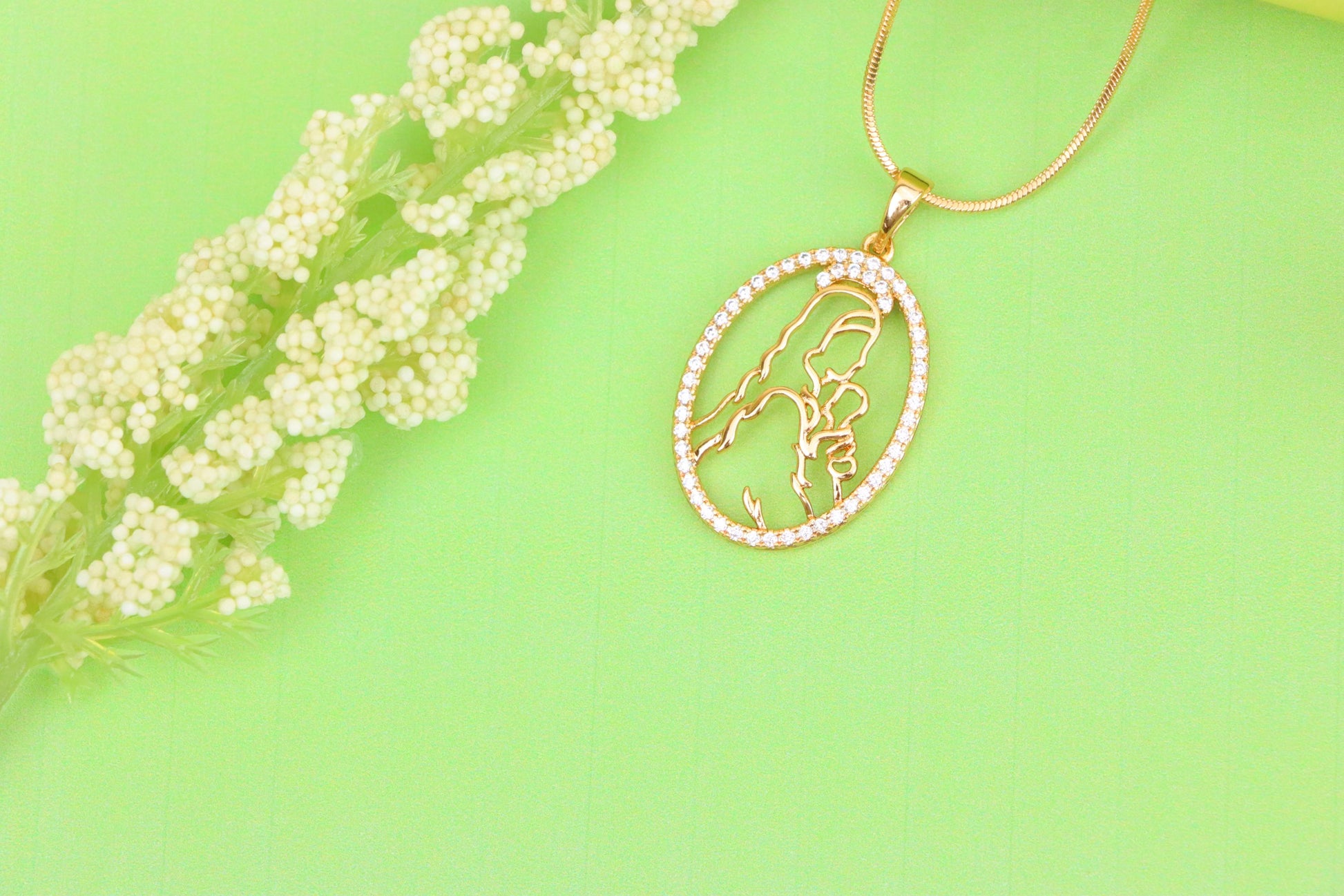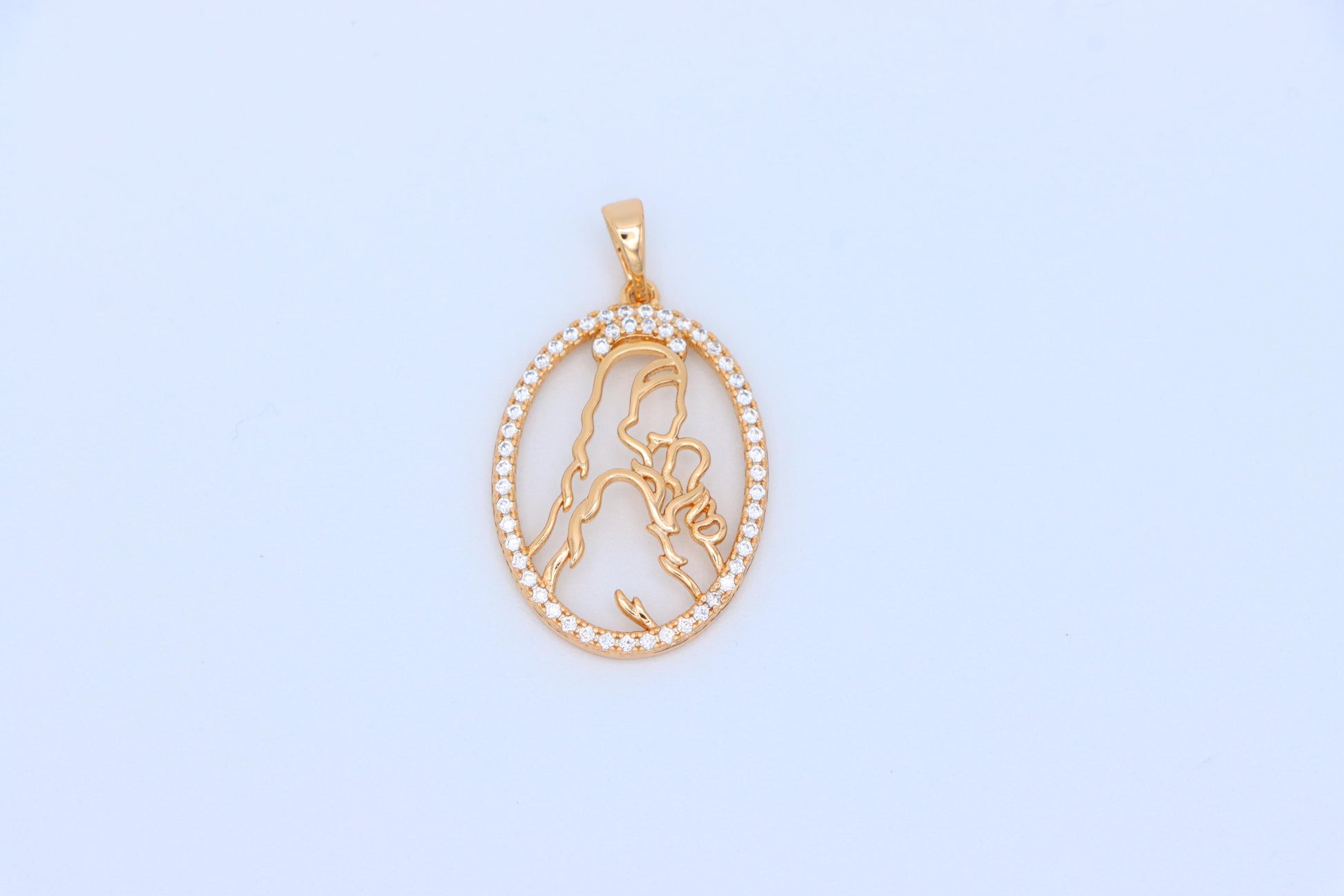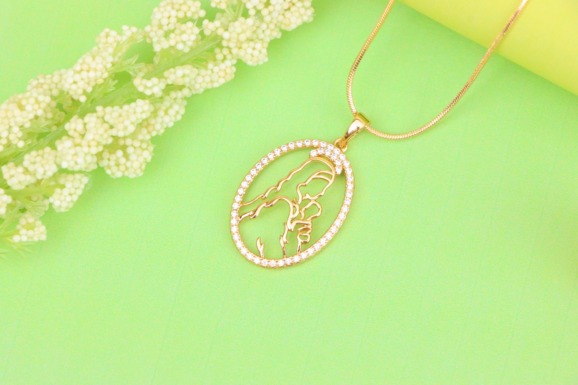 Celebrate the purest bond with this beautifully crafted mother and child pendant, outlined in a shimmering oval frame.