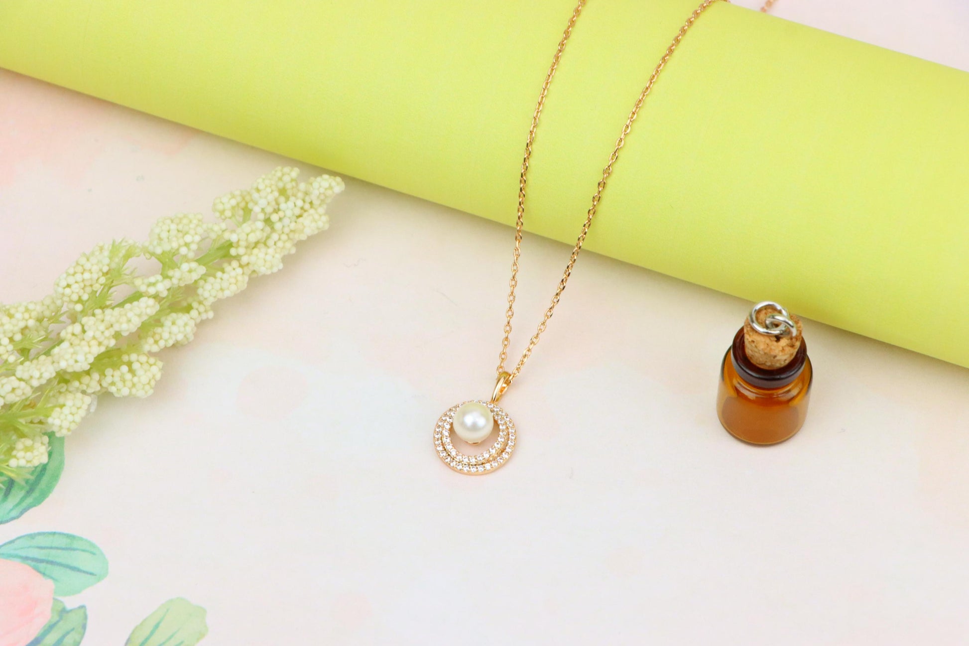 Elegant Rose Gold Pearl Pendant Necklace with Double Halo Design, XPNL1902 (2161-5)