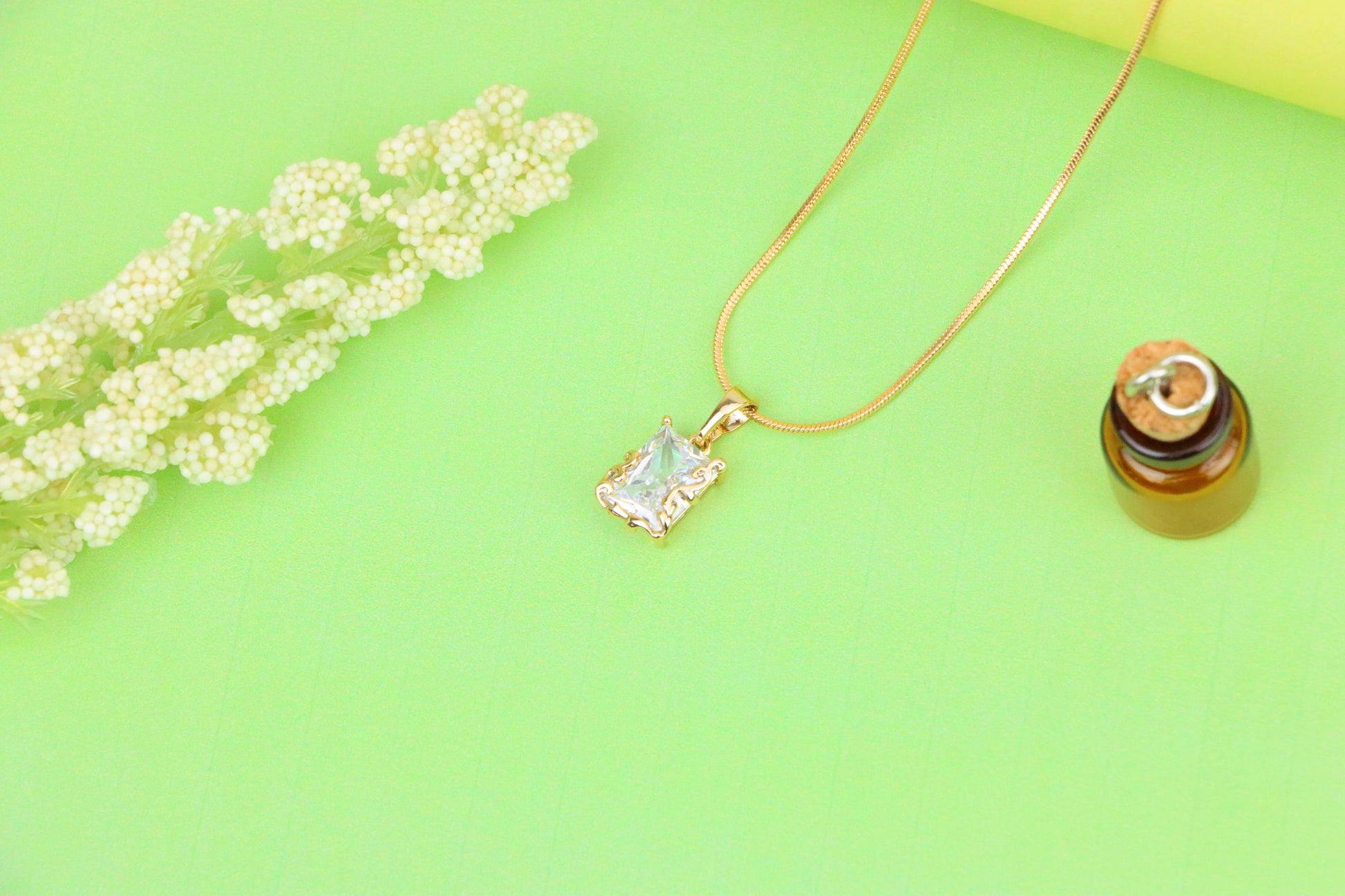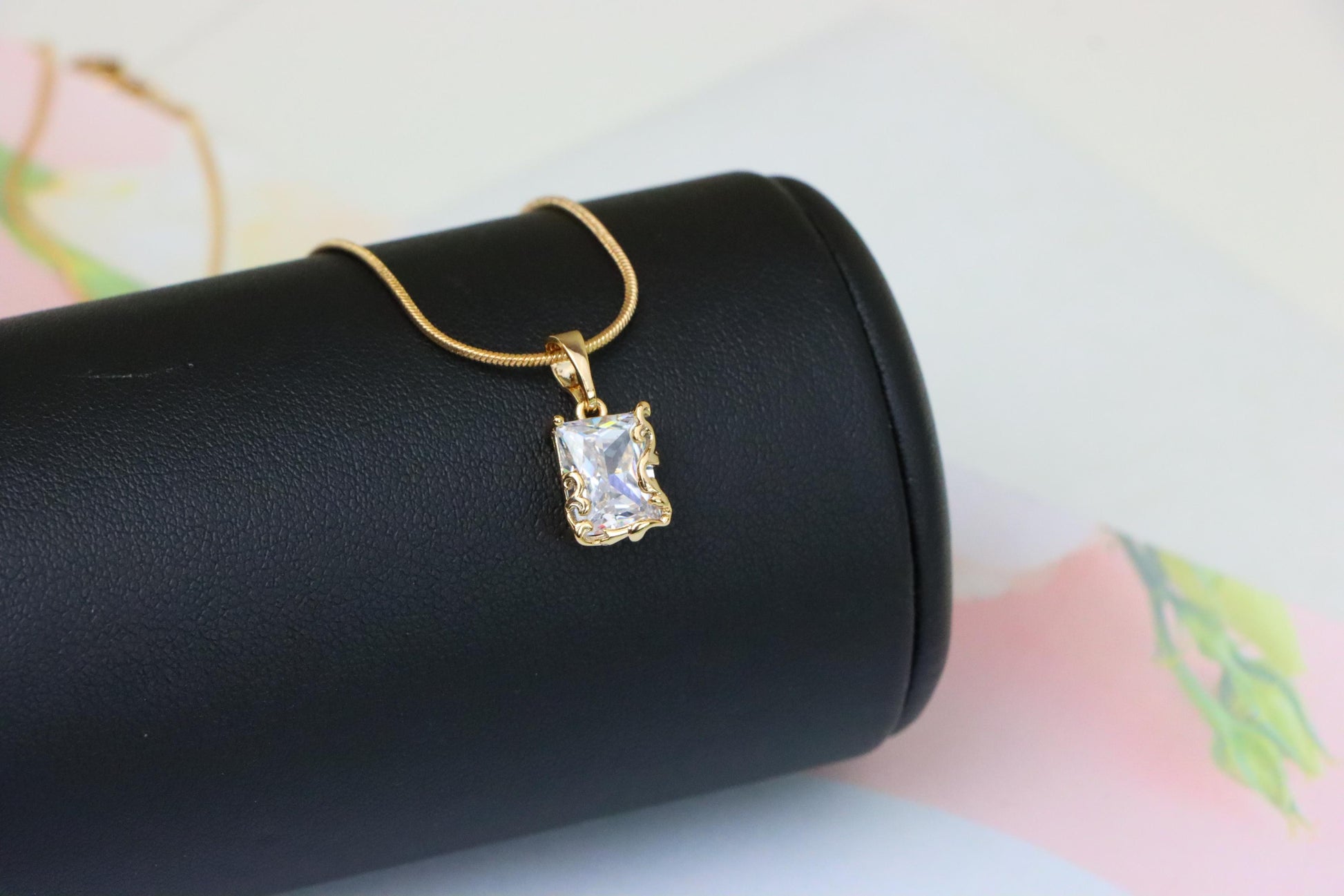 A dainty and luxurious pendant featuring a radiant rectangular crystal set in a beautifully ornate rose gold frame. A perfect piece for a refined, minimal yet striking look.