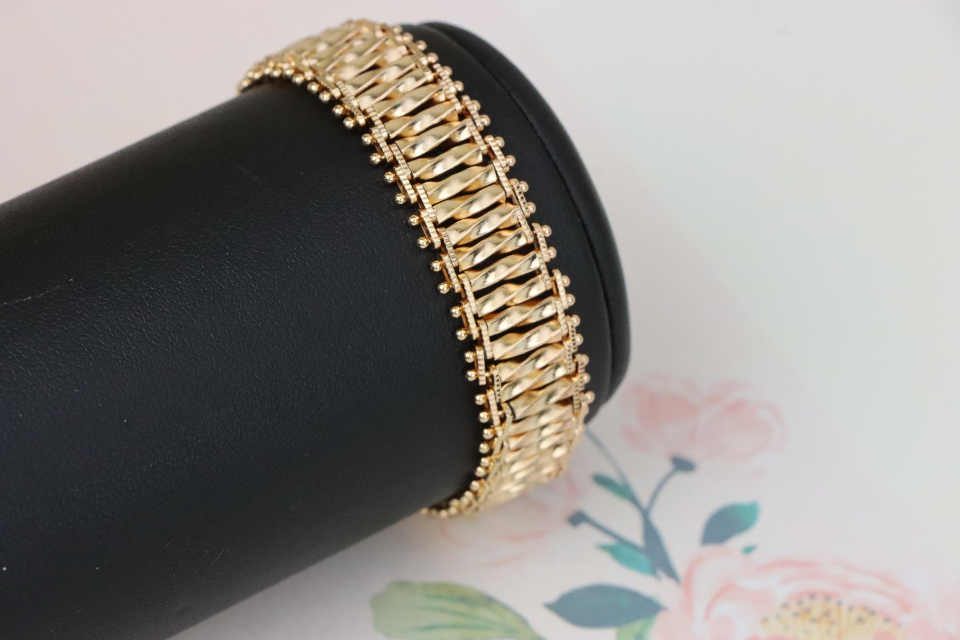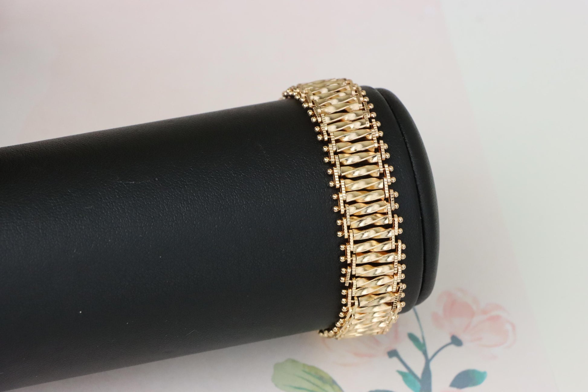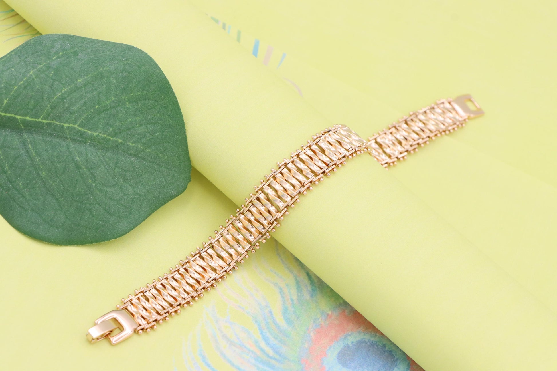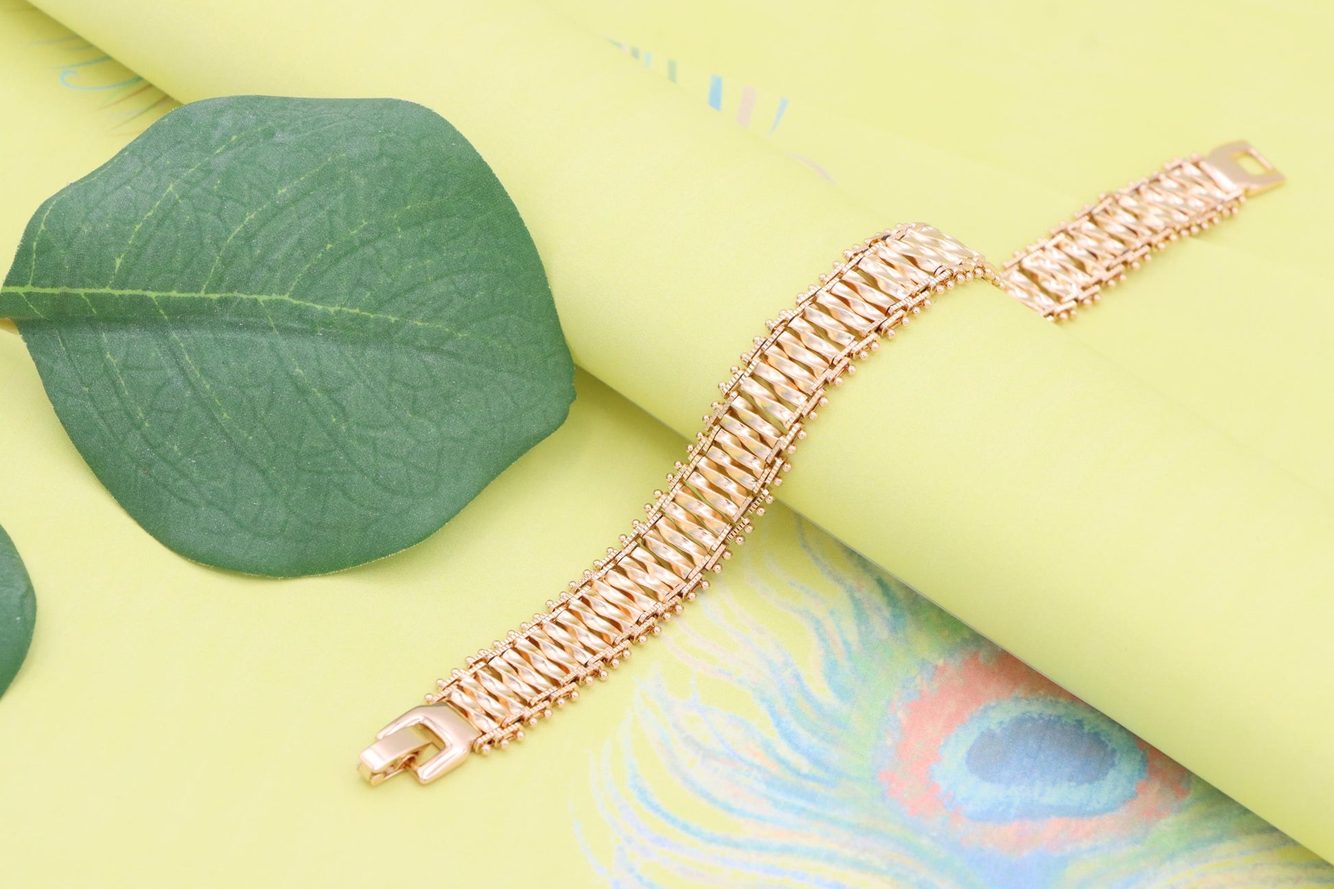 Crafted for timeless elegance, this rose gold bracelet showcases a unique wide-link design with intricate detailing, ideal for elevating everyday style or accentuating special occasion wear.