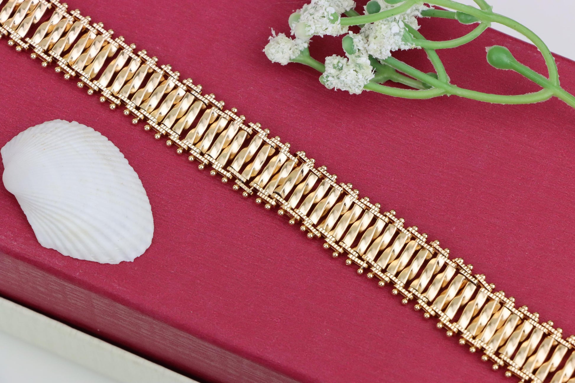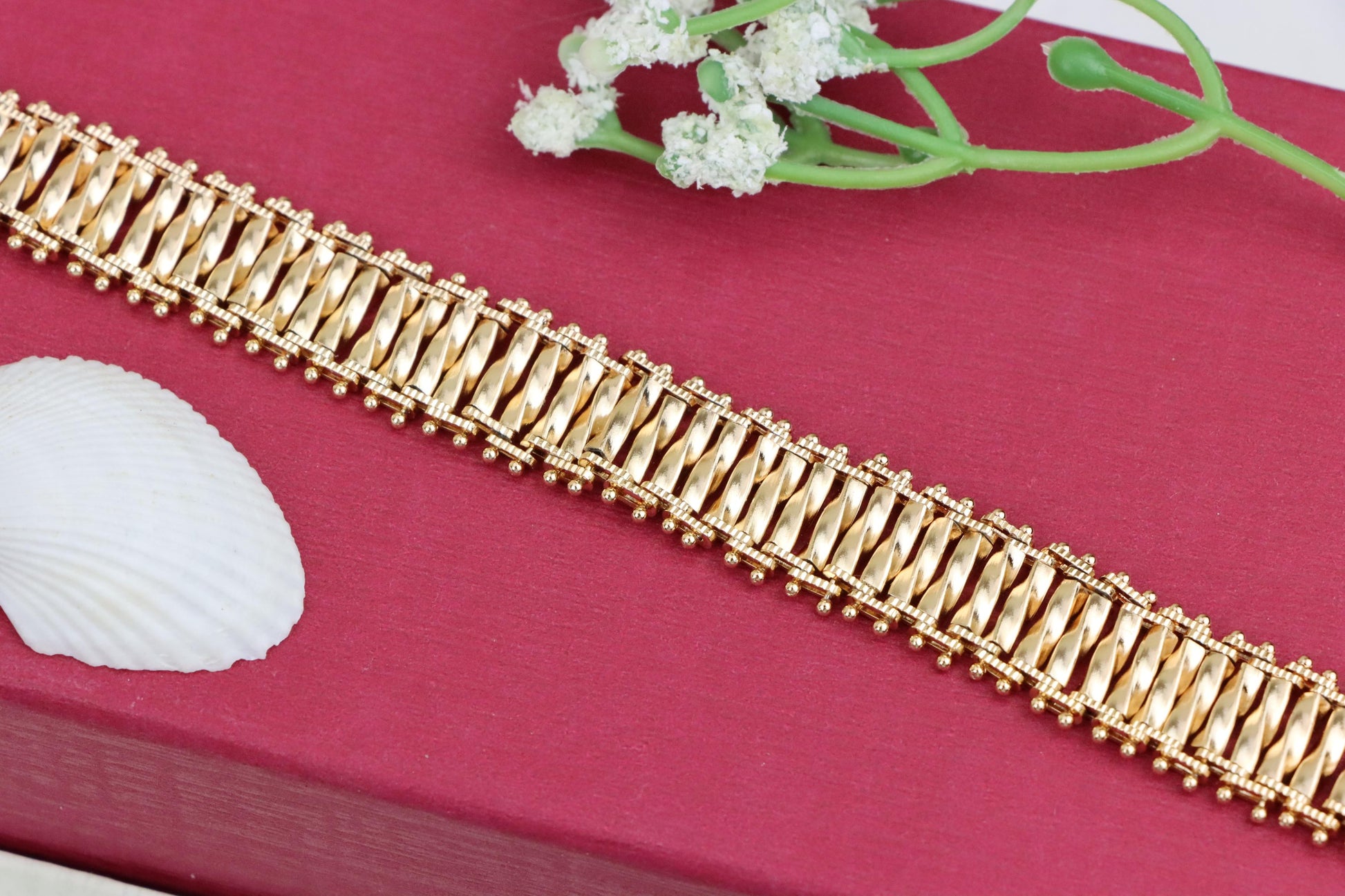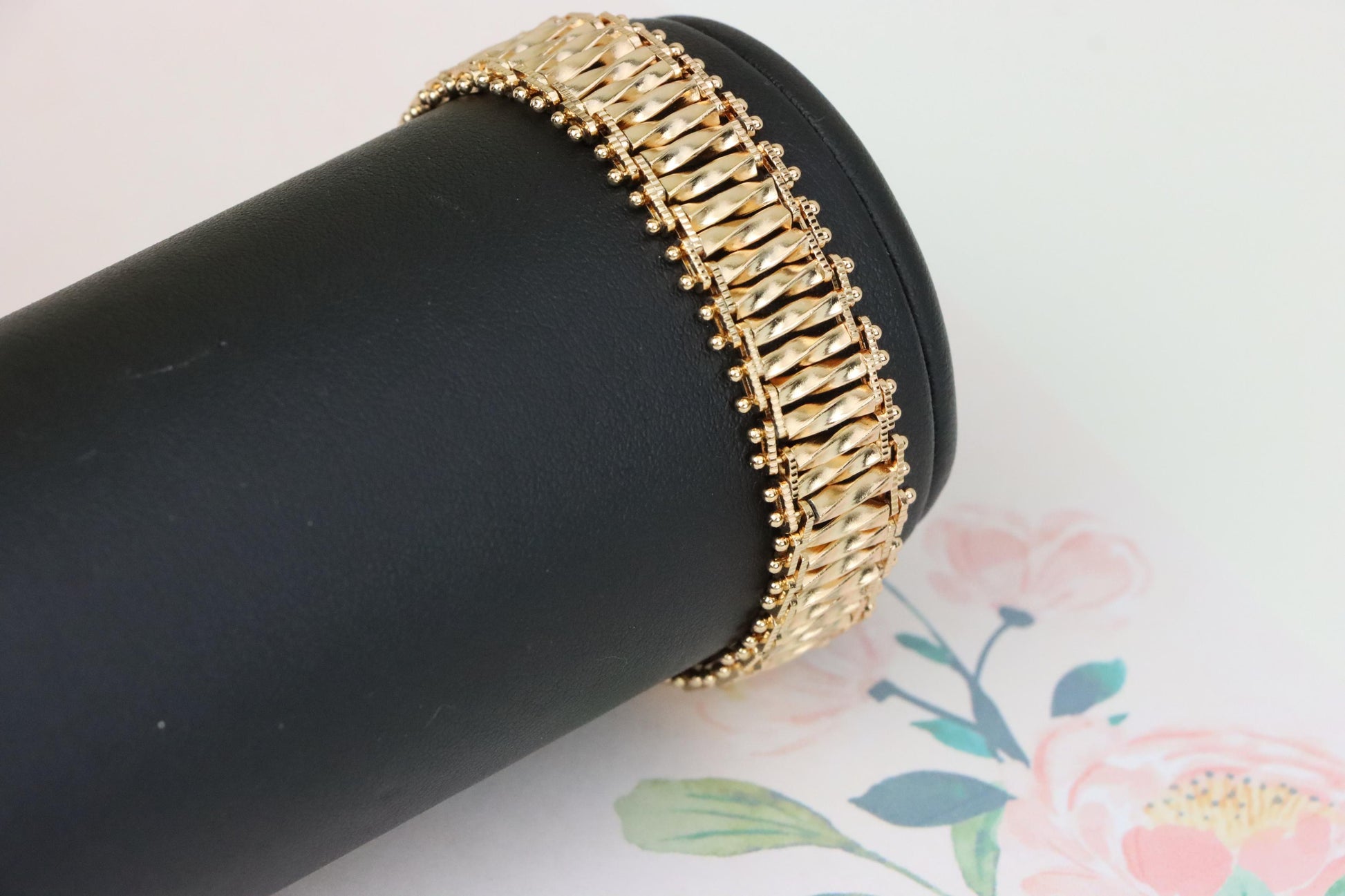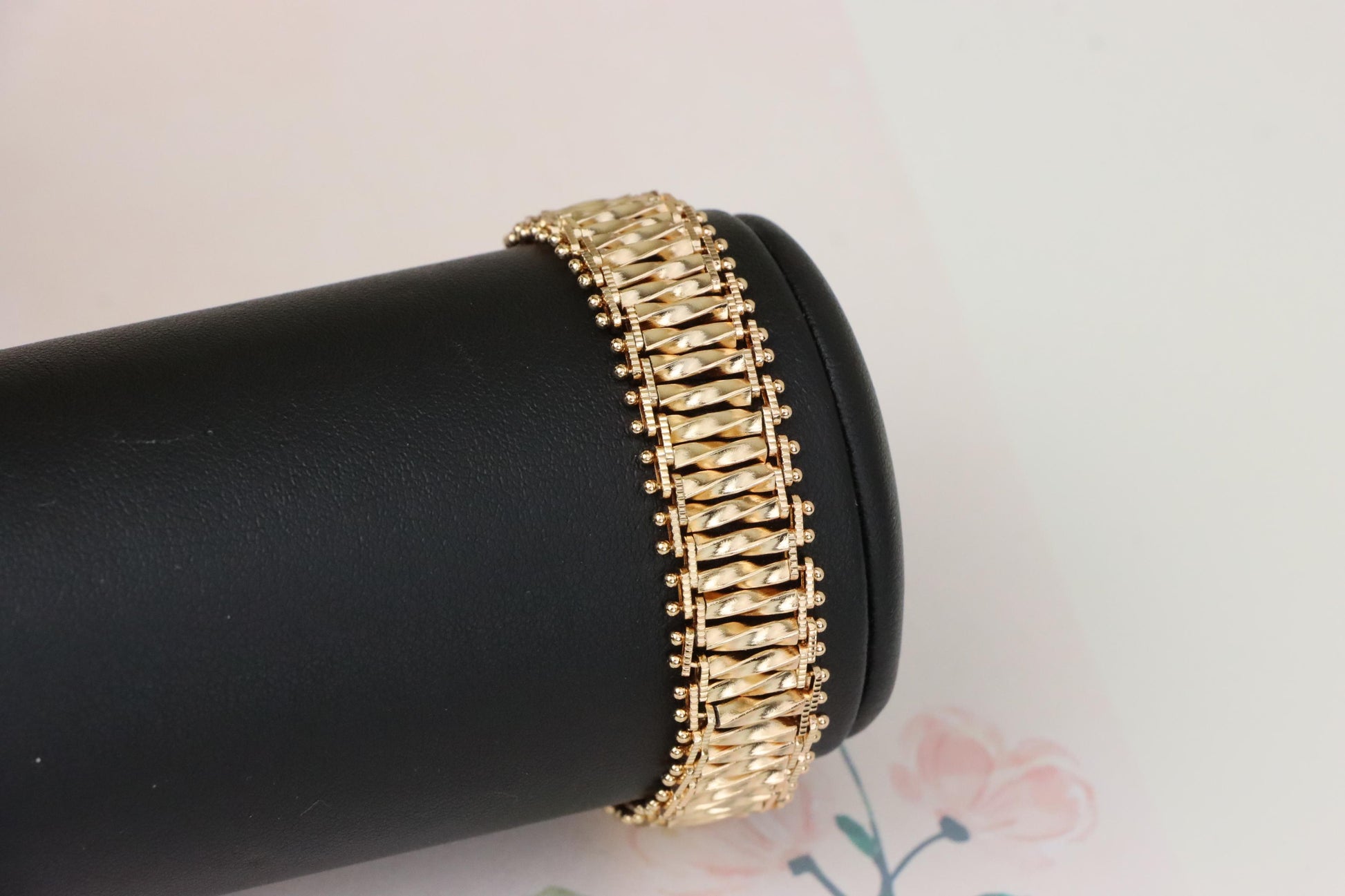 Crafted for timeless elegance, this rose gold bracelet showcases a unique wide-link design with intricate detailing, ideal for elevating everyday style or accentuating special occasion wear.