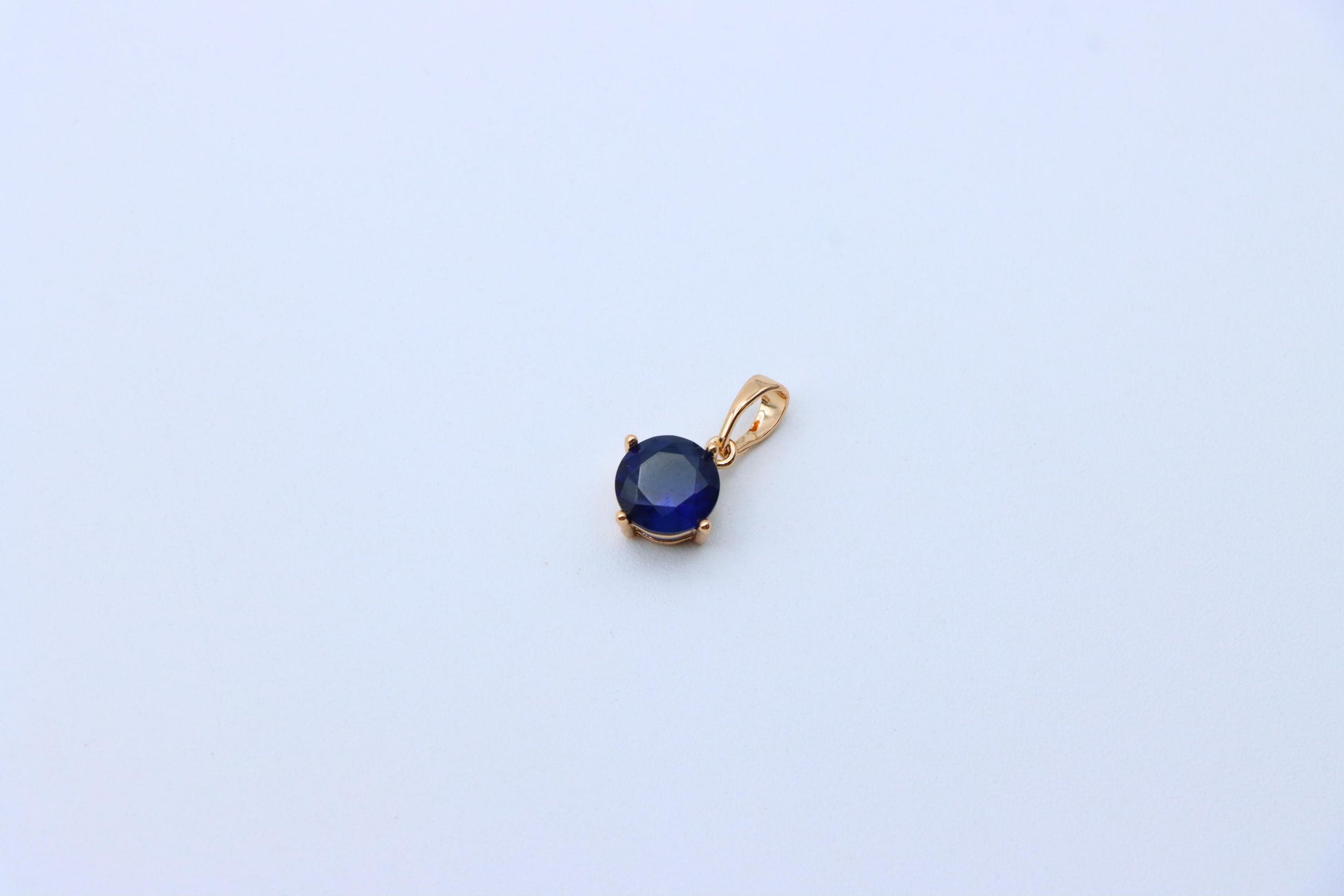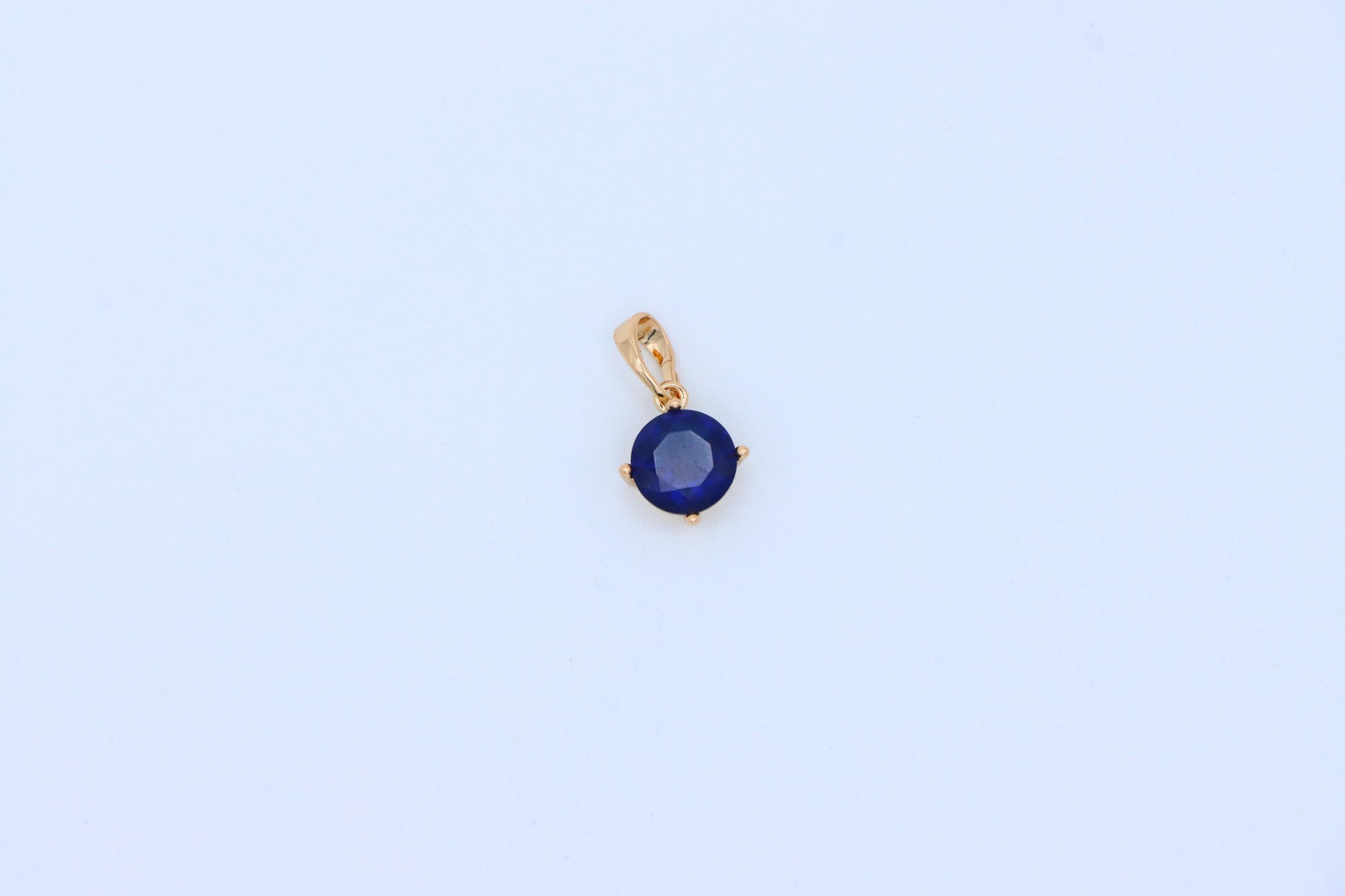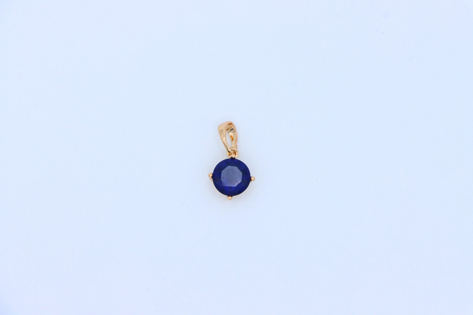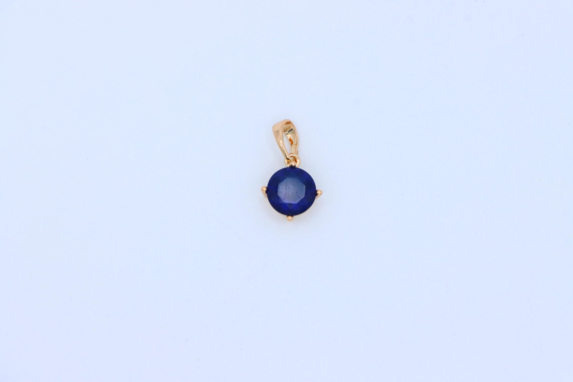 This classic round pendant features a deep blue stone set in a rose gold-plated frame, offering a touch of sophistication and charm. Its compact size makes it perfect for daily wear or layering with other pieces.