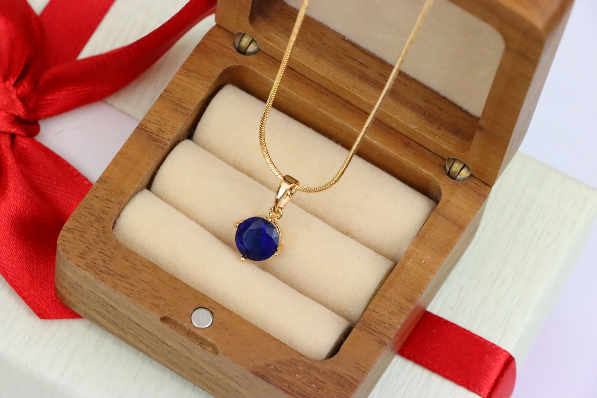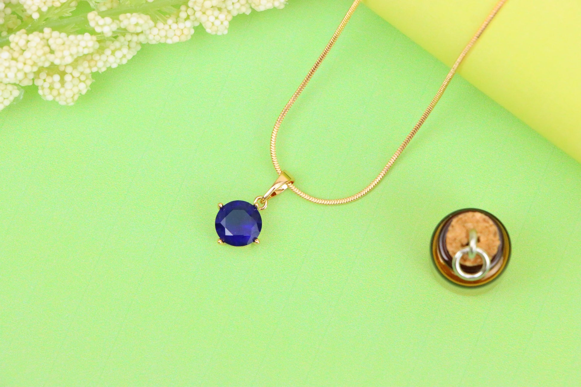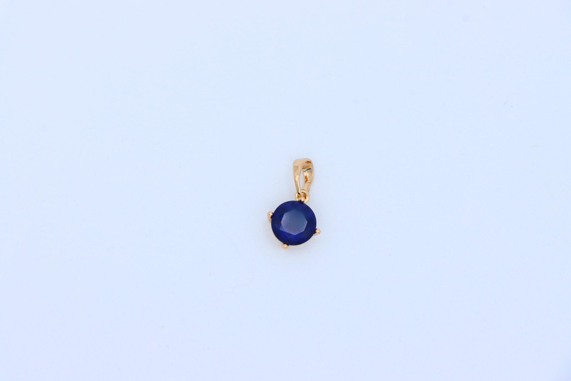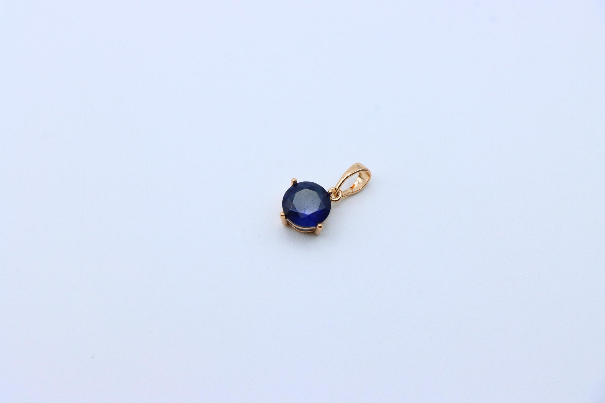 This classic round pendant features a deep blue stone set in a rose gold-plated frame, offering a touch of sophistication and charm. Its compact size makes it perfect for daily wear or layering with other pieces.