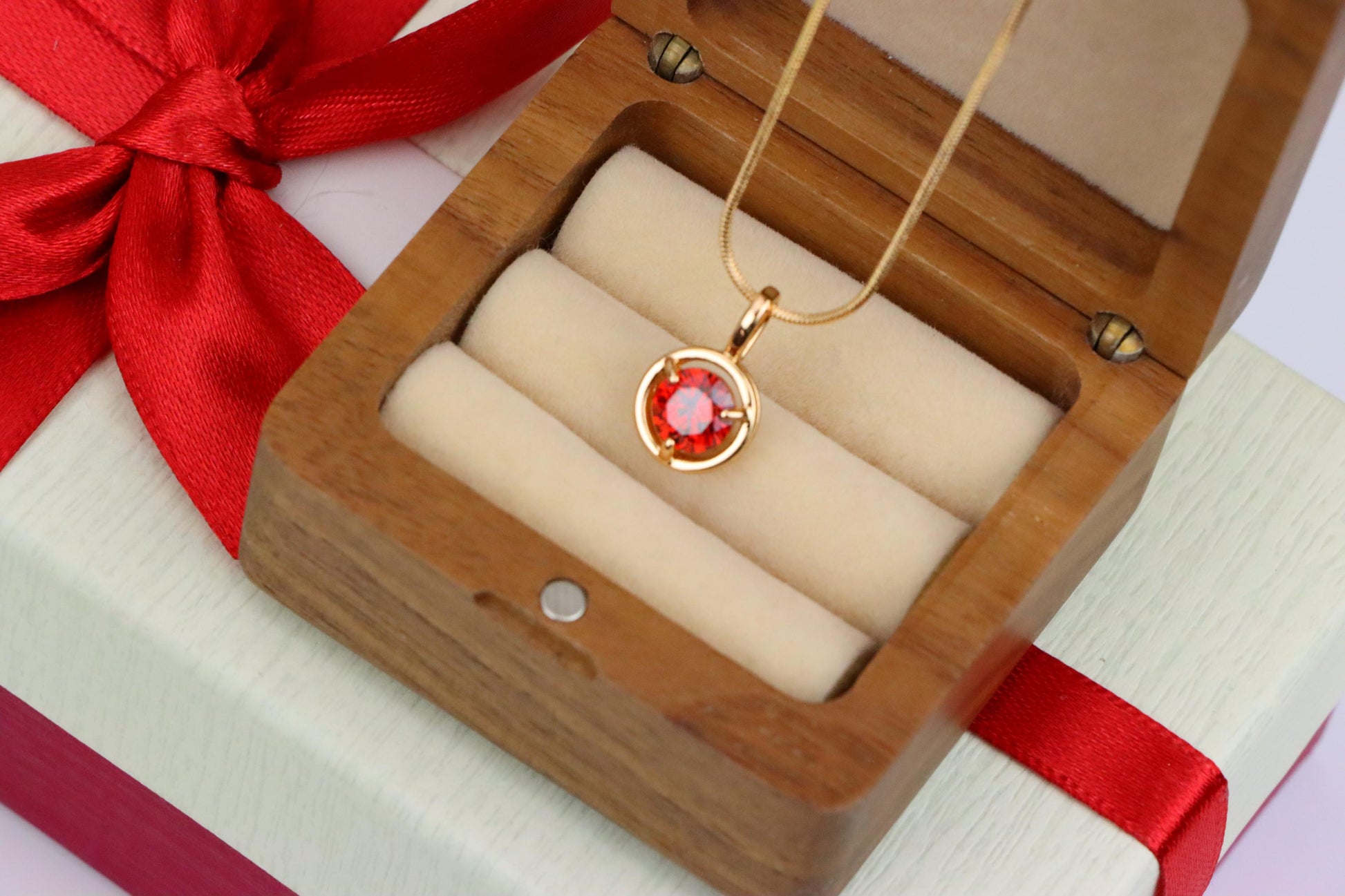 Radiant red crystal framed in a sleek round gold bezel, perfect for gifting.
