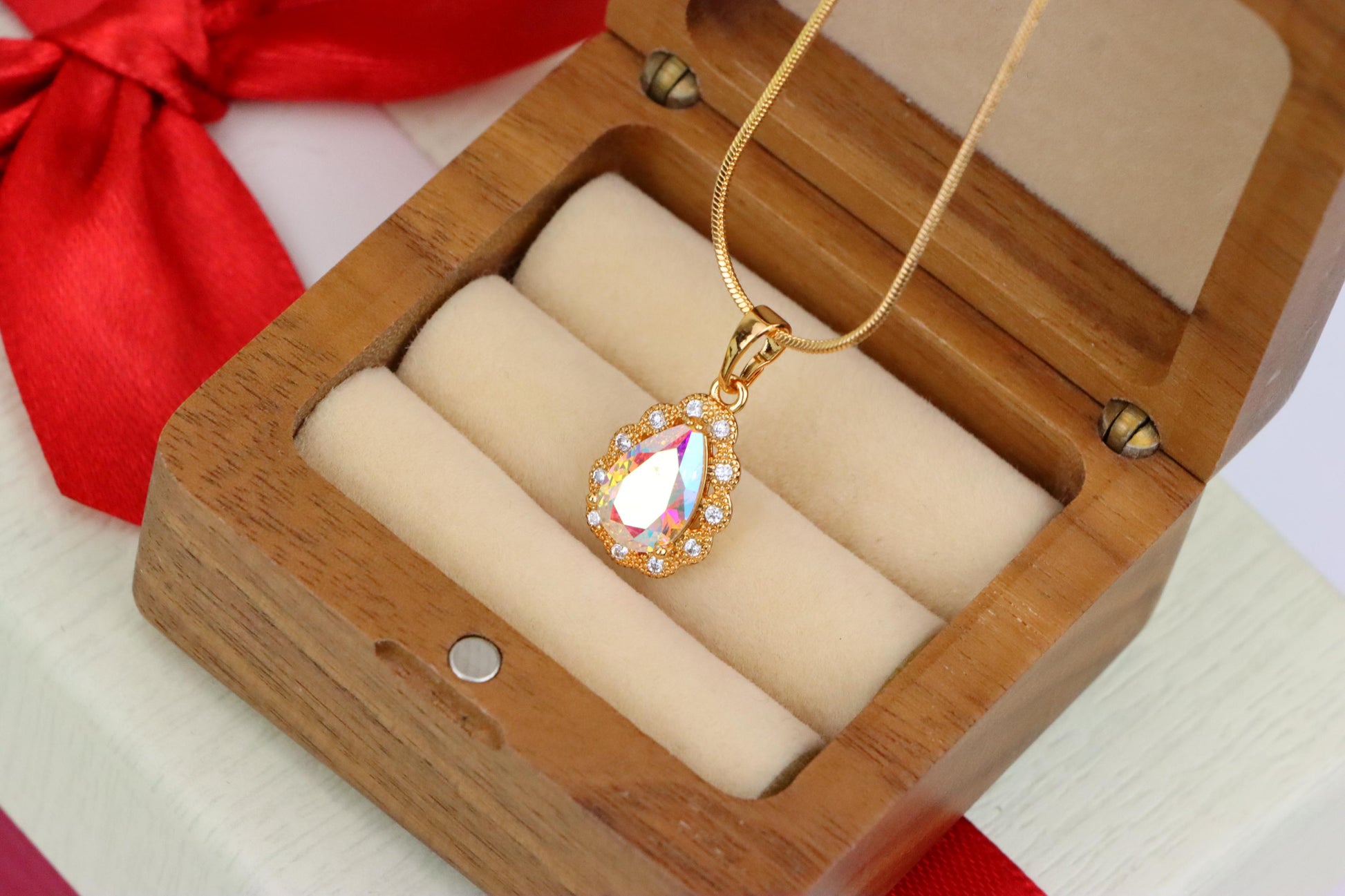 ✔ Iridescent teardrop centerpiece with halo of white stones