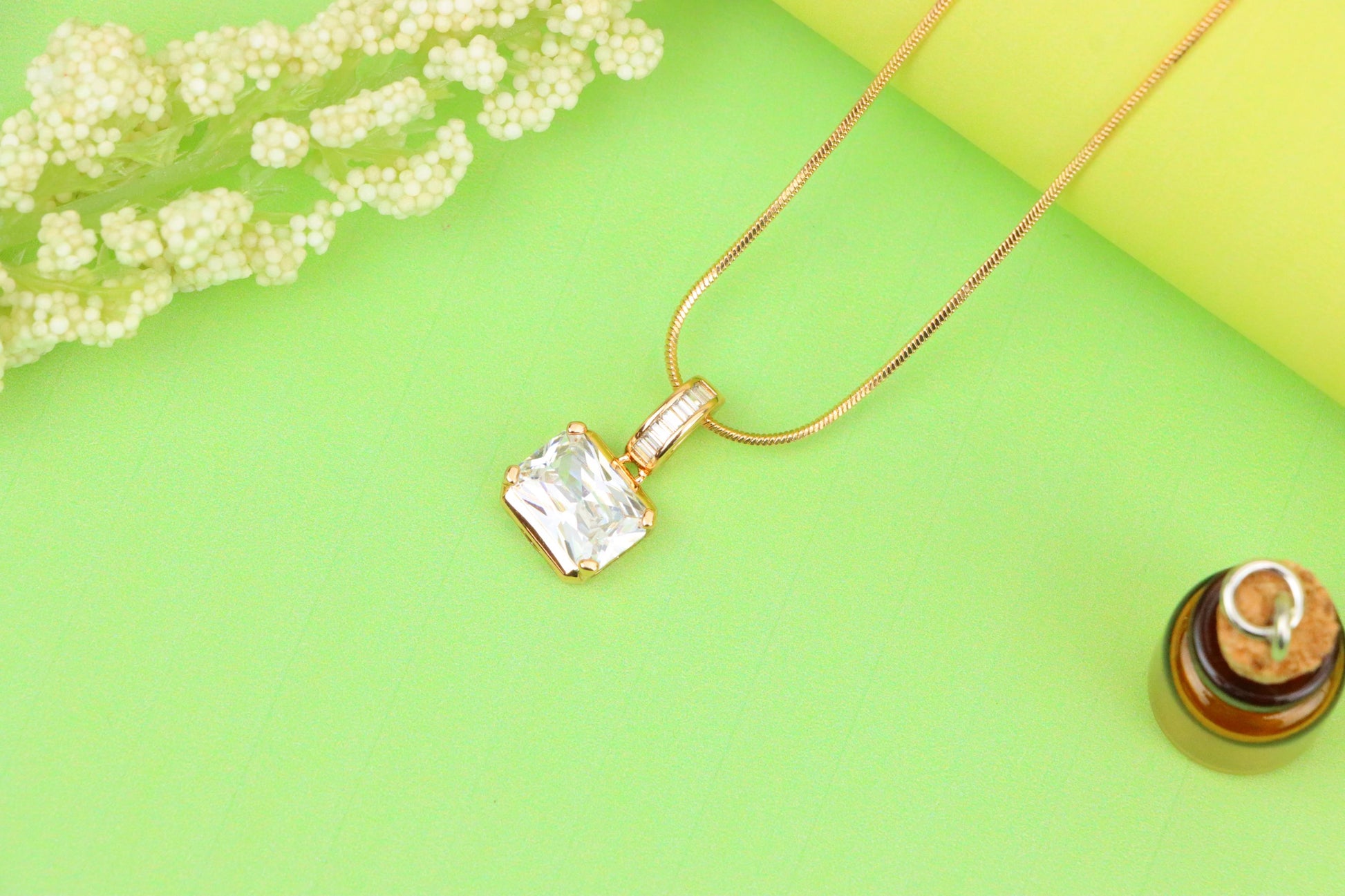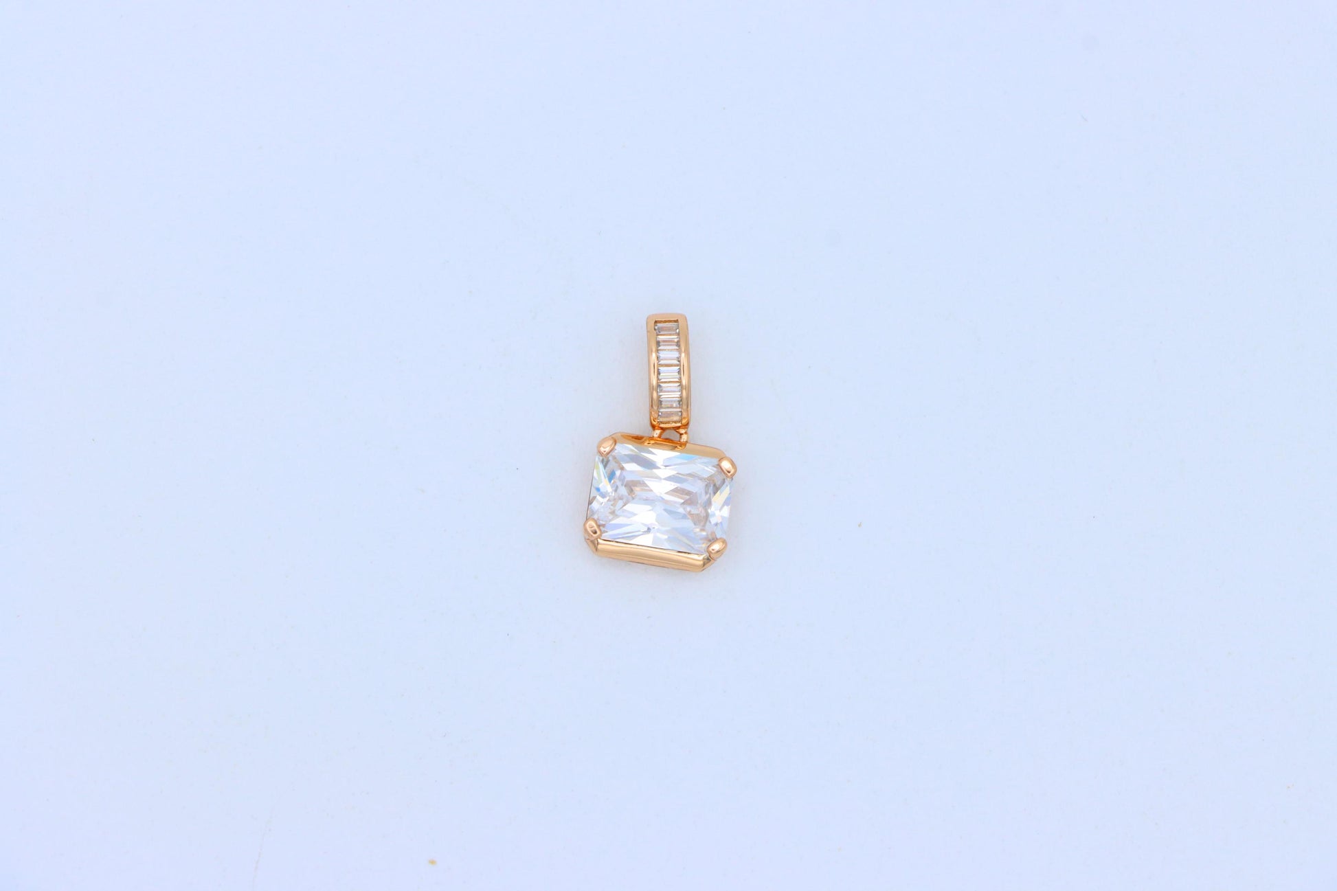 A stunning white stone pendant, beautifully set in gold-plated brass with a sleek baguette-accented bail, ideal for everyday elegance or special occasions.