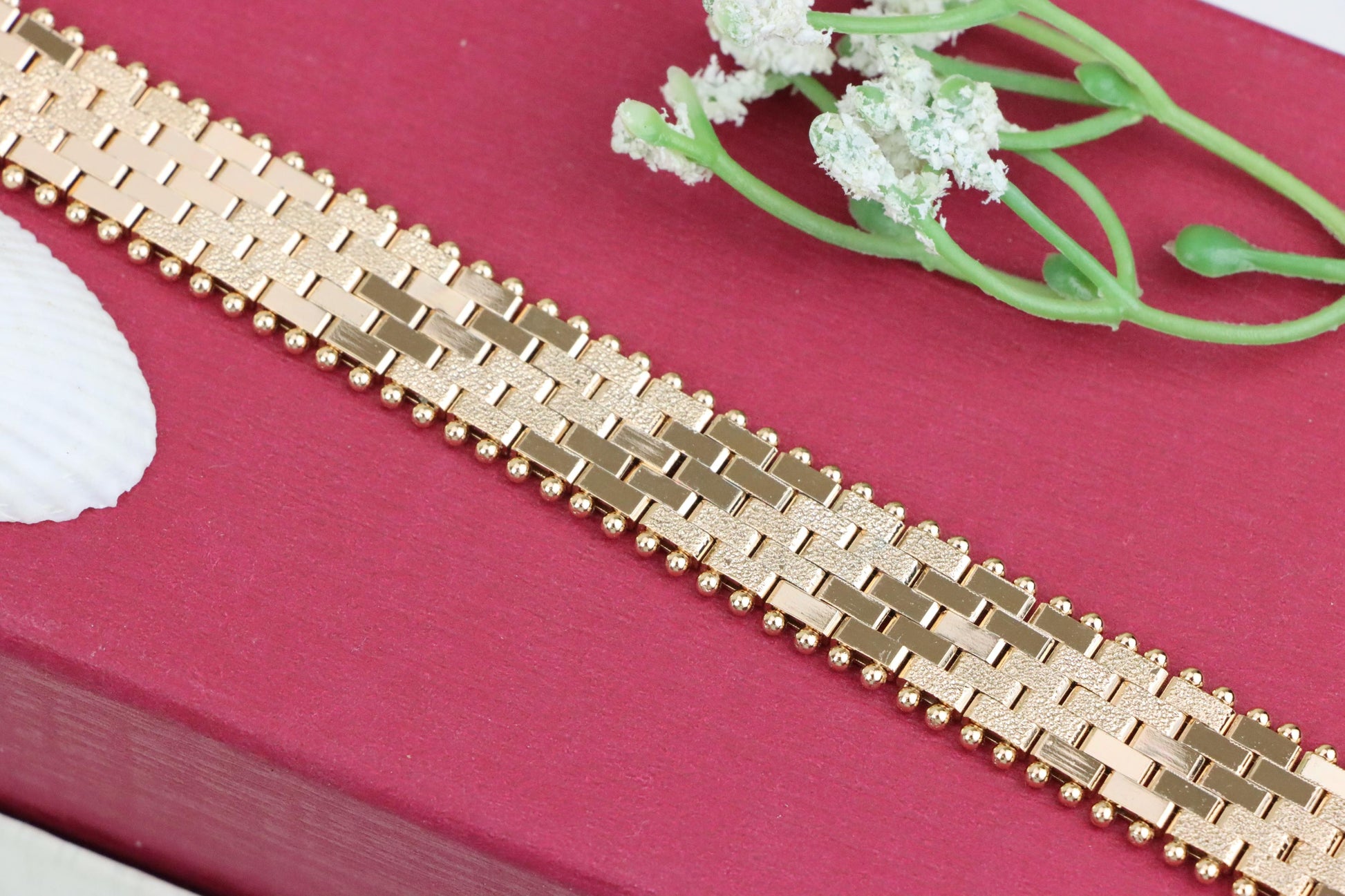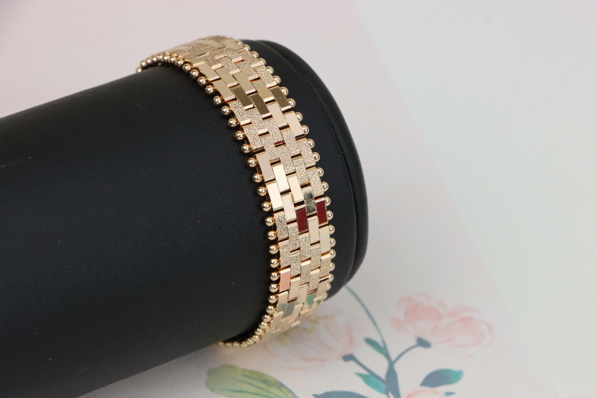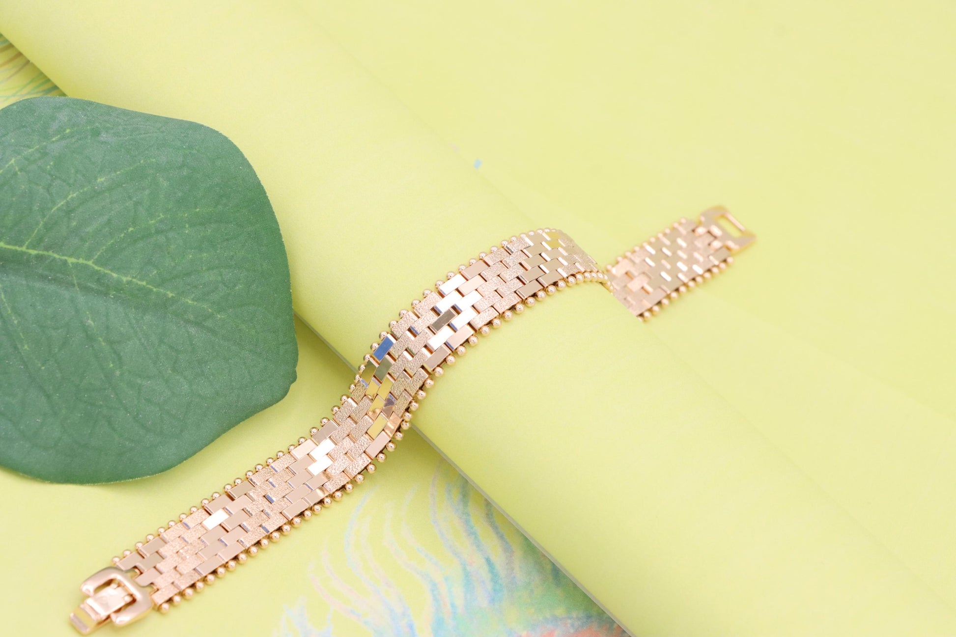 Chic and luxurious bracelet crafted in rose gold finish with a modern wide link pattern and intricate beaded edging for a standout look.