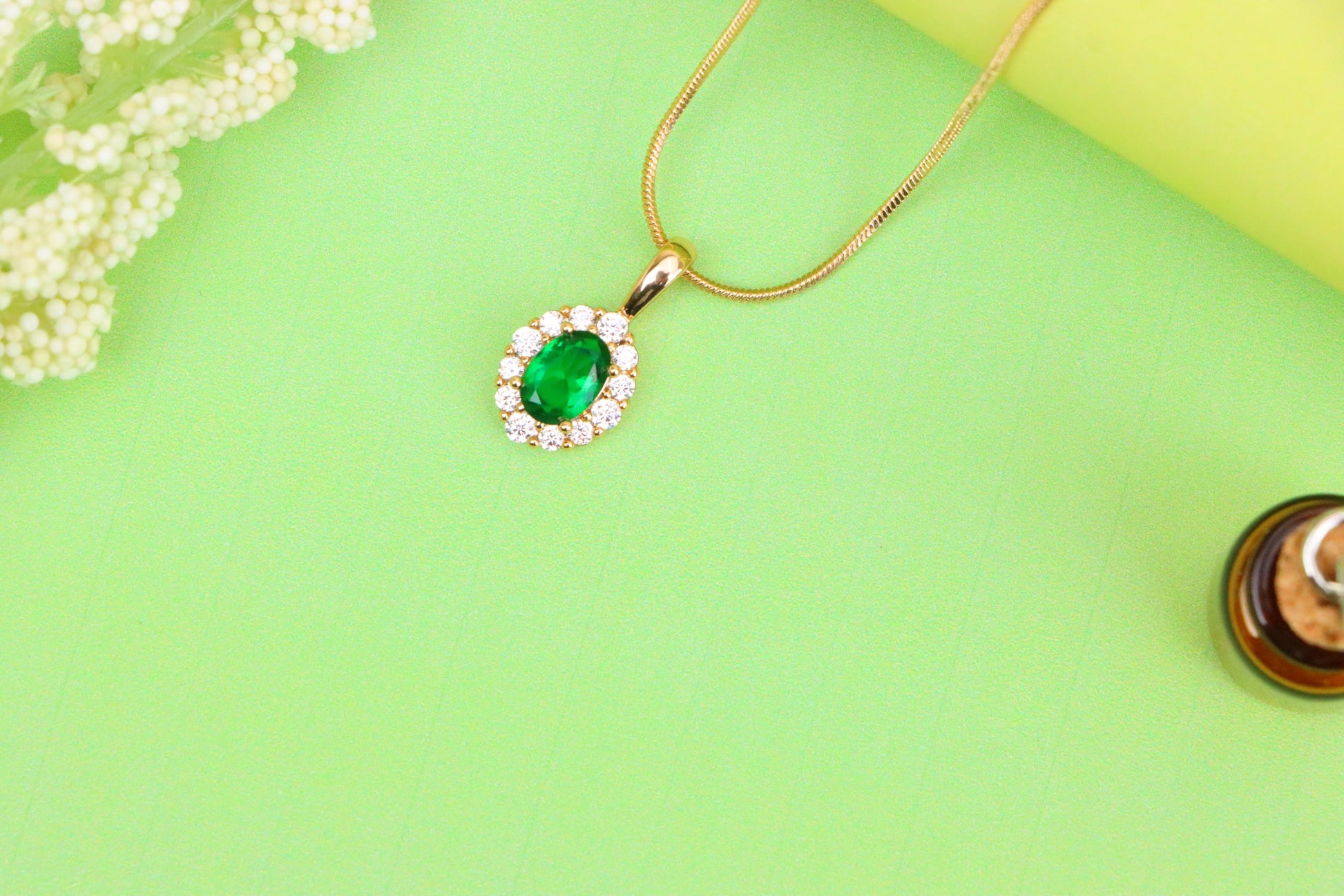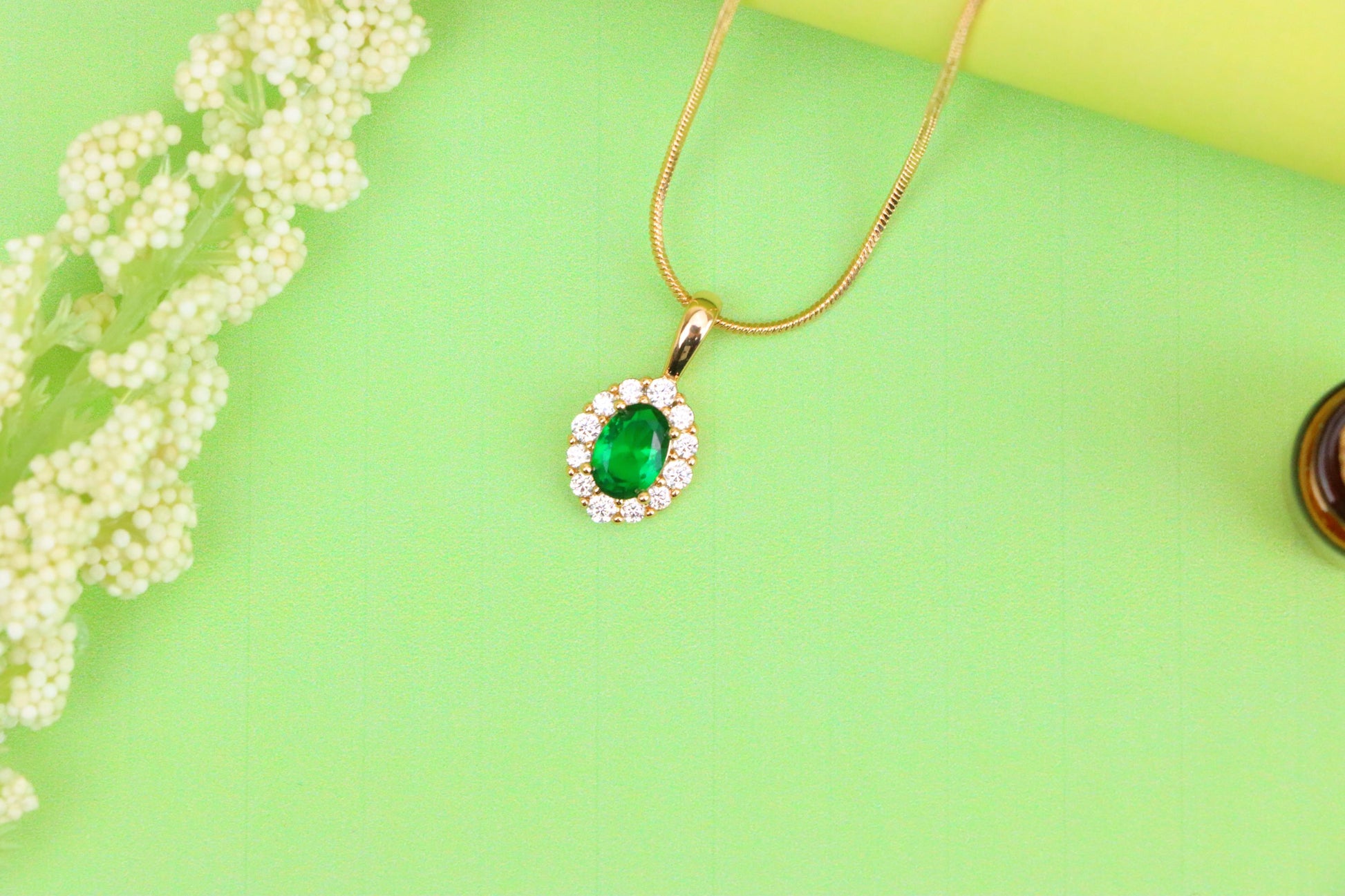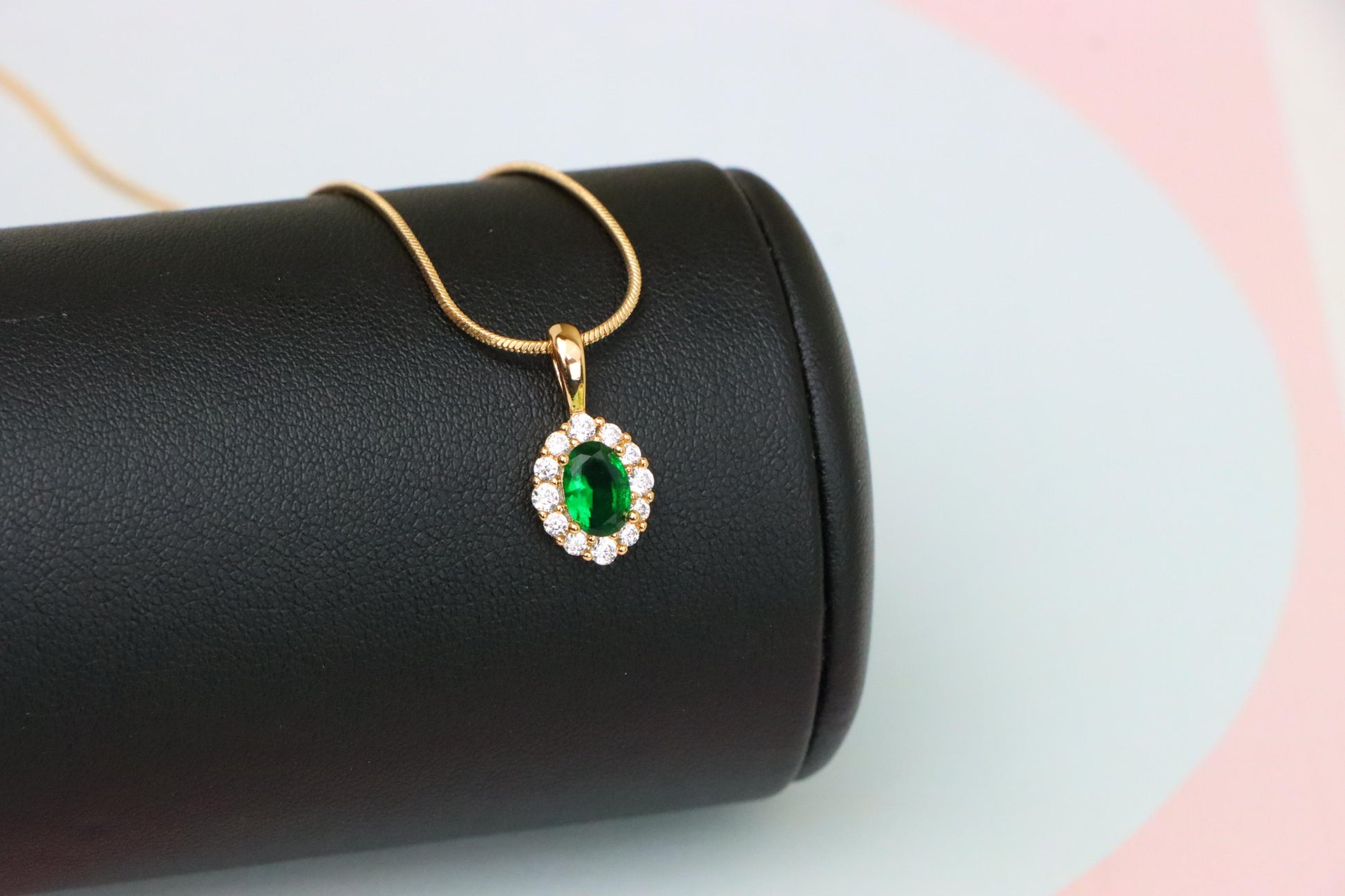 This radiant green pendant features an oval-cut center stone surrounded by a sparkling halo, beautifully set in high-quality gold-plated brass.