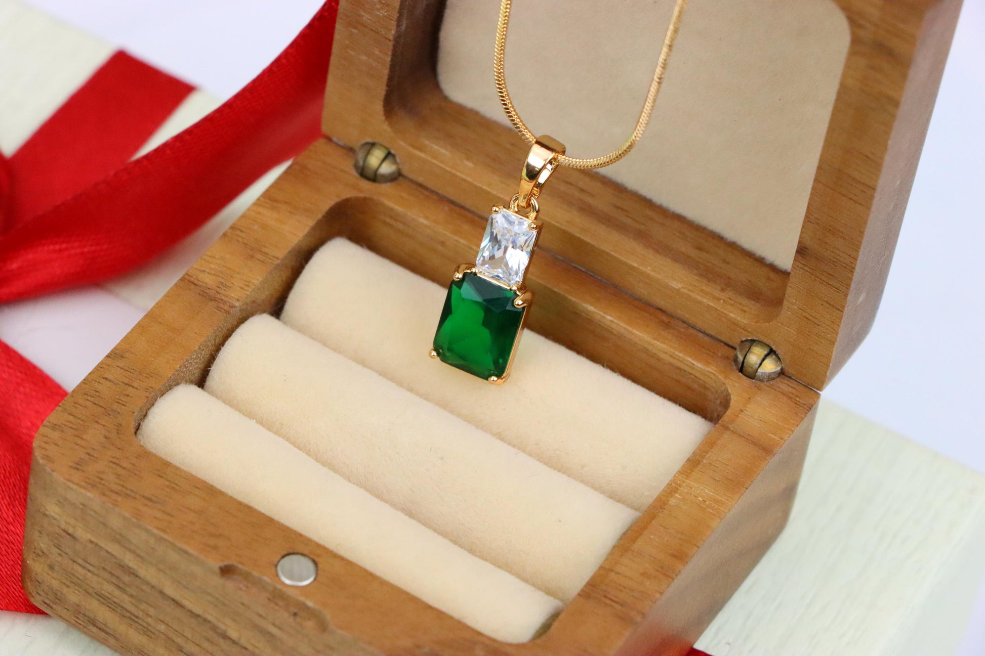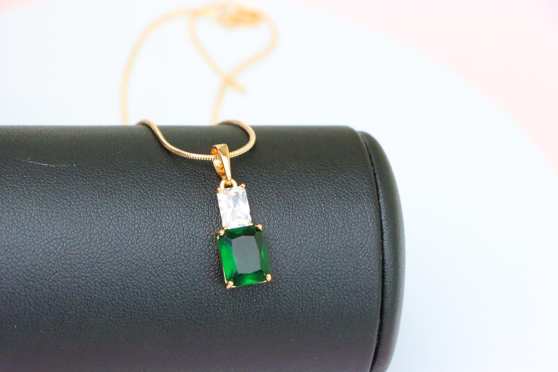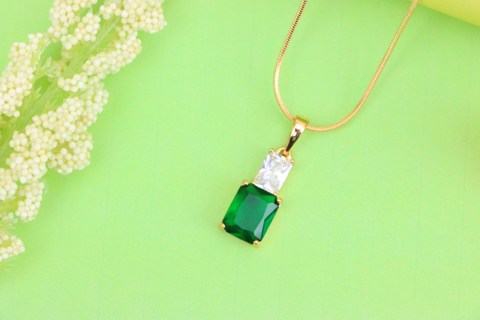 Make a graceful statement with this elegant green pendant featuring a rich emerald-tone stone paired with a clear accent, set in gold-plated high-quality brass.