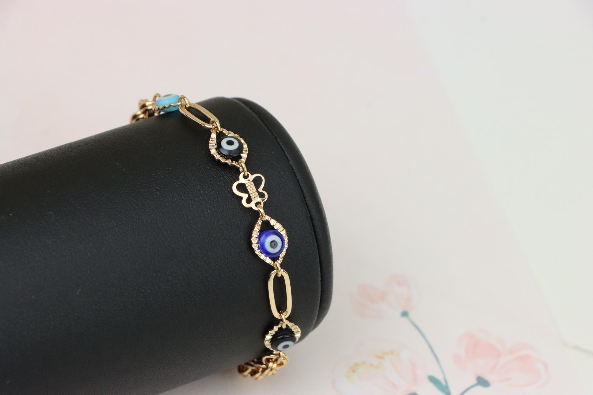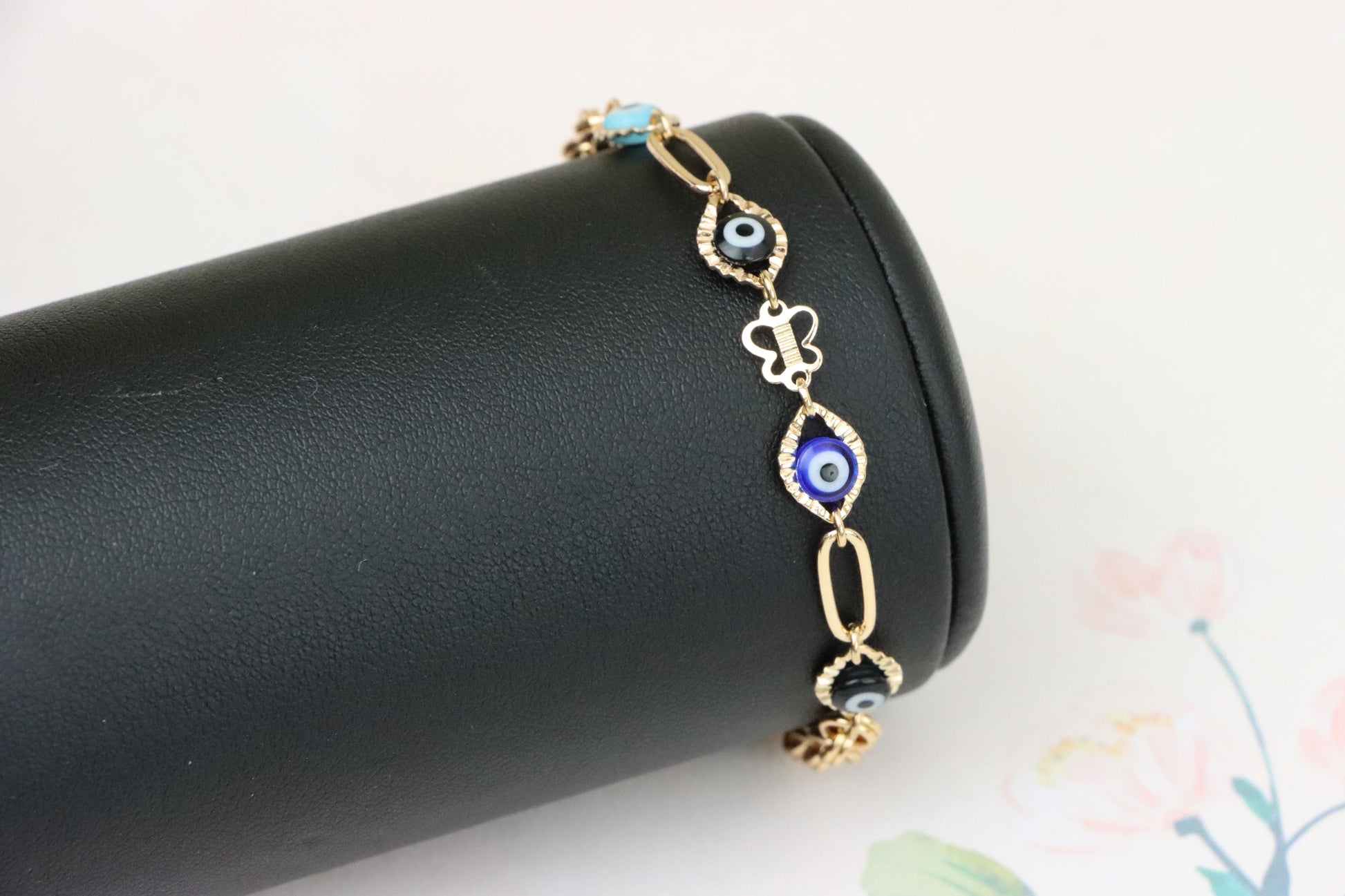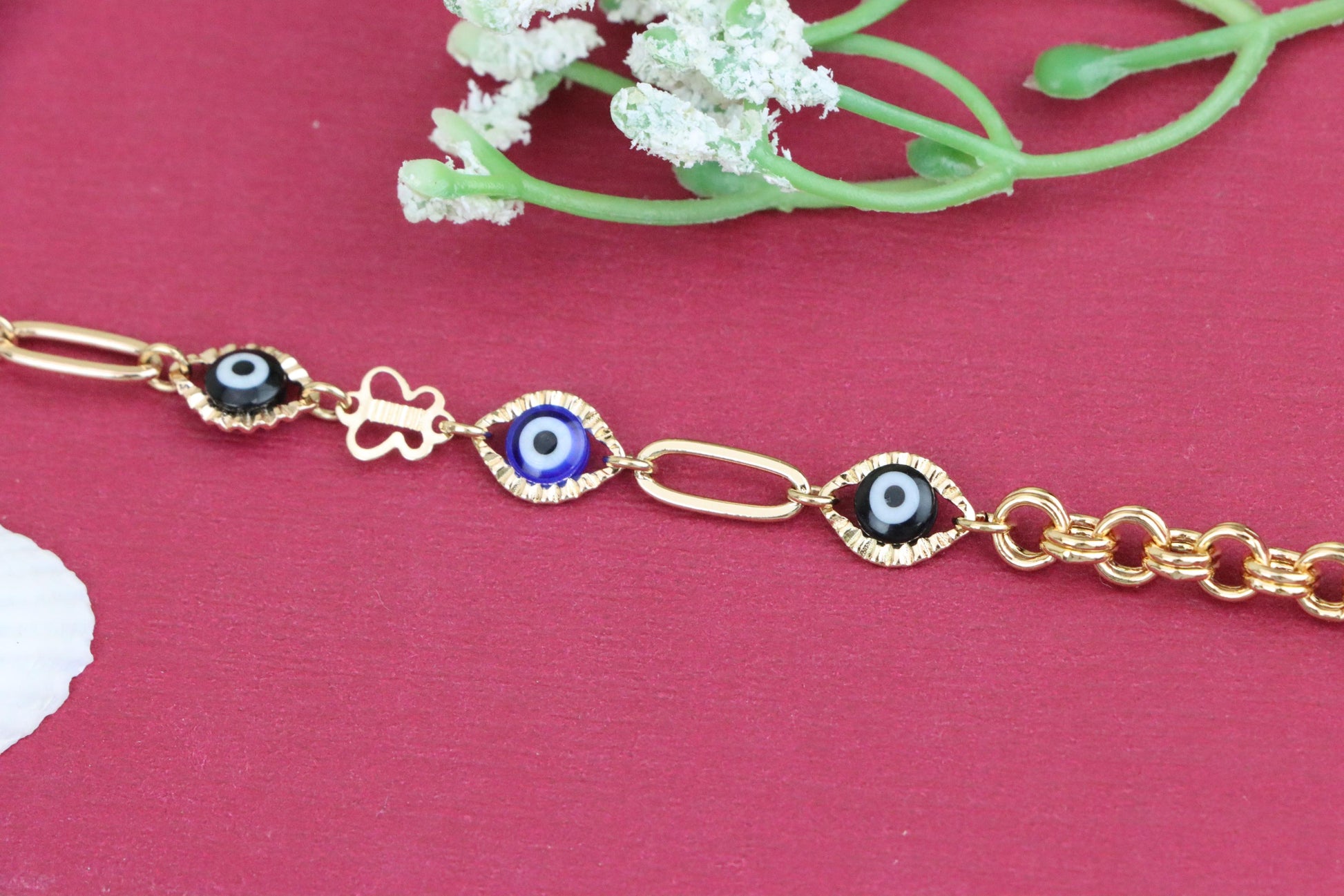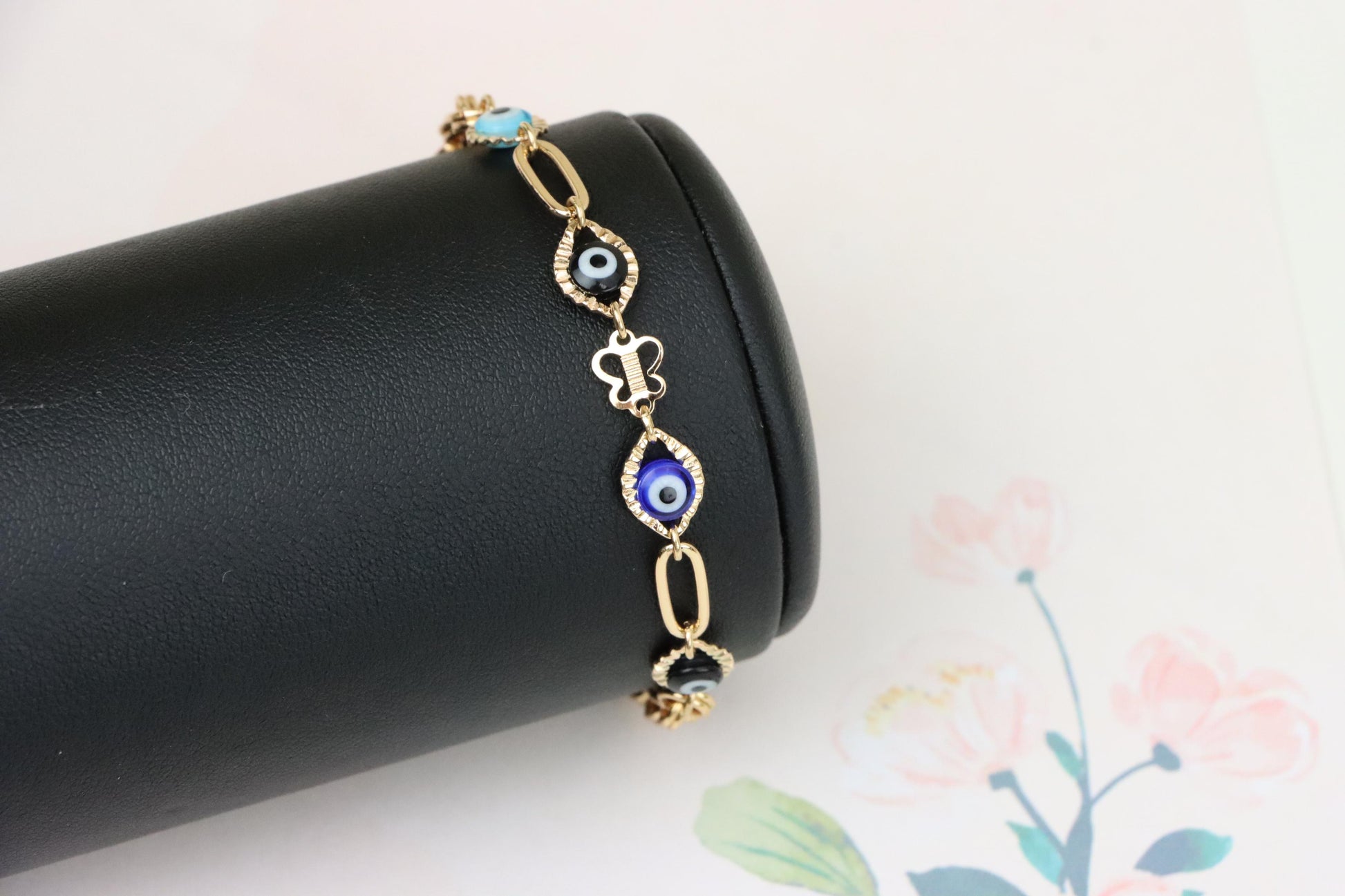 A stylish and symbolic rose gold bracelet featuring protective evil eye charms and a delicate butterfly motif, perfect for everyday wear or gifting.