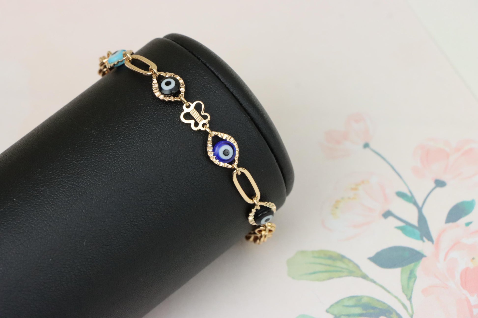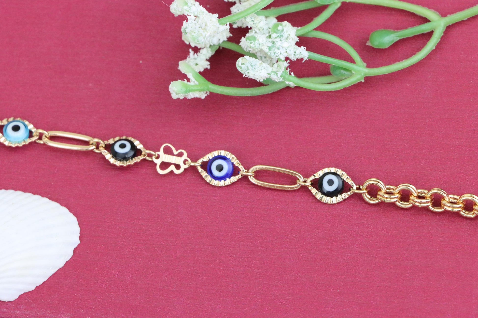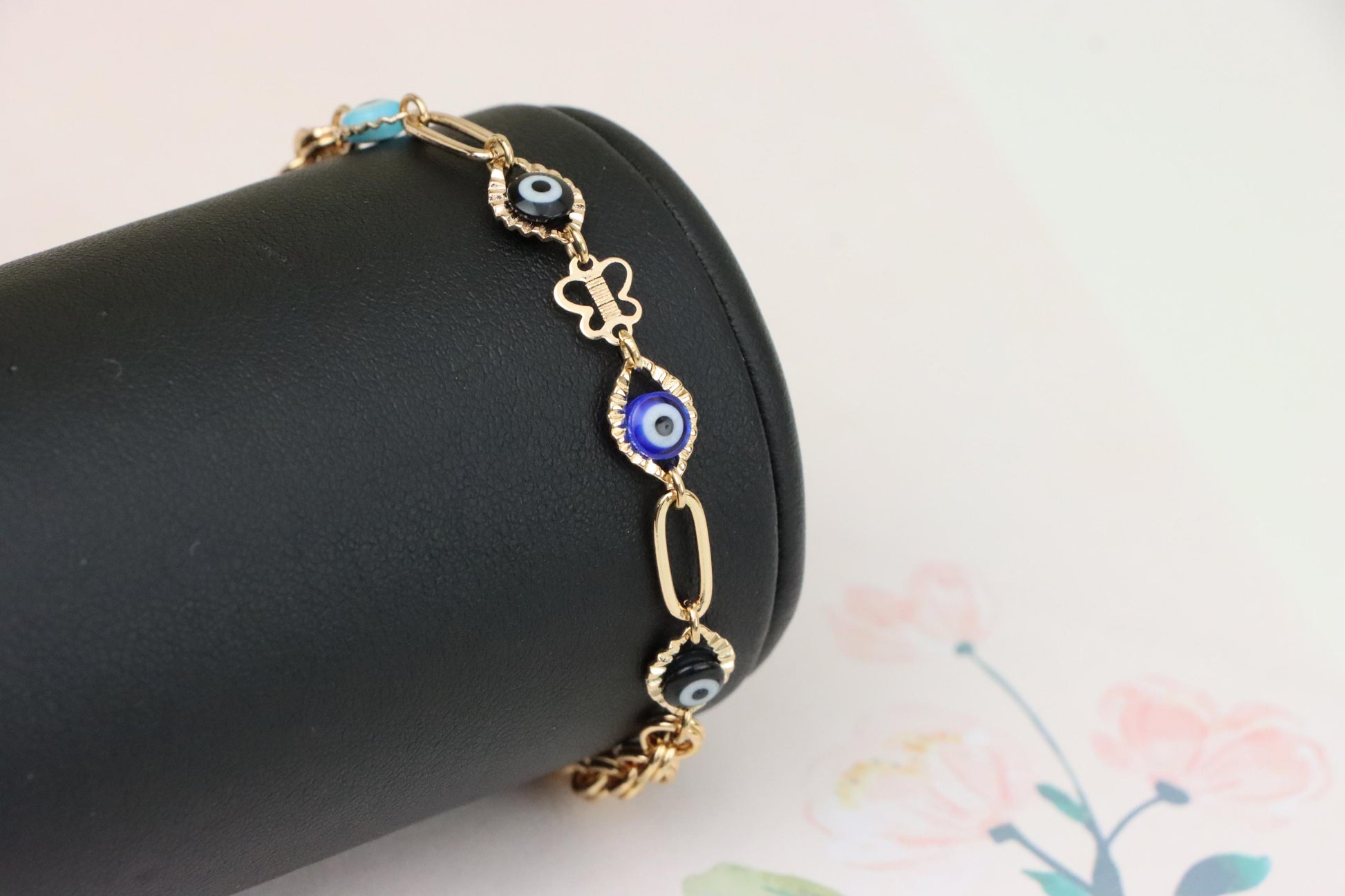 A stylish and symbolic rose gold bracelet featuring protective evil eye charms and a delicate butterfly motif, perfect for everyday wear or gifting.