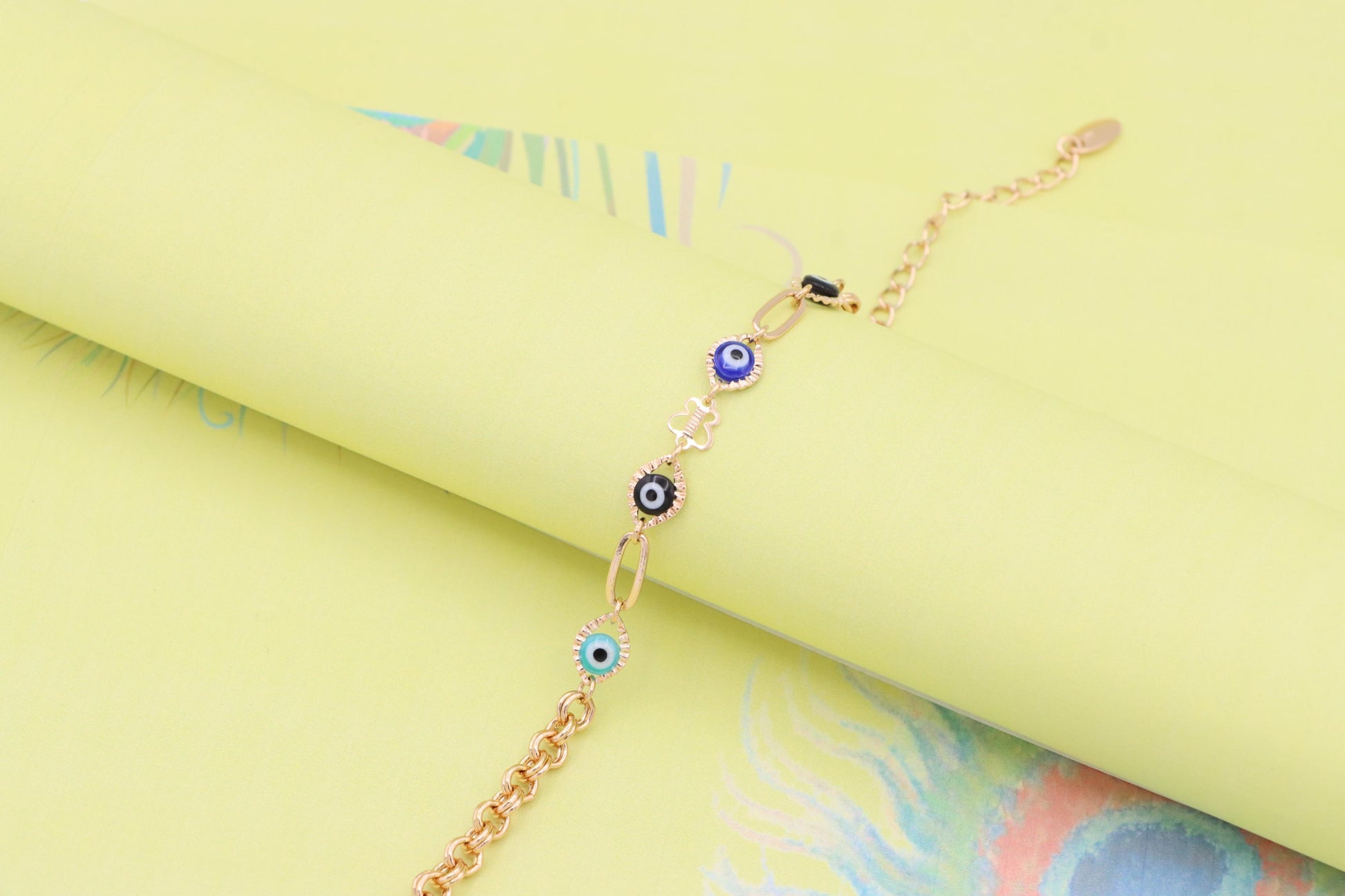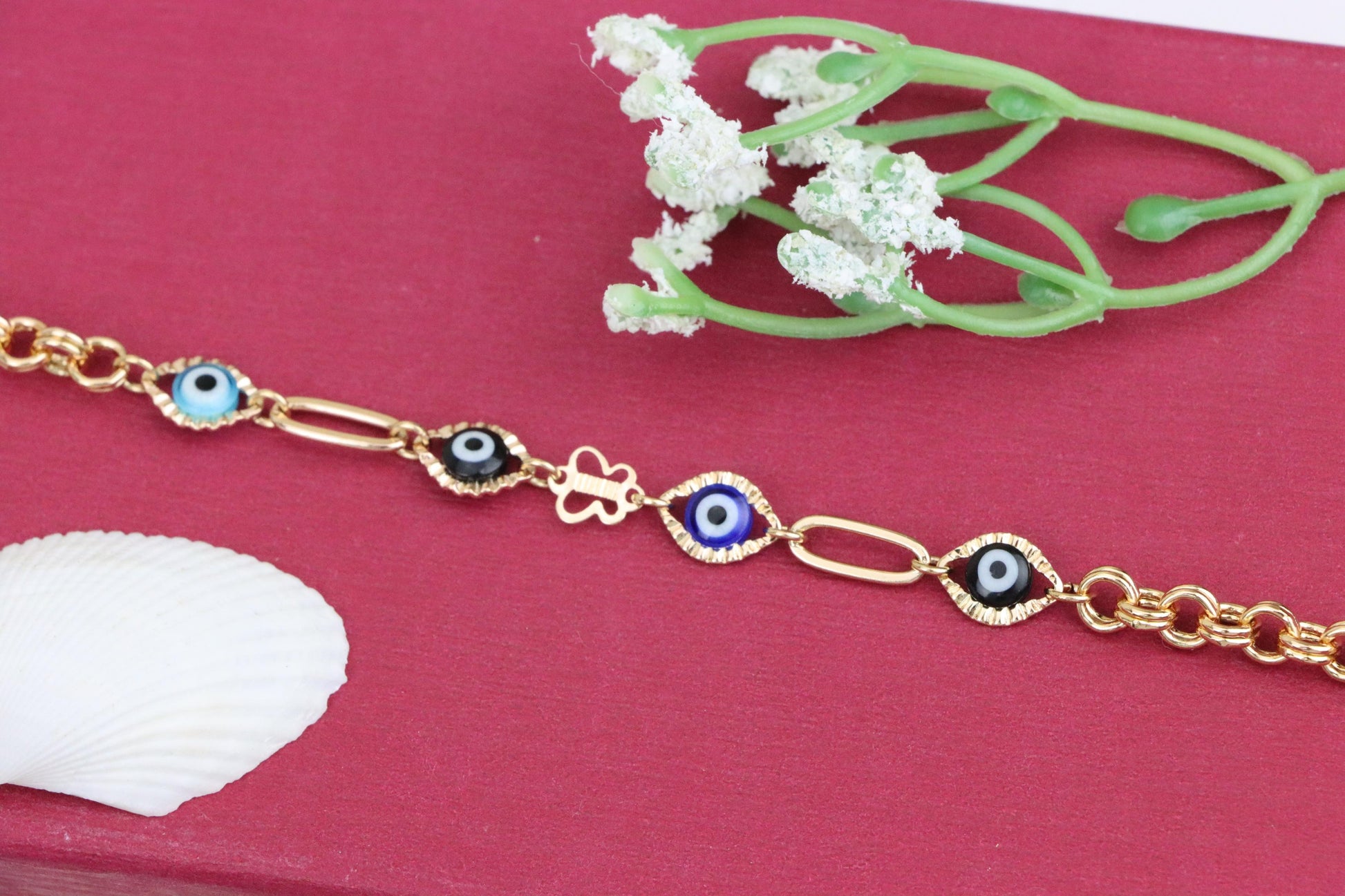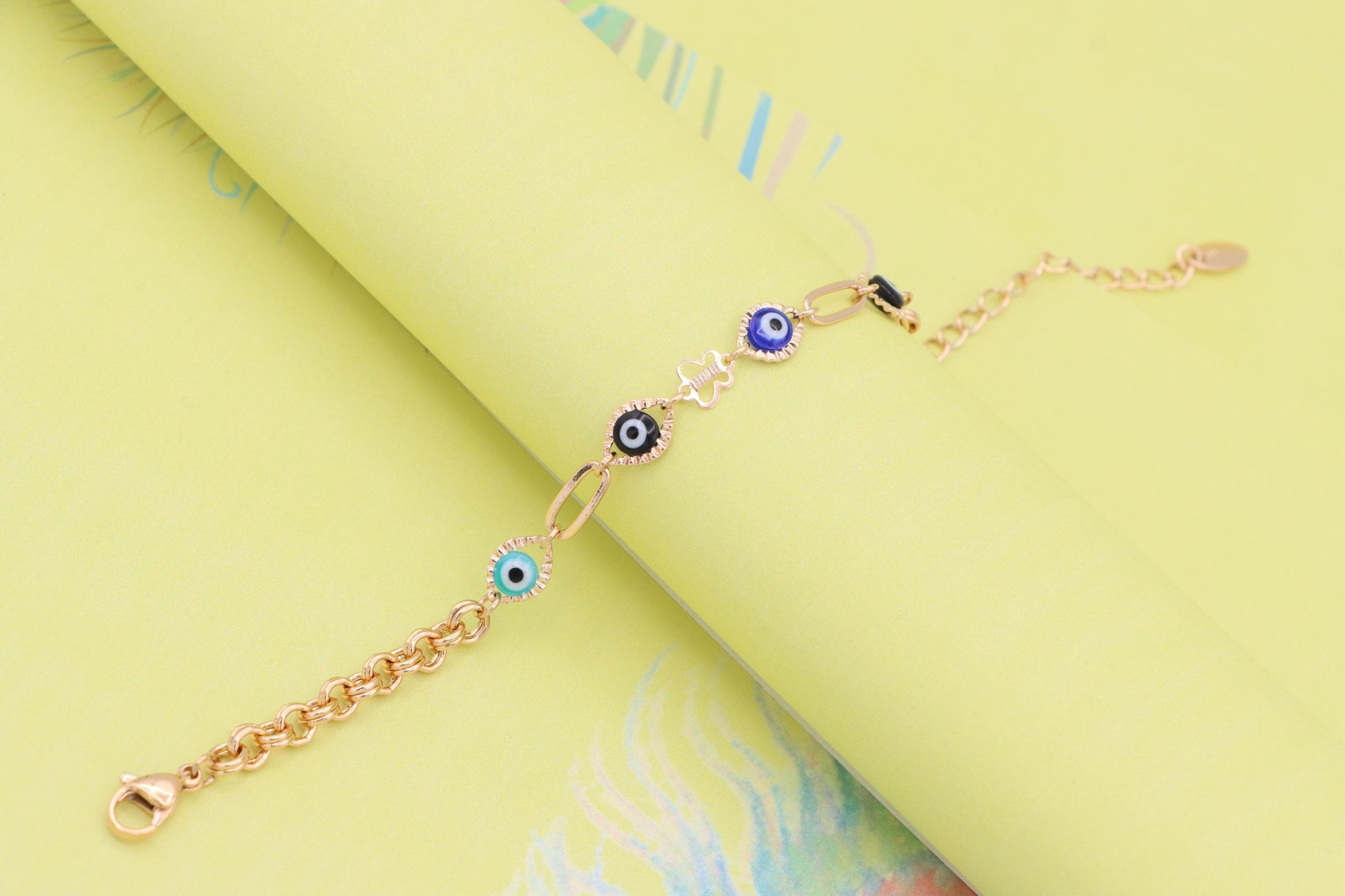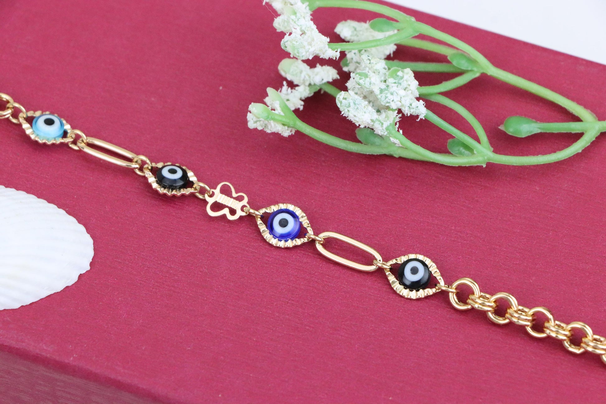 A stylish and symbolic rose gold bracelet featuring protective evil eye charms and a delicate butterfly motif, perfect for everyday wear or gifting.