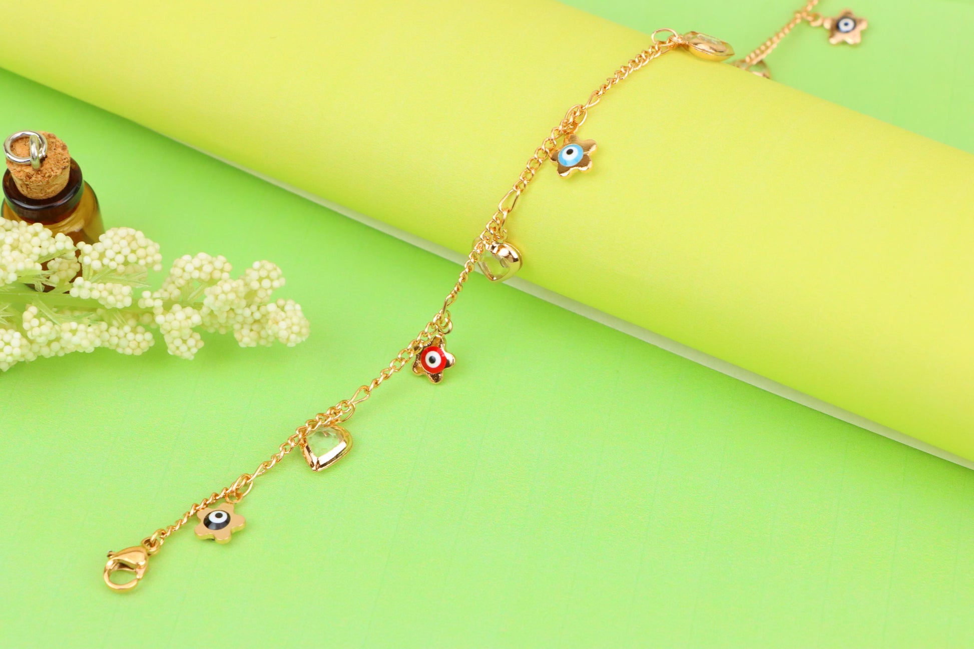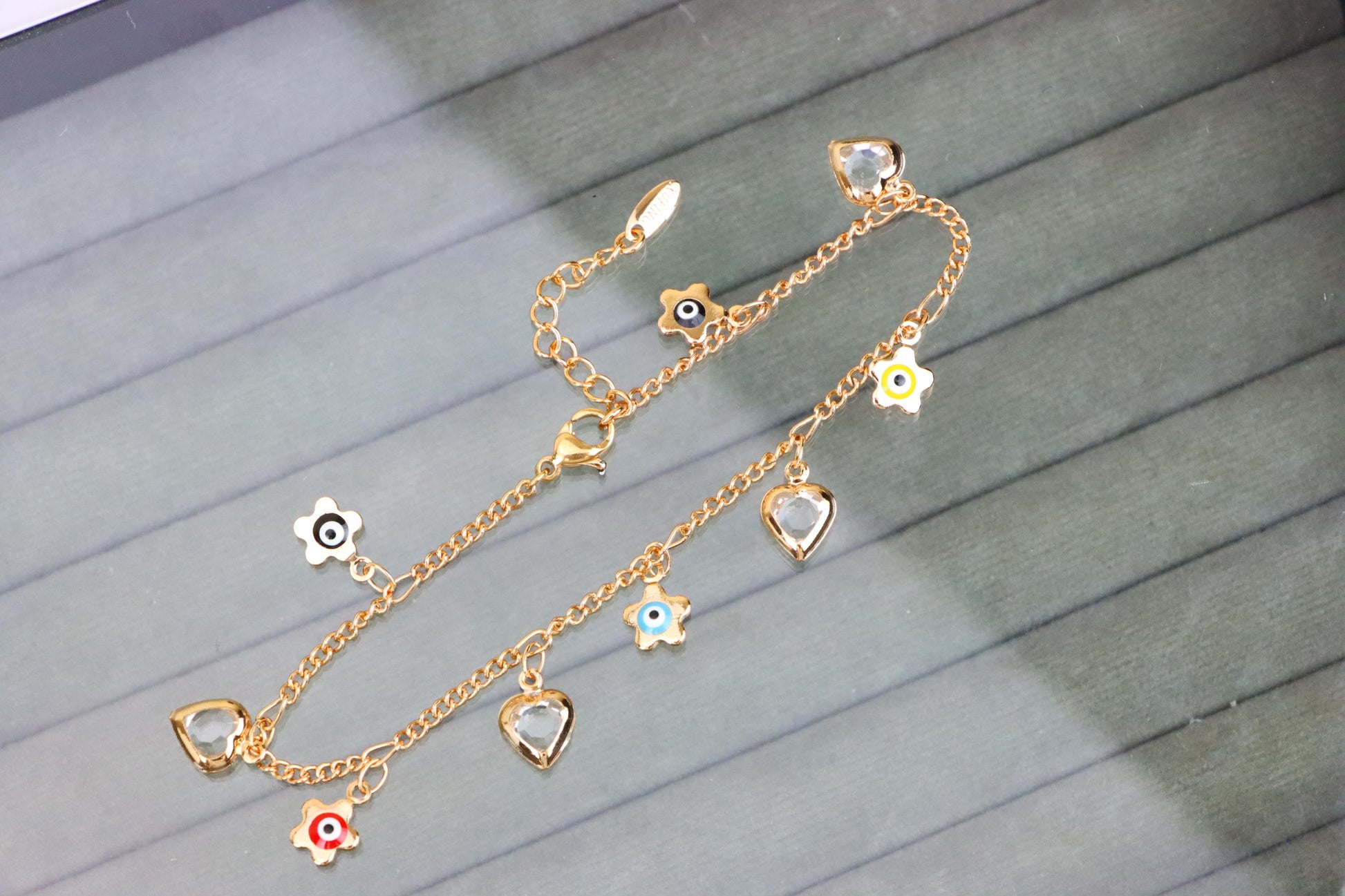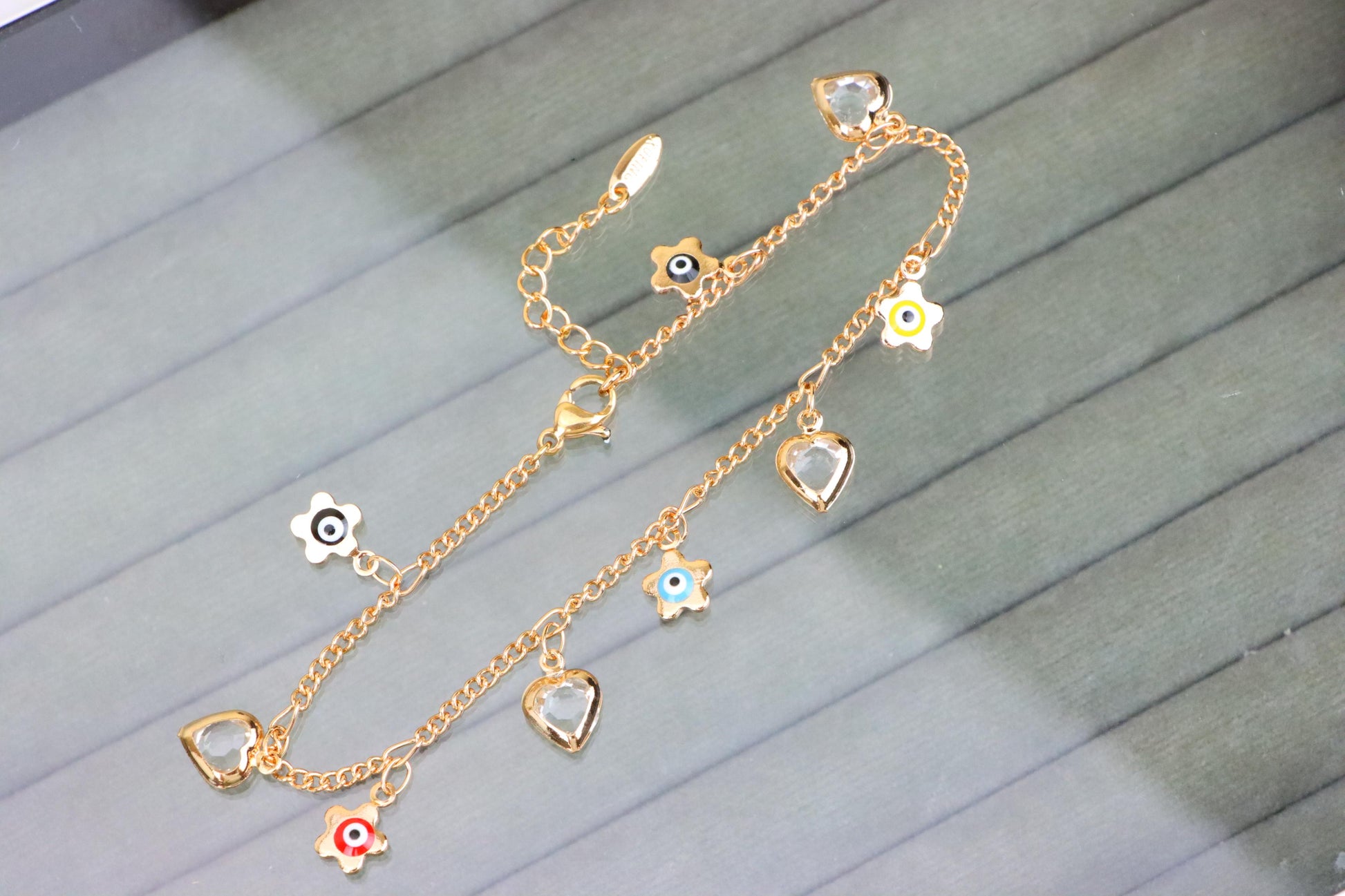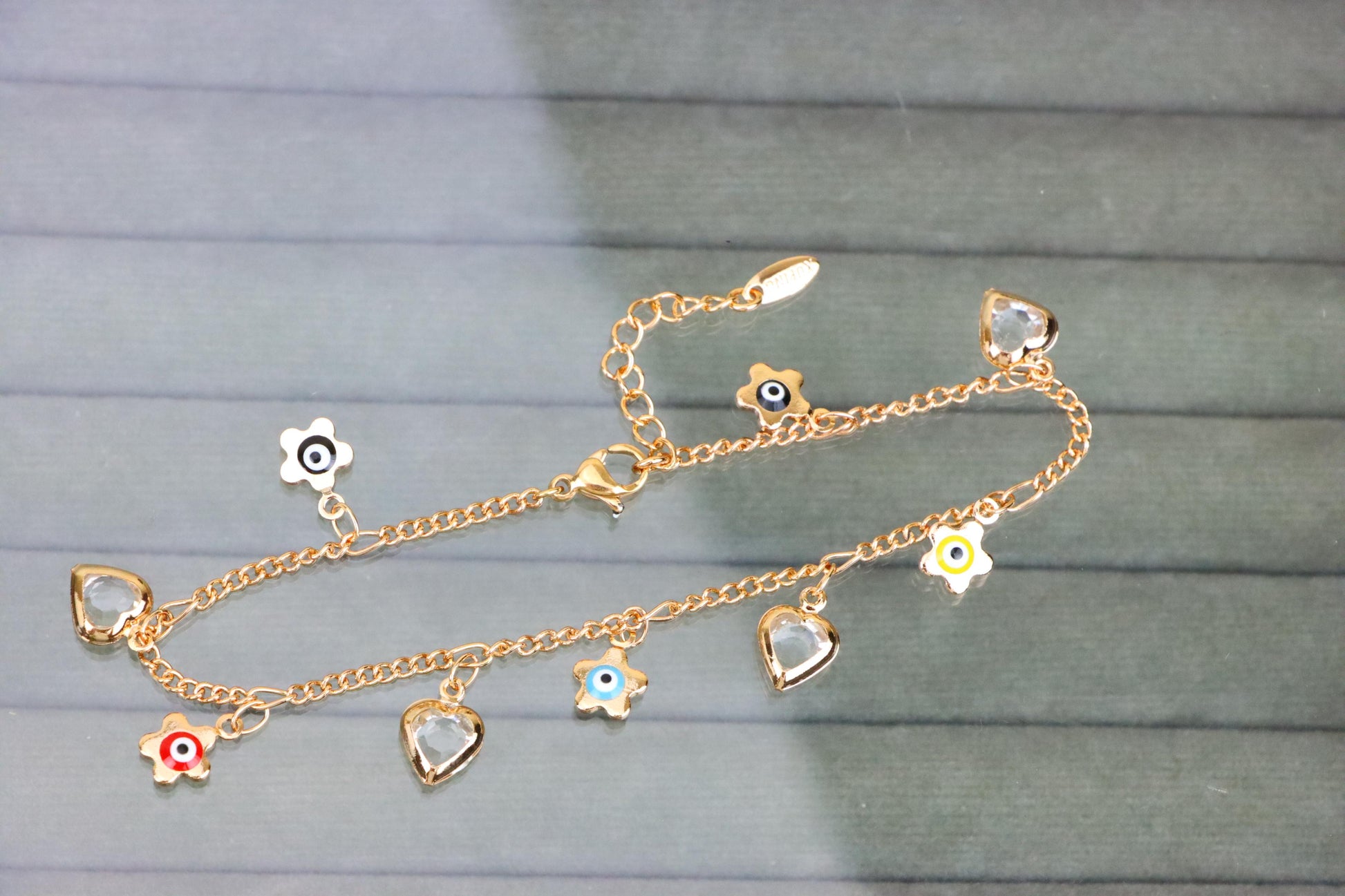 ✔ Features vibrant evil eye flower charms with heart pendants