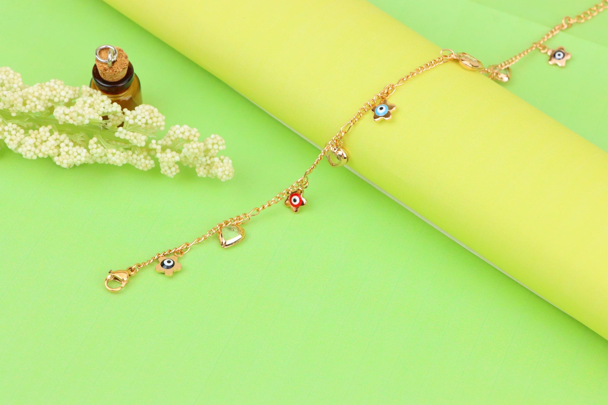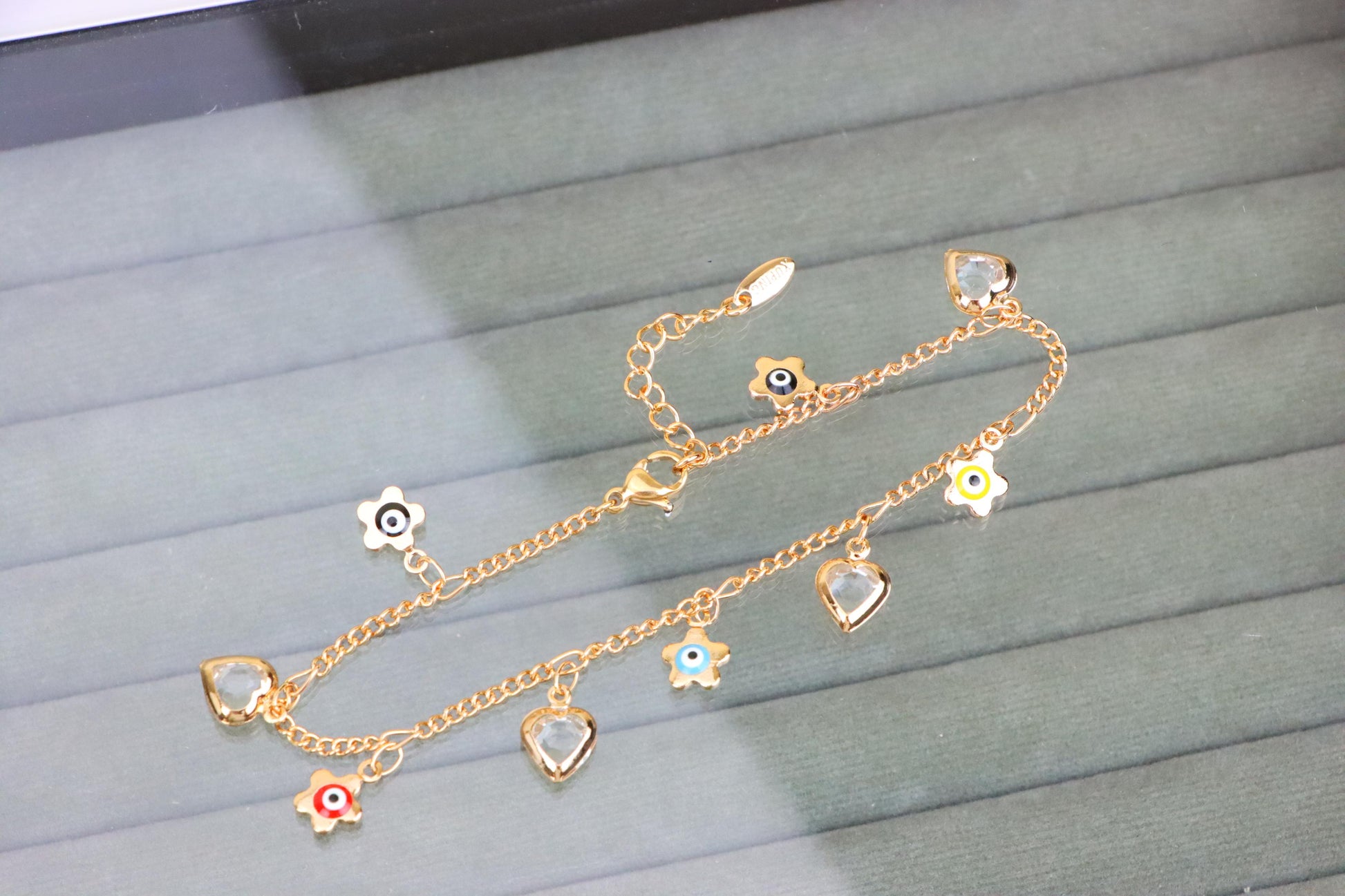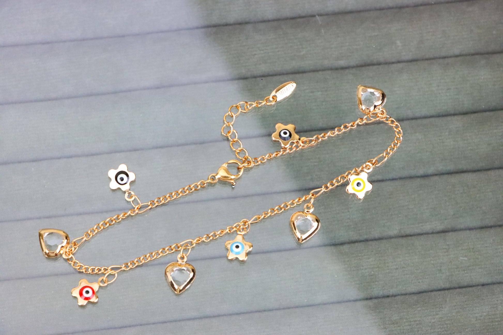 ✔ Features vibrant evil eye flower charms with heart pendants